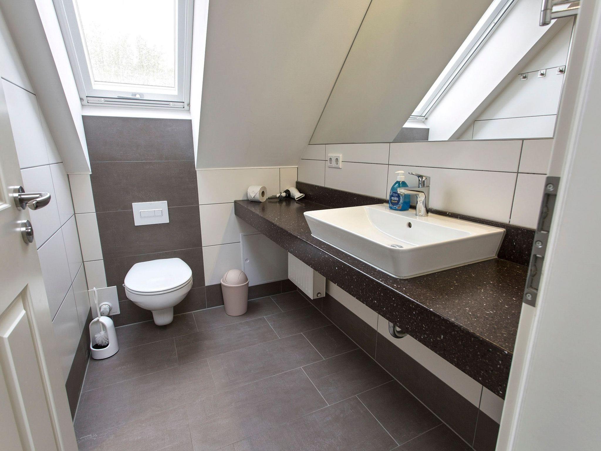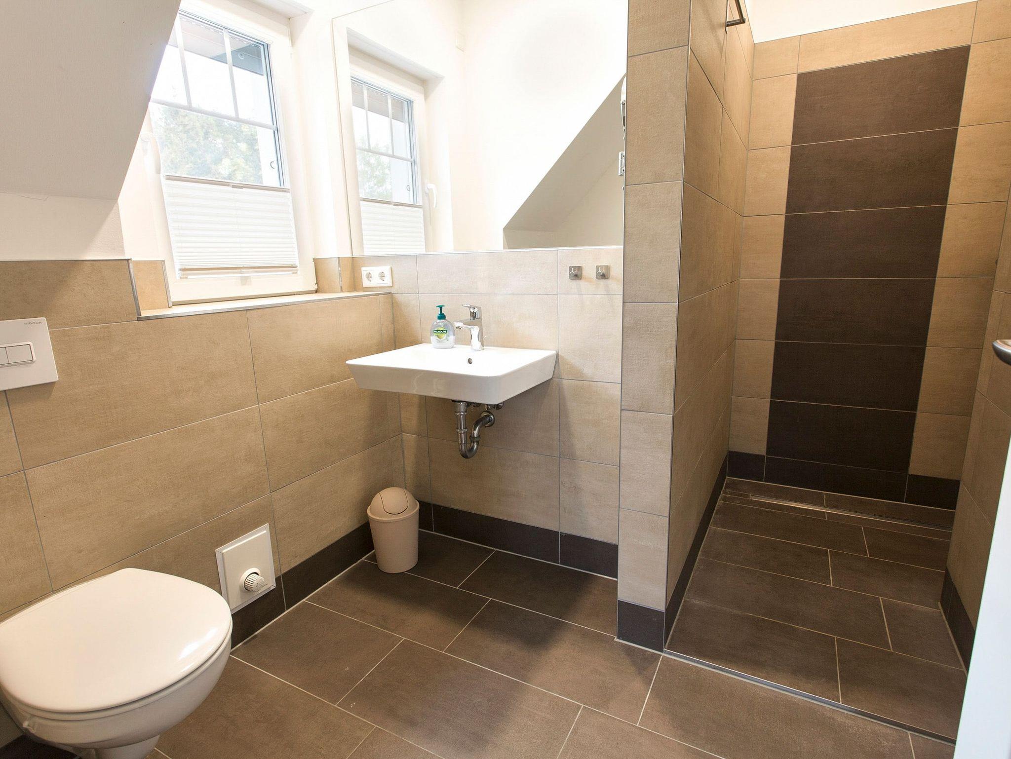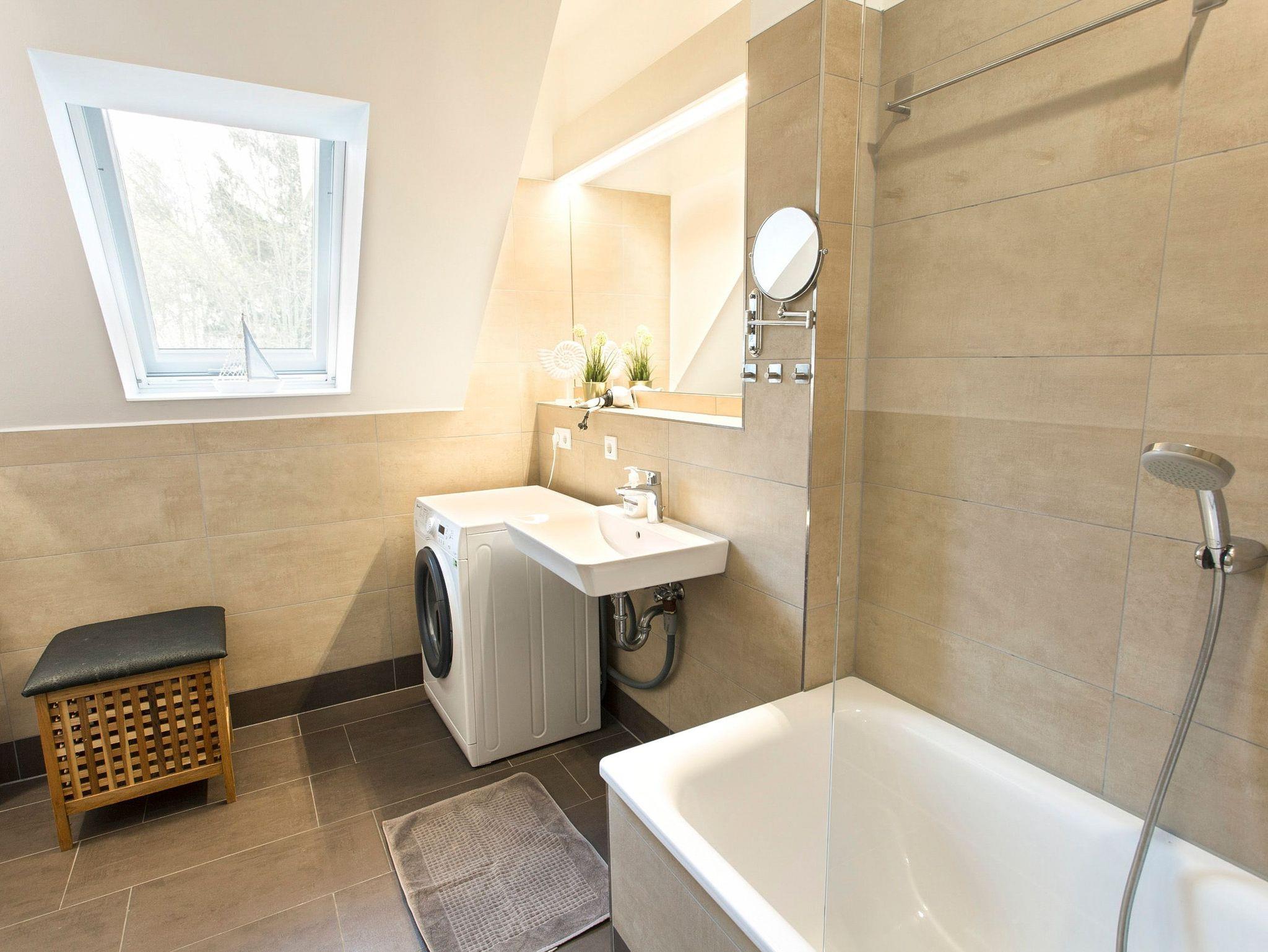 Ein Badezimmer ist mit Badewanne, Waschtrockner, Föhn und WC ausgestattet, die anderen beiden Bäder mit Dusche (teilweise ebenerdig), Föhn und WC.