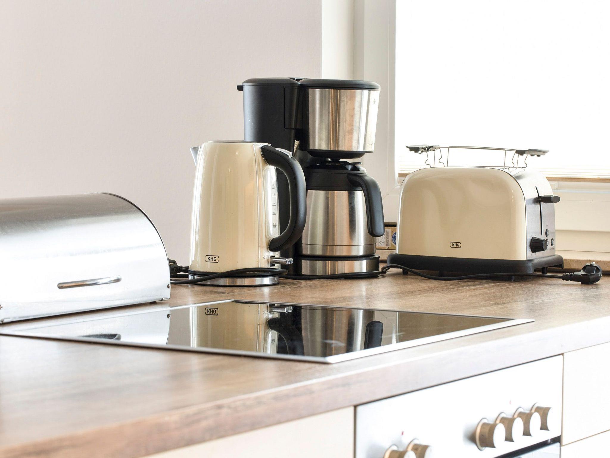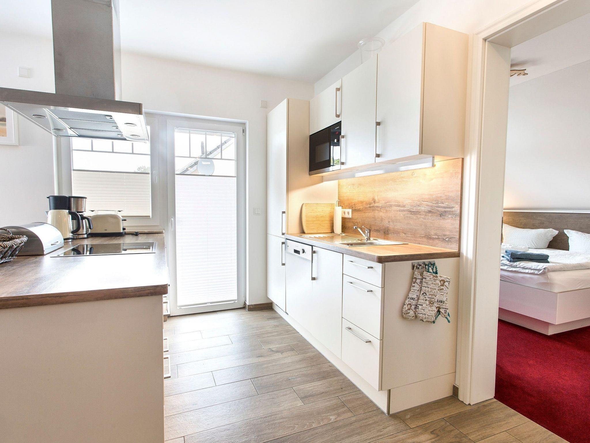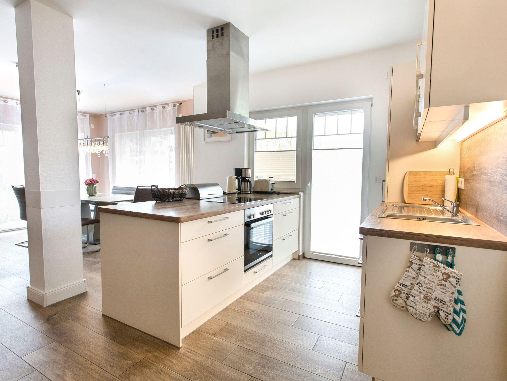 Im großzügigen Wohnbereich erwarten Sie eine gemütliche Wohnlandschaft, Kamin, Smart-TV, eine offen gestaltete Küche sowie ein großer Esstisch. Die Küche ist umfangreich ausgestattet mit Kühlschrank, Gefrierschrank, Ceran-Kochfeld, Backofen, Spülmaschine, Mikrowelle, Kaffeemaschine, Wasserkocher, Toaster und alle den kleinen Dingen des täglichen Bedarfs. Weiterhin befindet sich an den Küchenbereich angeschlossen ein kleiner Balkon.