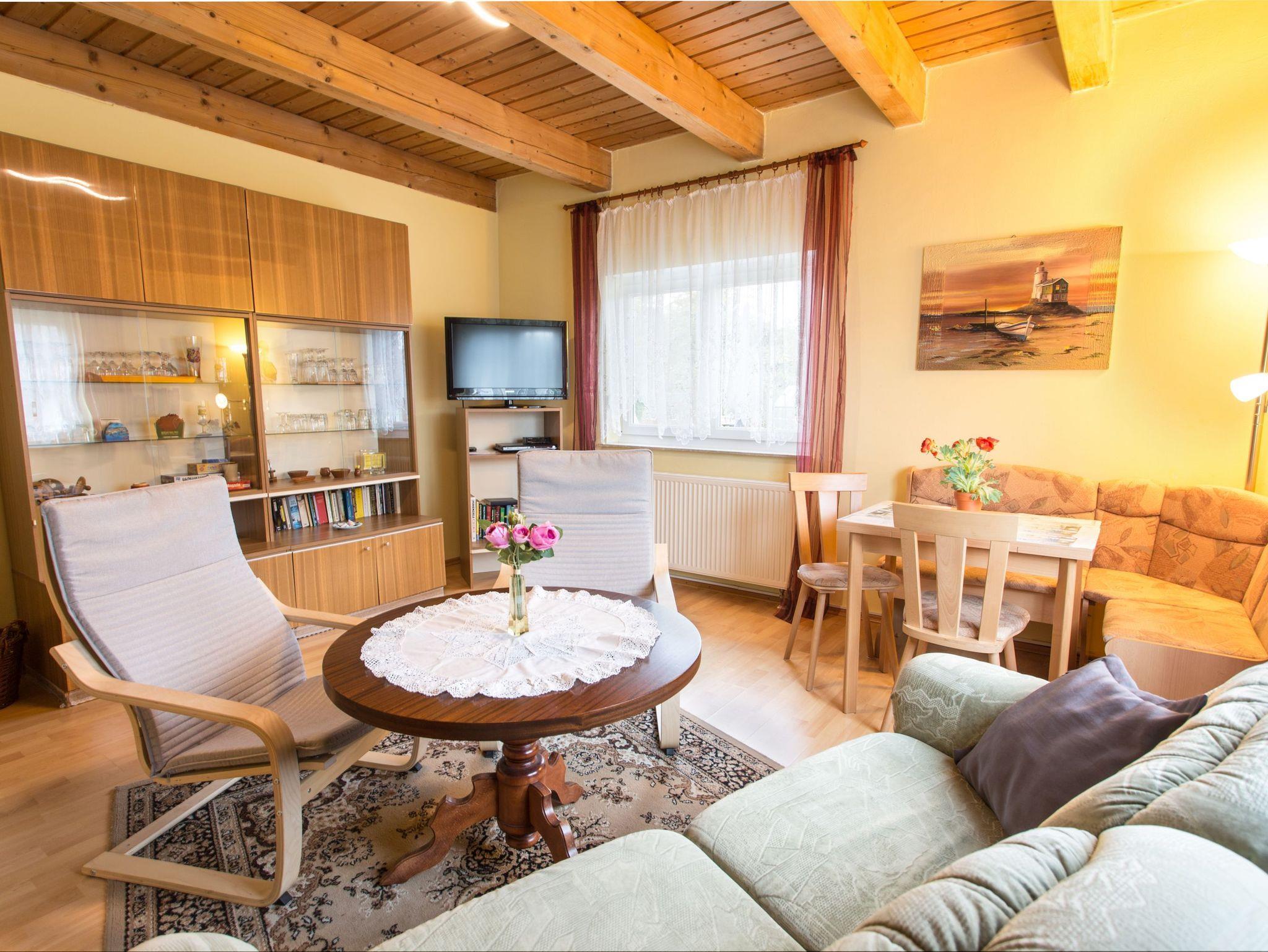 Zur Verfügung steht eine Nichtraucherferienwohnung für 4 Personen mit 48 qm über 2 Etagen. Im Erdgeschoss befinden sich das geräumige Wohnzimmer mit Kaminofen (Aufbettung möglich) sowie die voll ausgestattete Küche und Dusche/WC. Das Schlafzimmer mit Doppelbett befindet sich in der 1. Etage.