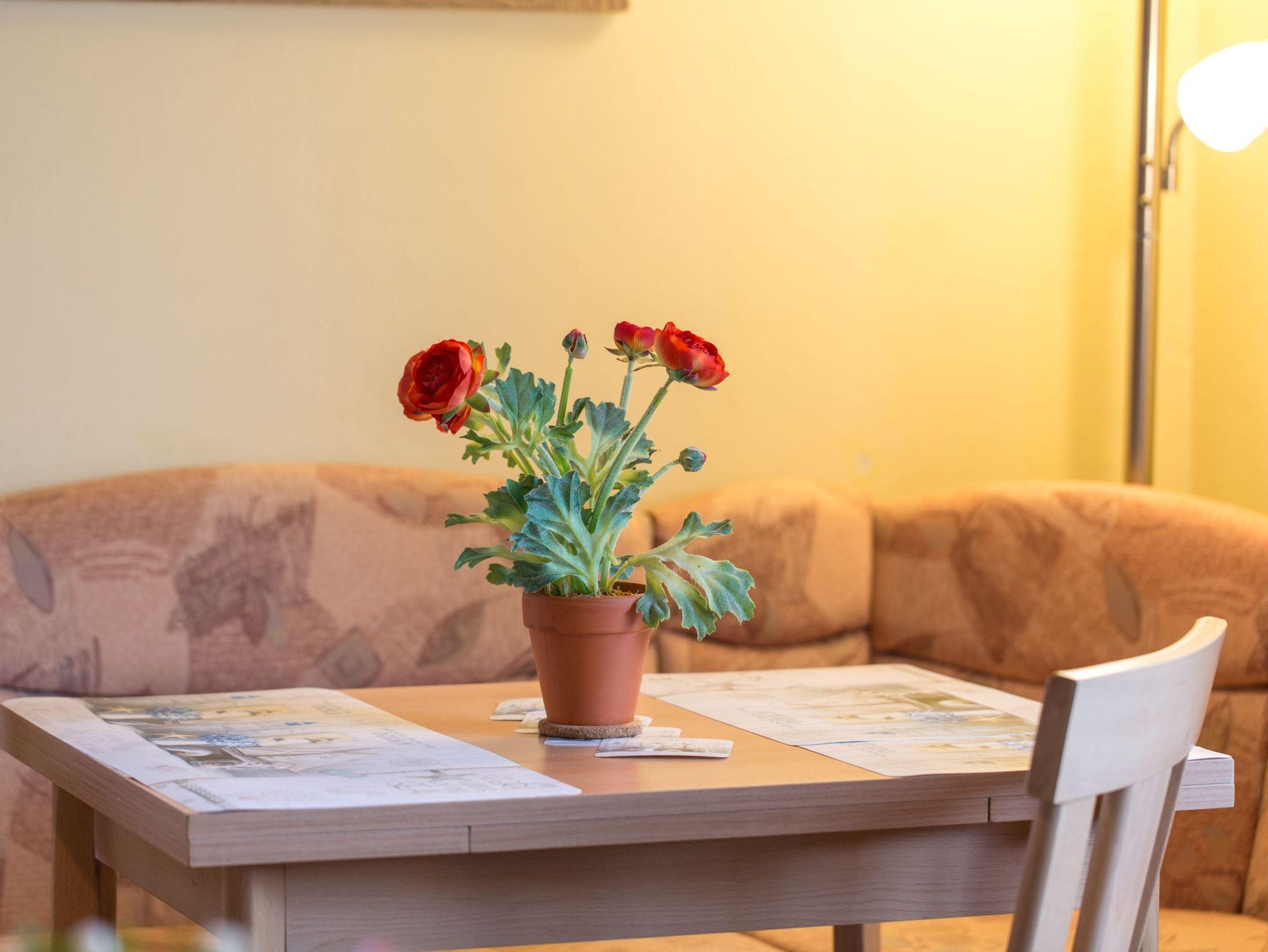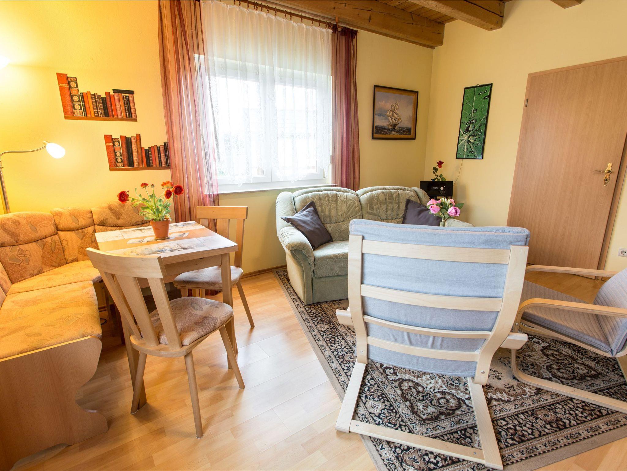 Zur Verfügung steht eine Nichtraucherferienwohnung für 2 Personen mit 48 qm über 2 Etagen. Im Erdgeschoss befinden sich das geräumige Wohnzimmer mit Kaminofen (Aufbettung möglich) sowie die voll ausgestattete Küche und Dusche/WC. Das Schlafzimmer mit Doppelbett befindet sich in der 1. Etage.