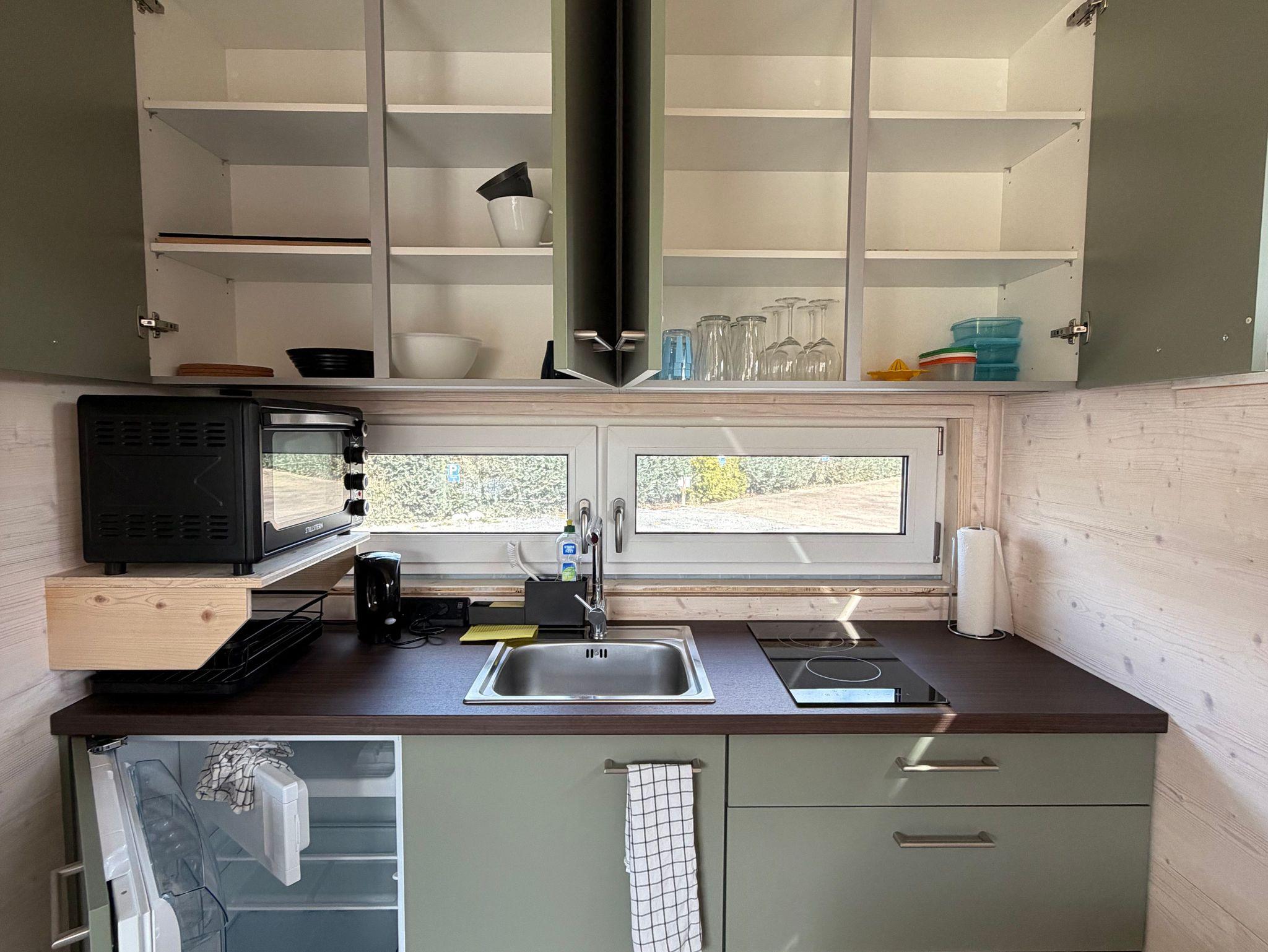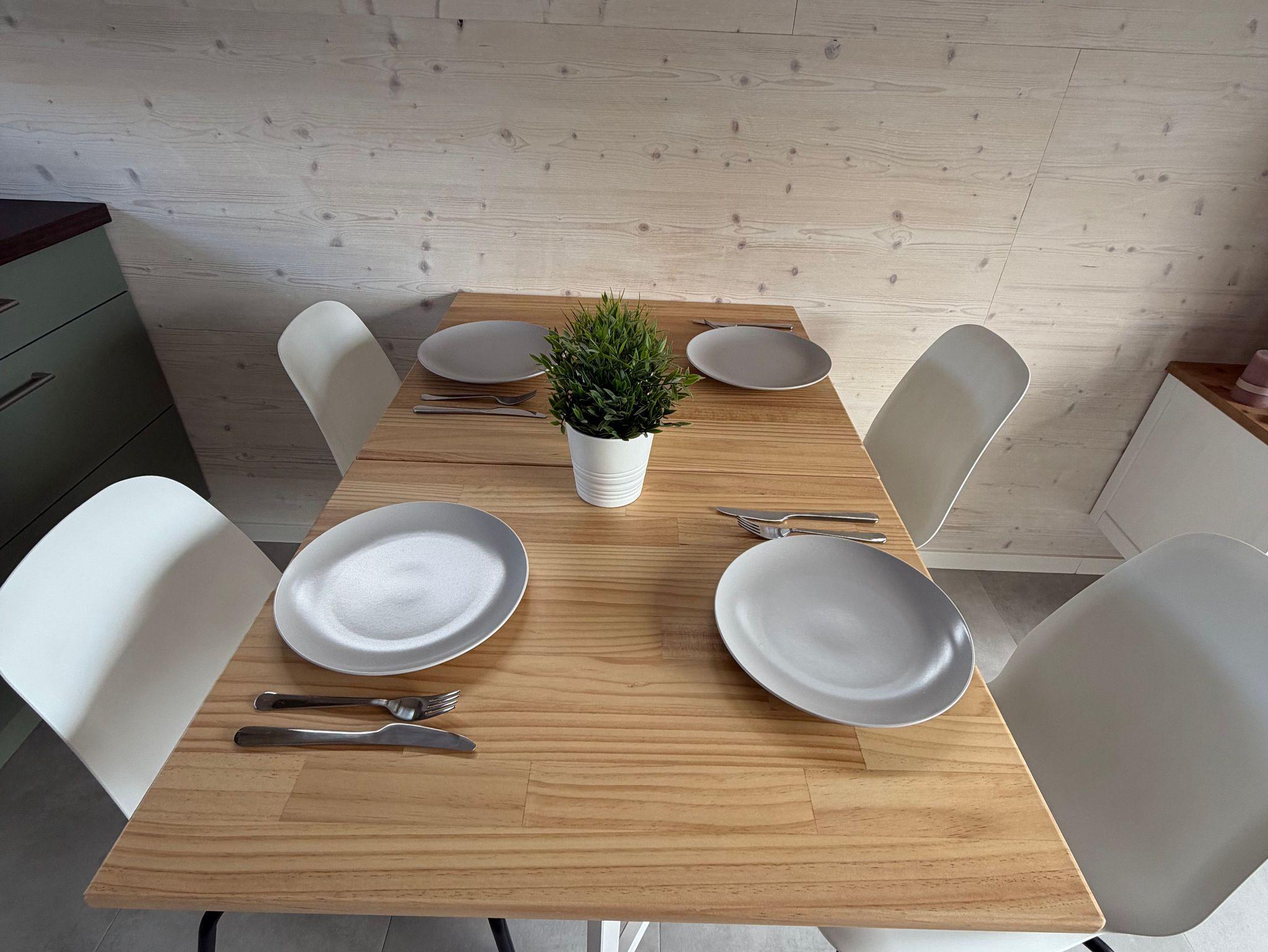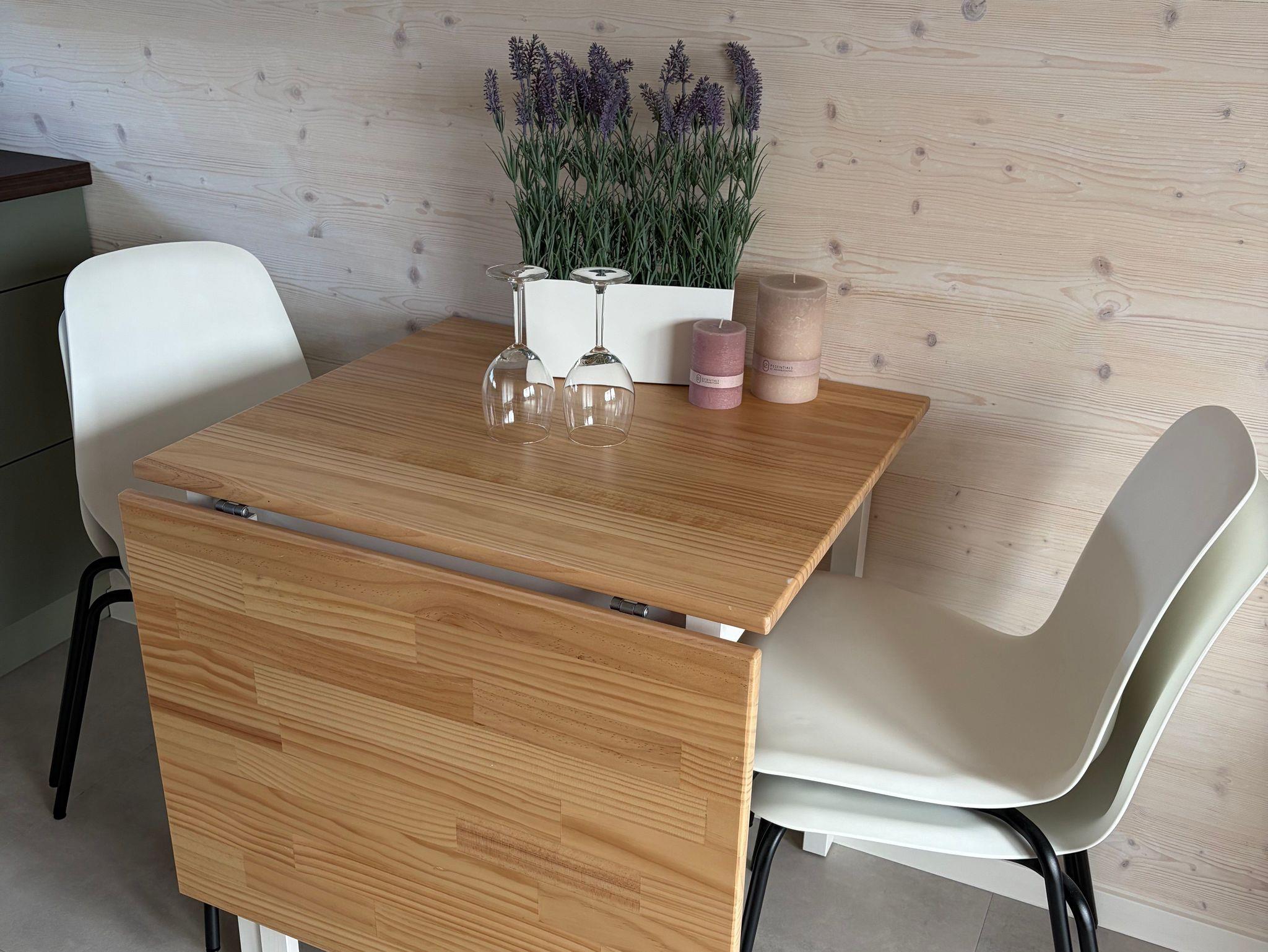 Die moderne Küchenzeile ist mit einem 2-Platten-Ceranfeld, kleinem Backofen, Wasserkocher, Kaffeemaschine und Kühlschrank ausgestattet. Am praktischen Esstisch finden bis zu vier Personen Platz. Die Küche ist vollständig ausgestattet, sodass Sie sich bequem selbst versorgen können.