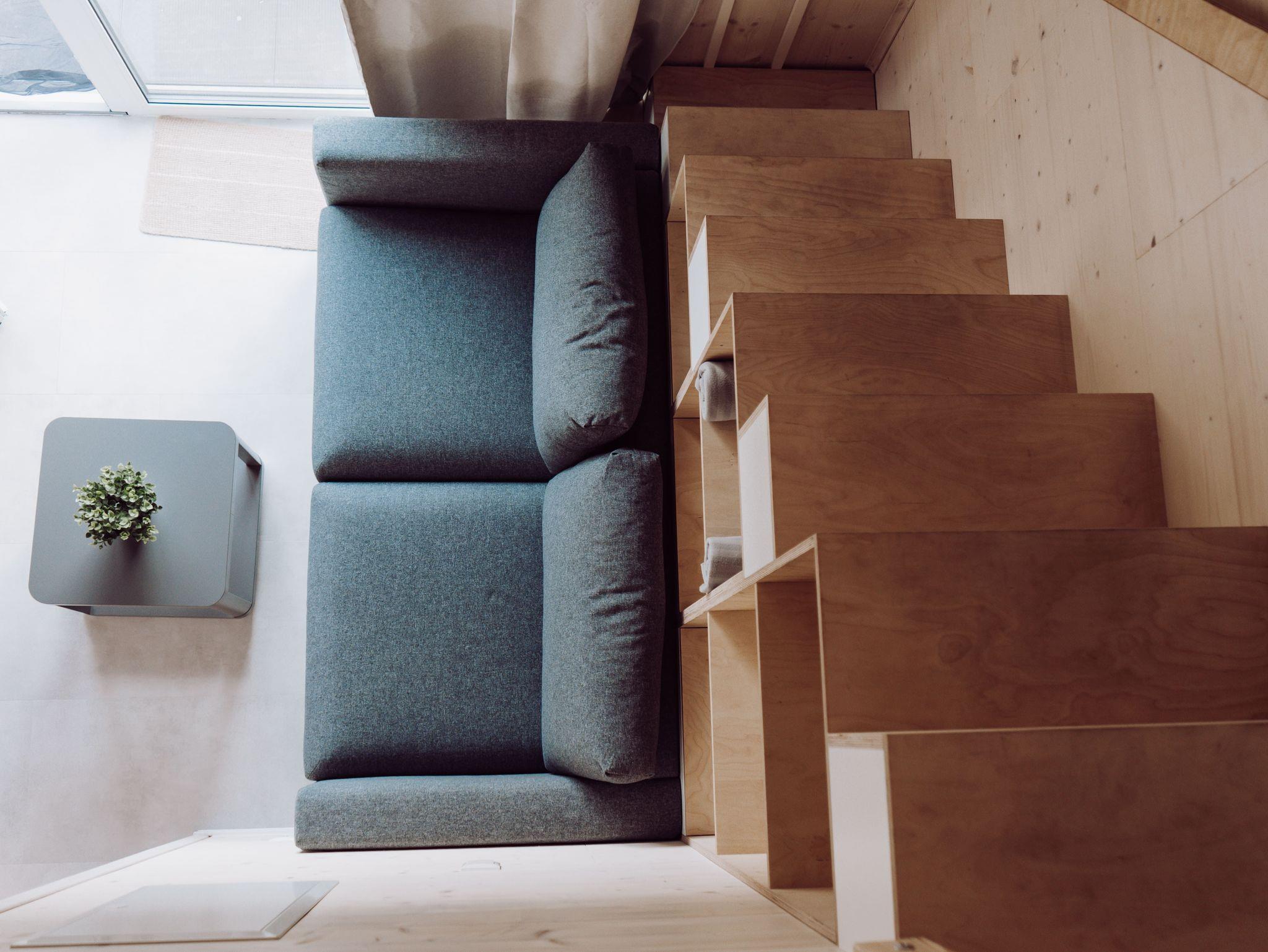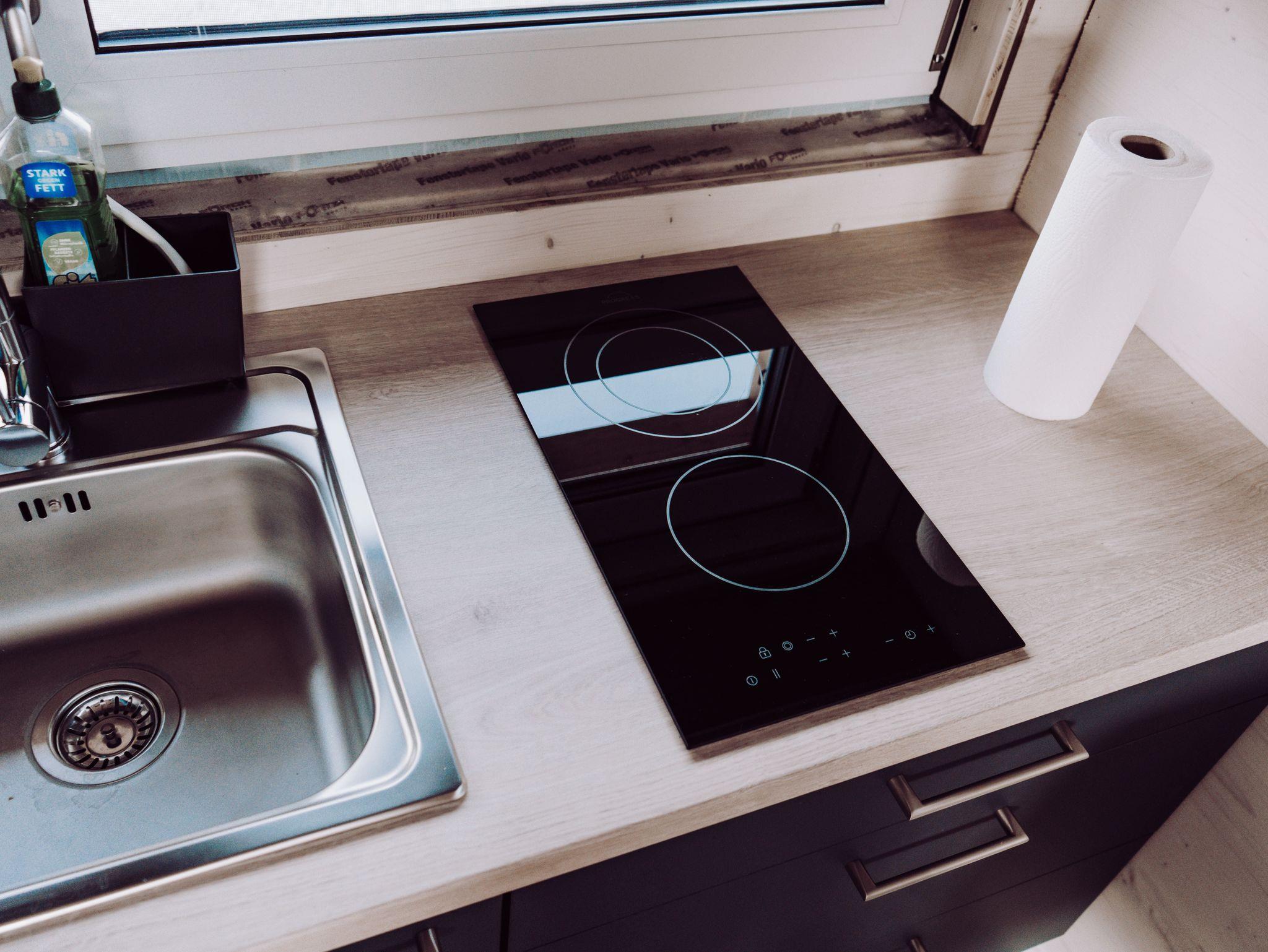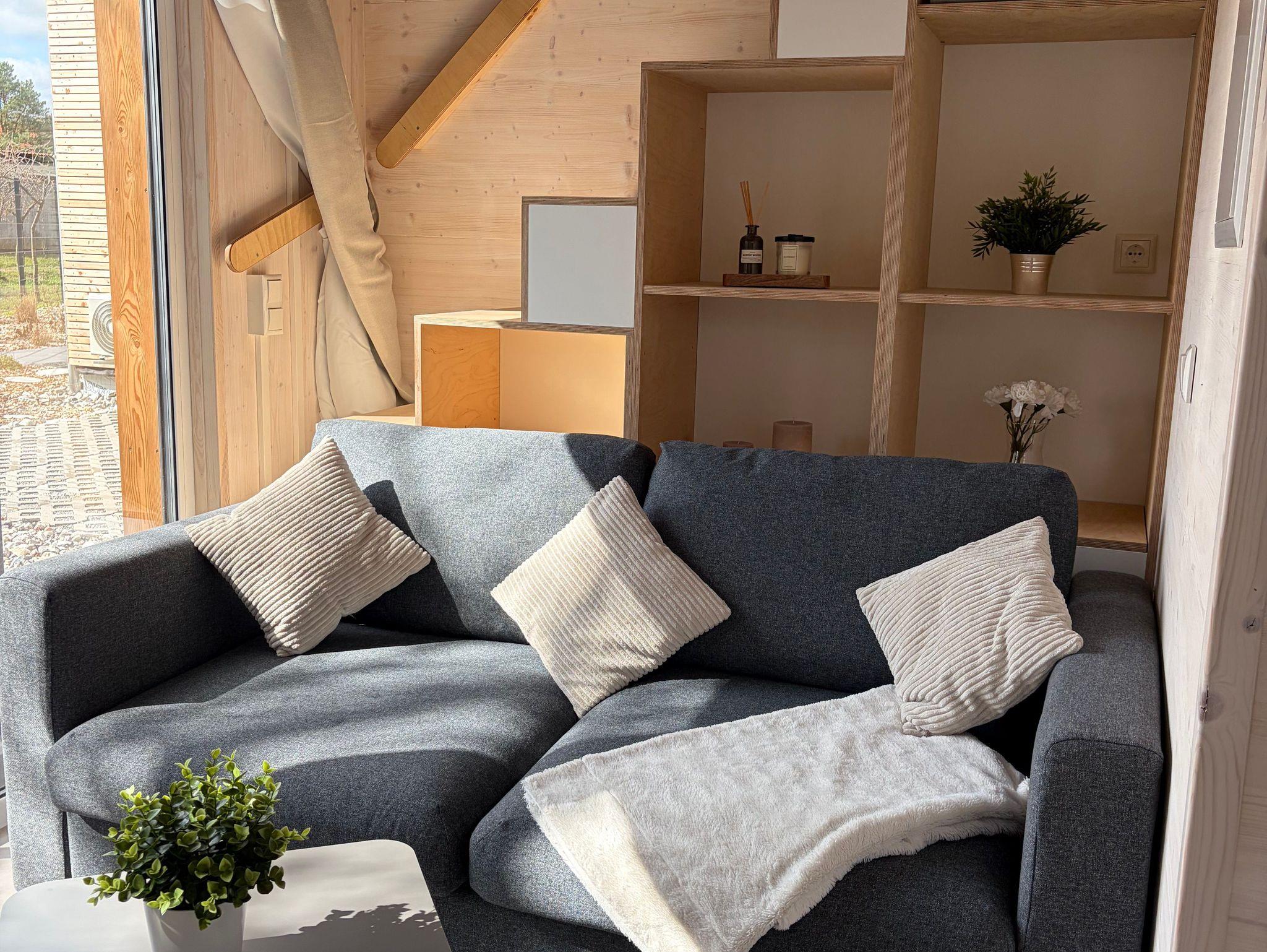 Zusammen mit der Schlafcouch im Wohnbereich (140 cm breit, mit Matratze) bietet das Tiny House Platz für maximal 4 Gäste. Für besonderen Schlafkomfort stellen wir Ihnen Decken in Übergröße (220 x 155 cm) zur Verfügung.