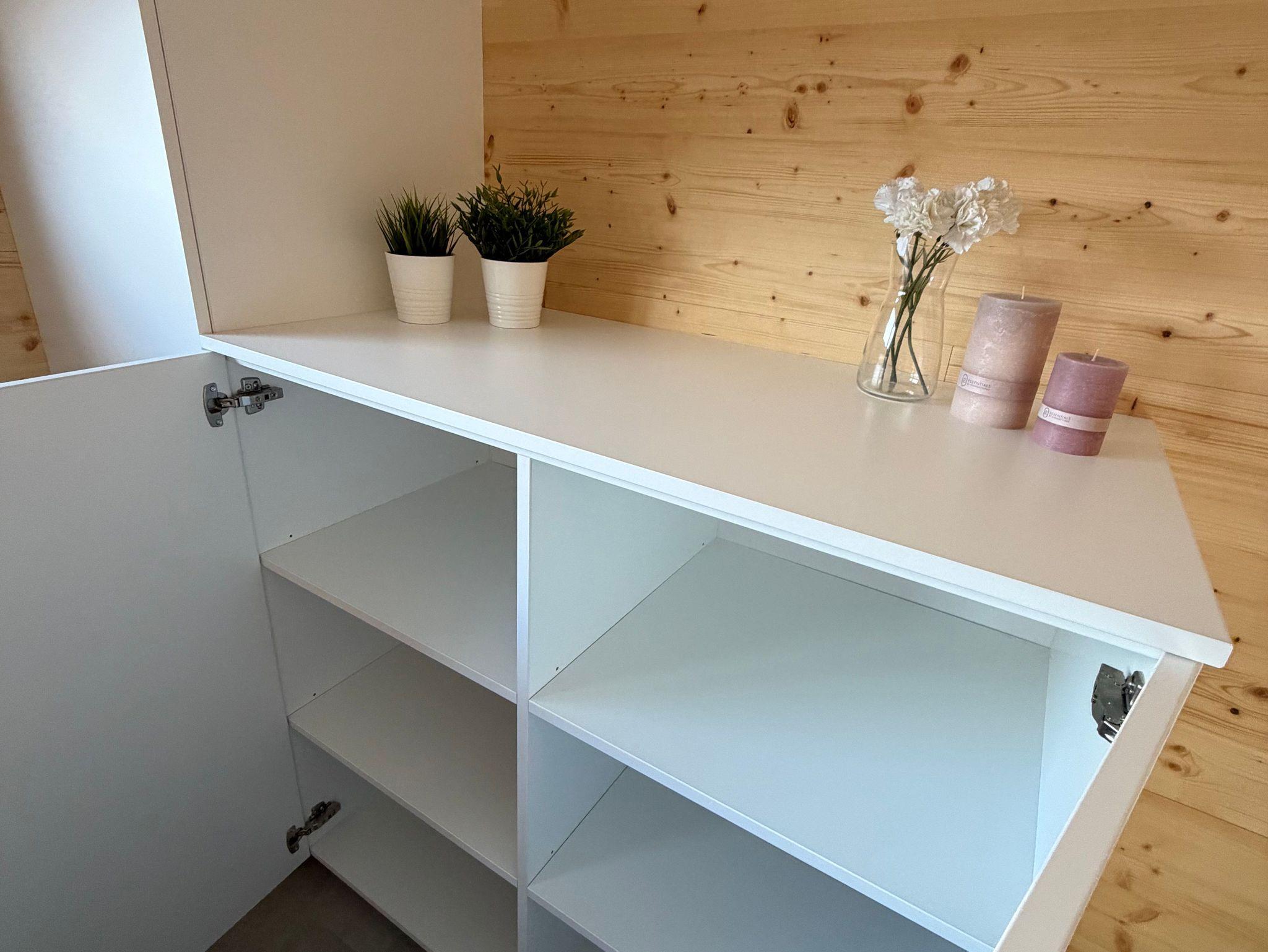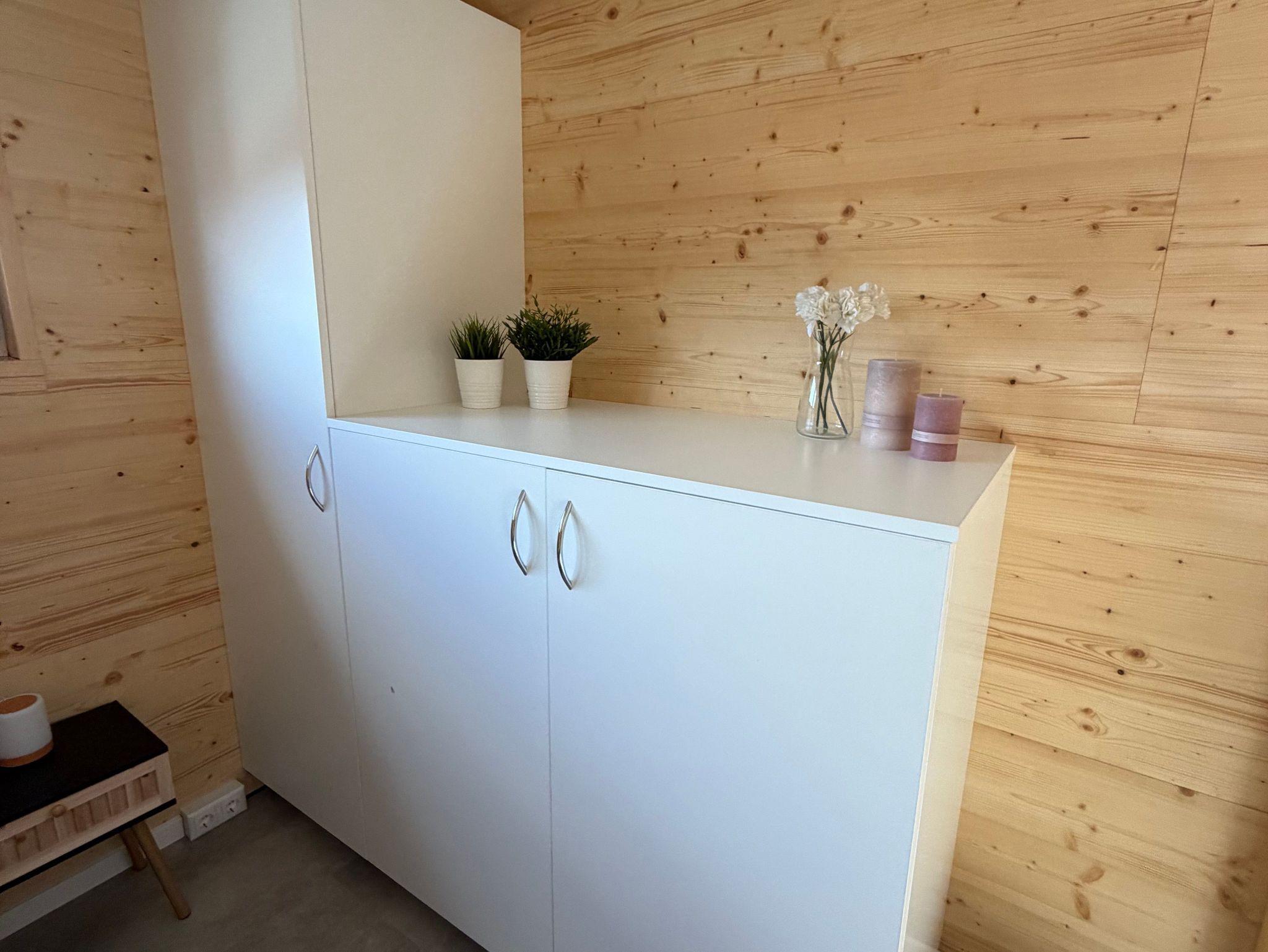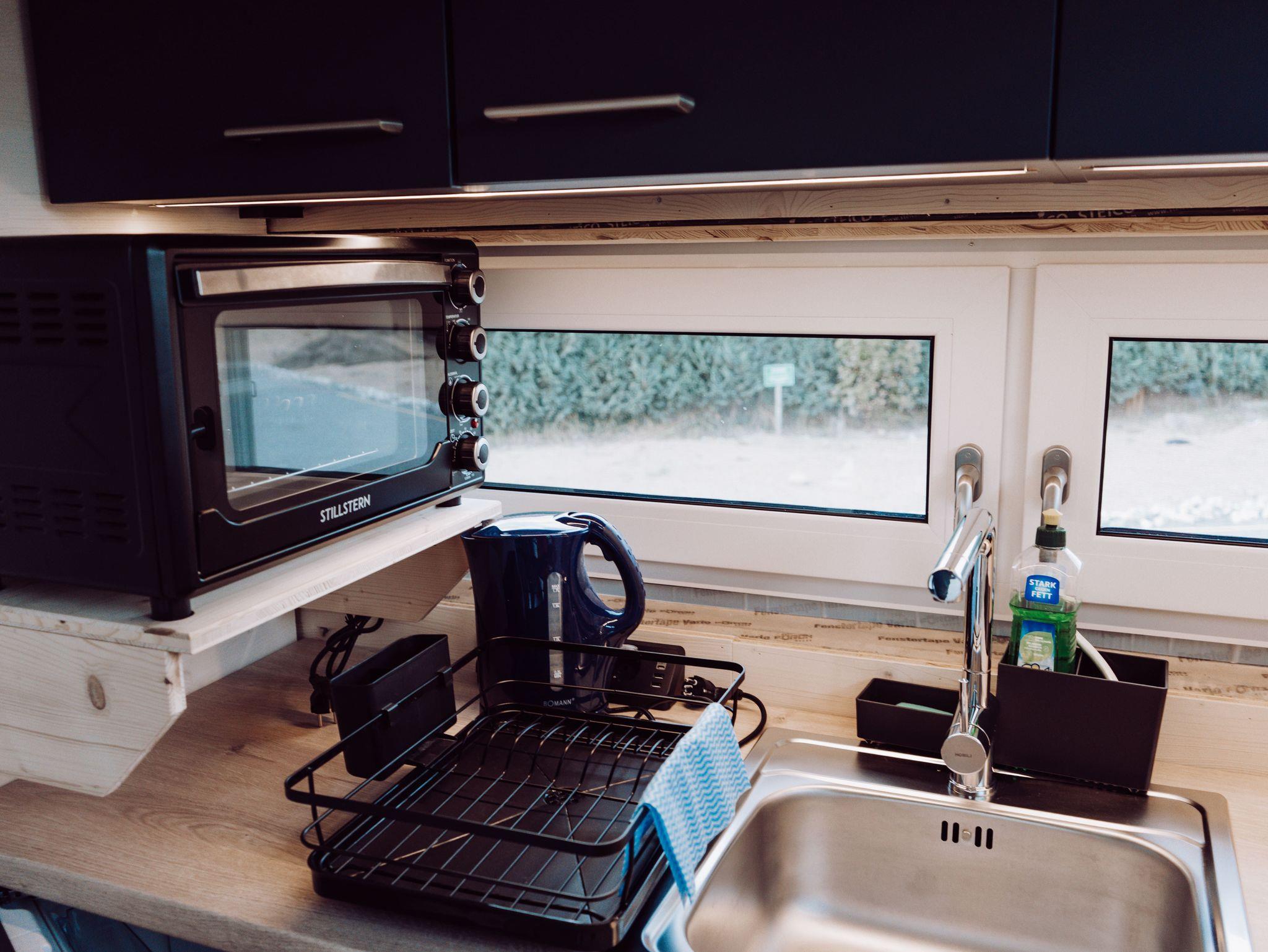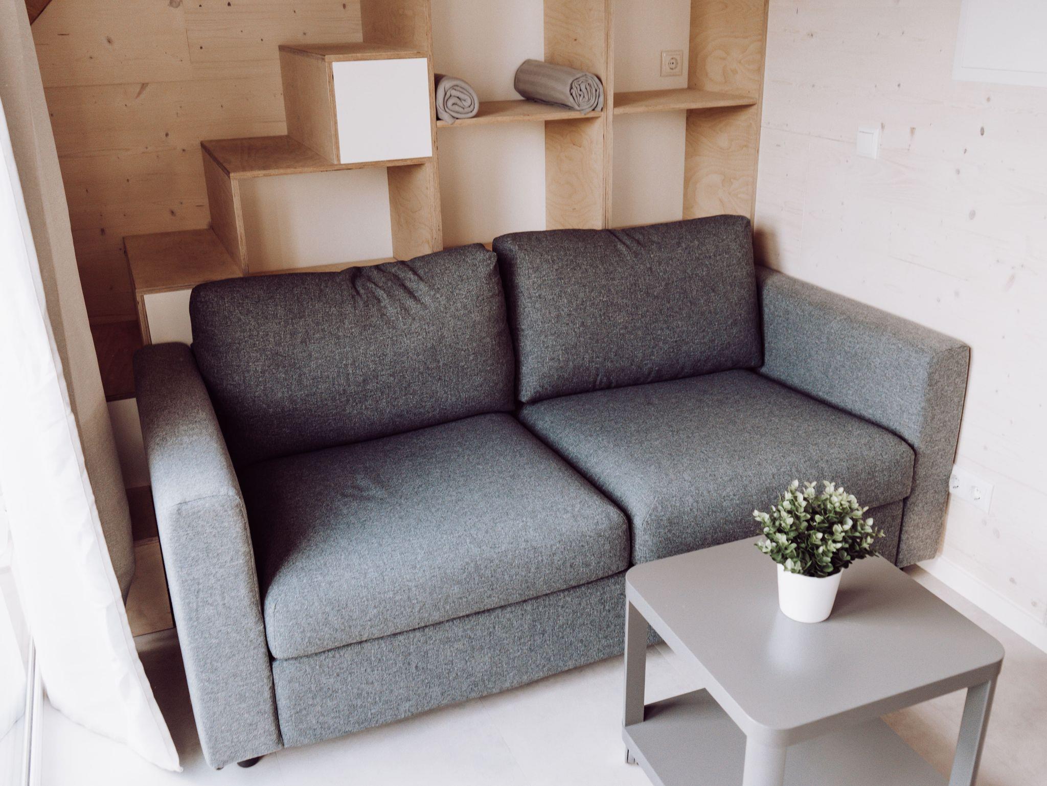 Zusammen mit der Schlafcouch im Wohnbereich (140 cm breit, mit Matratze) bietet das Tiny House Platz für maximal 4 Gäste. Für besonderen Schlafkomfort stellen wir Ihnen Decken in Übergröße (220 x 155 cm) zur Verfügung.