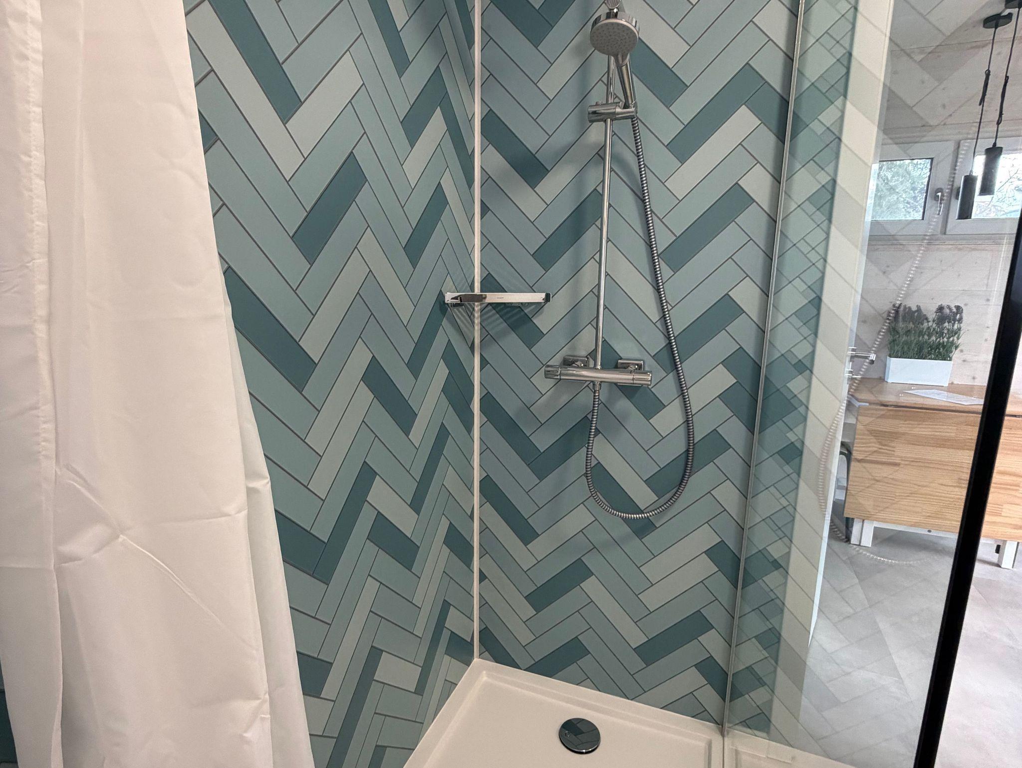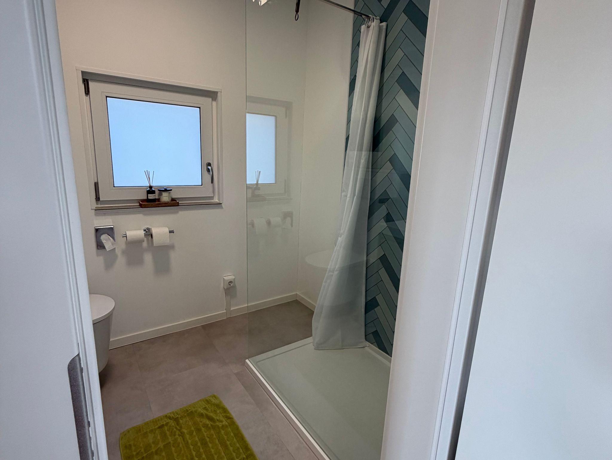 Das moderne Badezimmer verfügt über Dusche, Waschbecken, WC sowie einen 80-Liter-Boiler für warmes Wasser.