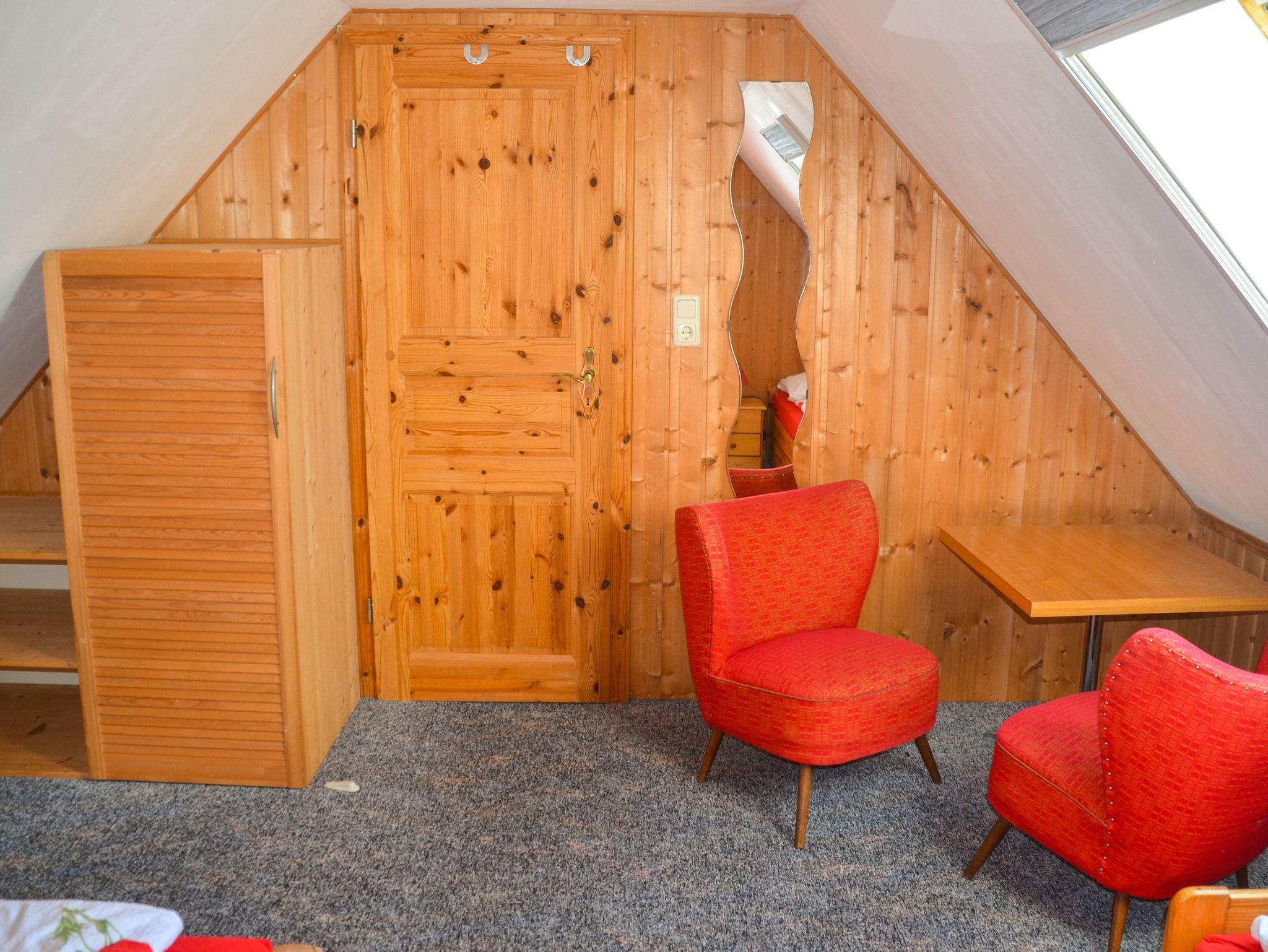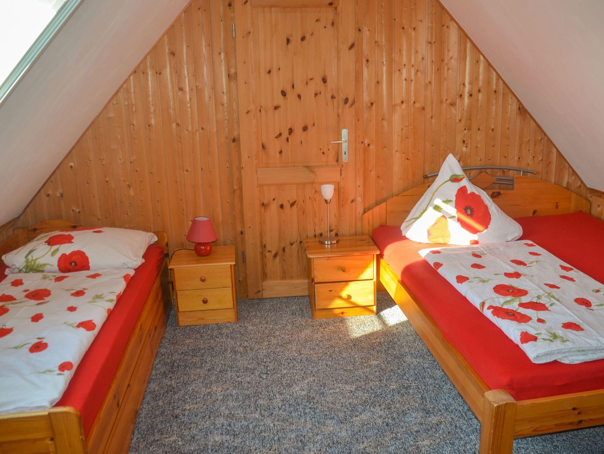 Im Obergeschoss befinden sich 2 Schlafzimmer mit je einem Doppelbett sowie einmal 1 Einzelbett. Das Schlafzimmer mit dem Einzelbett dient dabei als Durchgangszimmer zu dem anderen Schlafzimmer. Nur der Wohnraum, die Küche und das Bad sind beheizbar.