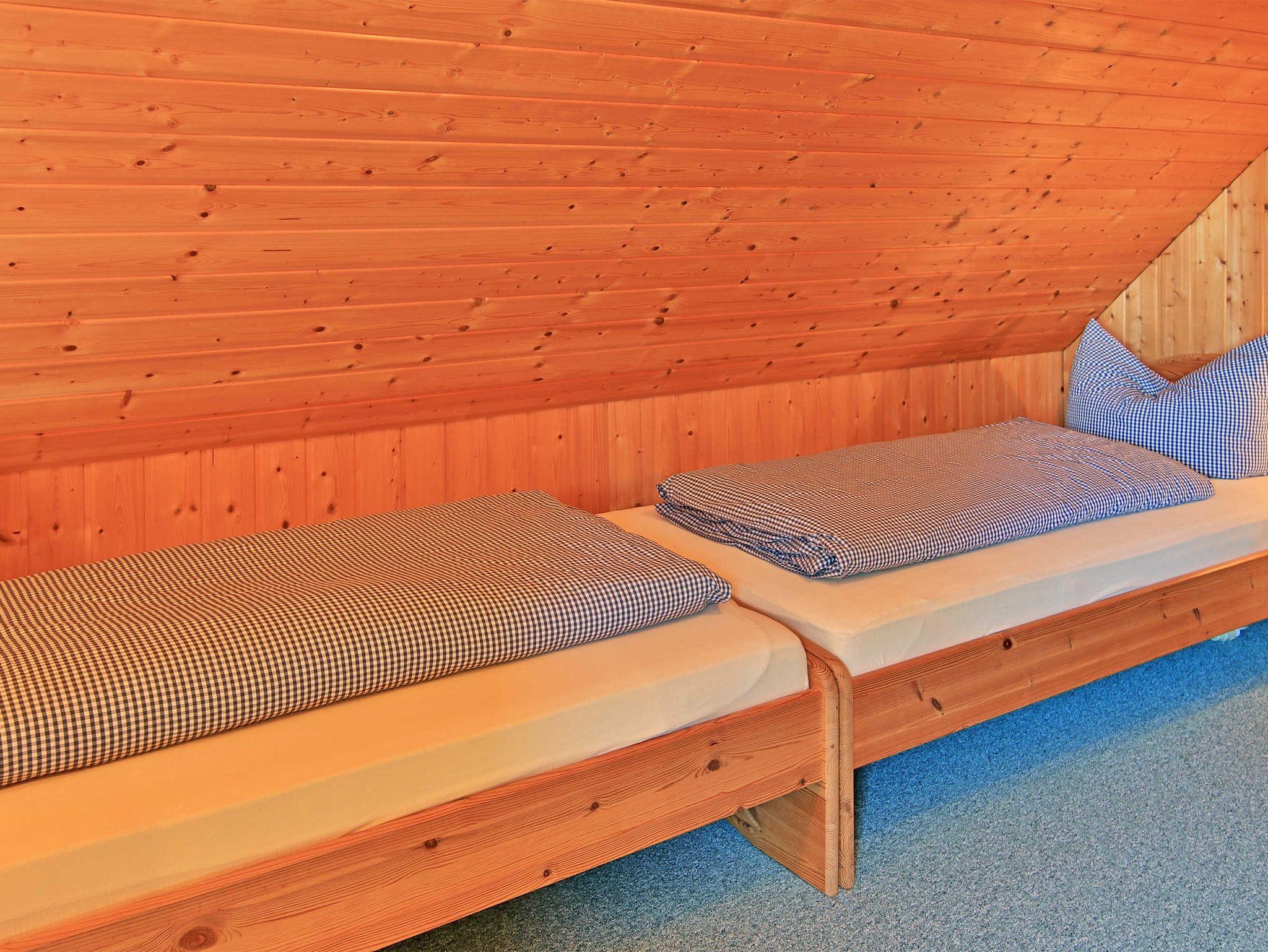 Im Obergeschoss stehen zwei Schlafzimmer zur Verfügung. Das erste Schlafzimmer ist mit Doppelbett (180x200), Babybett, genügend Stauraum und einem Schreibtisch ausgestattet. Das zweite Schlafzimmer verfügt über zwei Einzelbetten (90x200) und einen Kleiderschrank.