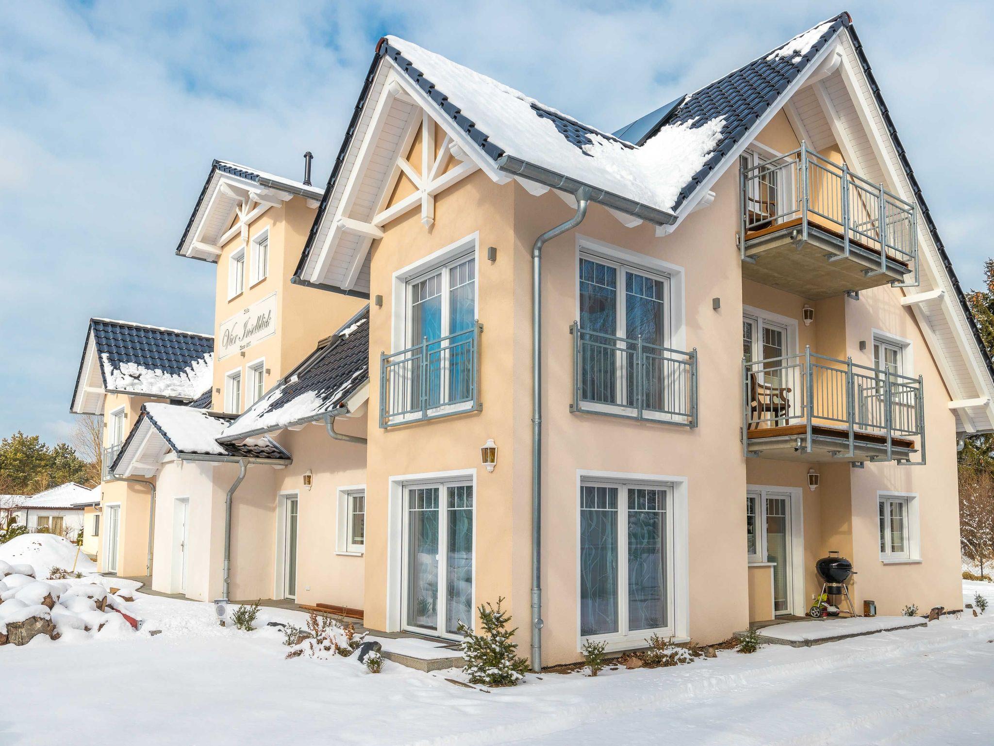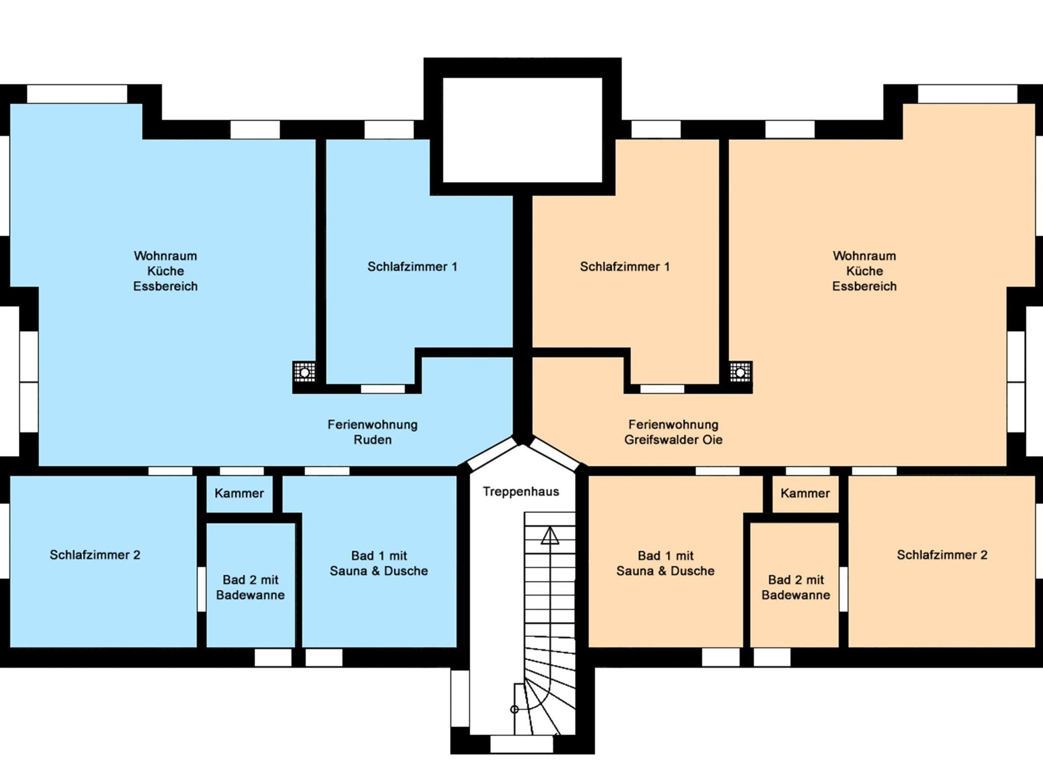 Die zwei Ferienwohnungen im Obergeschoss verfügen jeweils über einen Wohnraum mit integriertem Küchen- und Essbereich und Kaminofen, vier separaten Schlafzimmern mit Balkonen und drei Bädern. Die Ferienwohnung Usedom hat einen 40m² großen Saunabereich mit Dusche, Ruheliegen und Balkon.