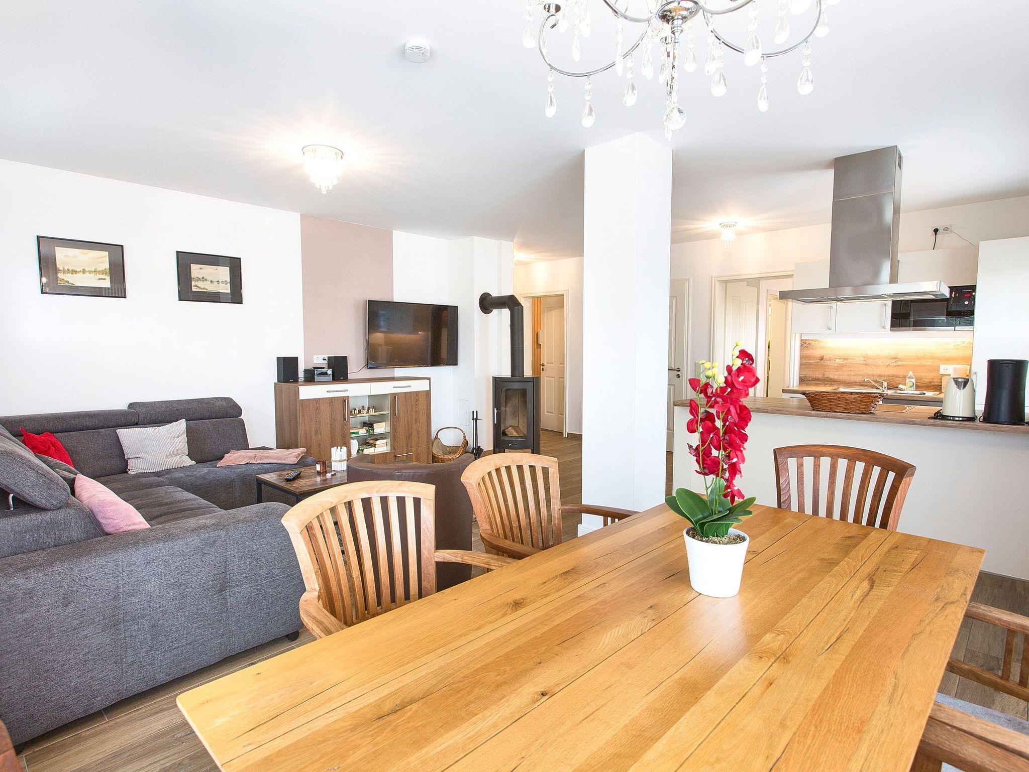 Im großzügigen Wohnbereich erwarten Sie eine gemütliche Wohnlandschaft, Kamin, Smart-TV, eine offen gestaltete Küche sowie ein großer Esstisch. Die Küche ist umfangreich ausgestattet mit Kühlschrank, Gefrierschrank, Ceran-Kochfeld, Backofen, Spülmaschine, Mikrowelle, Kaffeemaschine, Wasserkocher, Toaster und alle den kleinen Dingen des täglichen Bedarfs.
