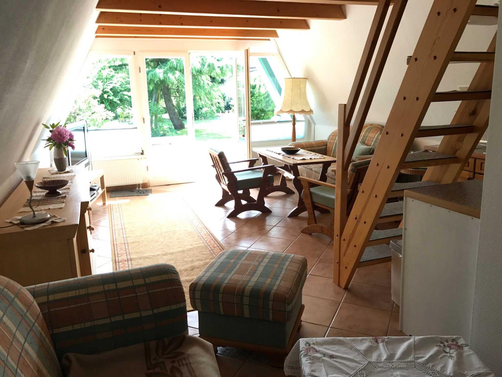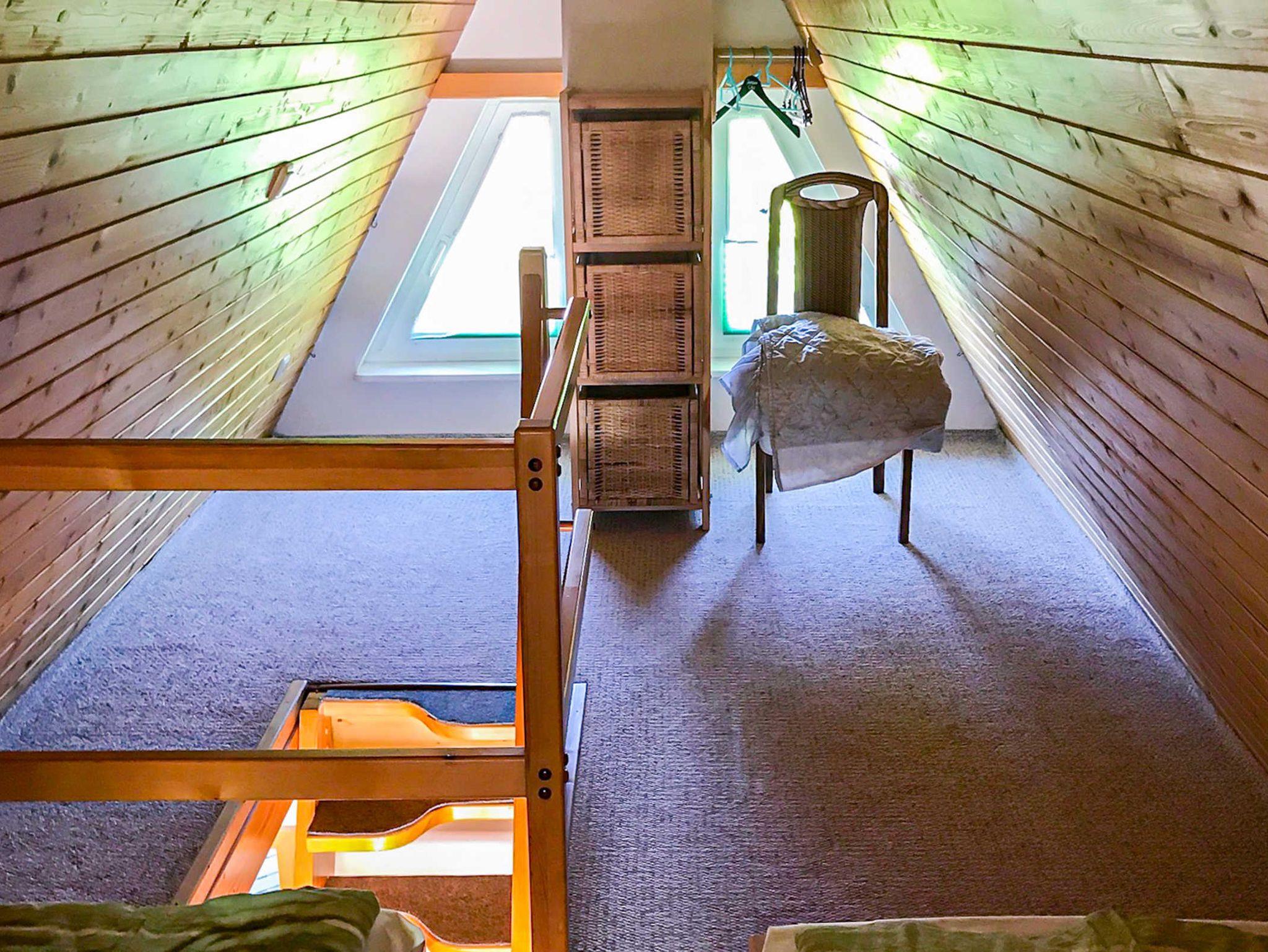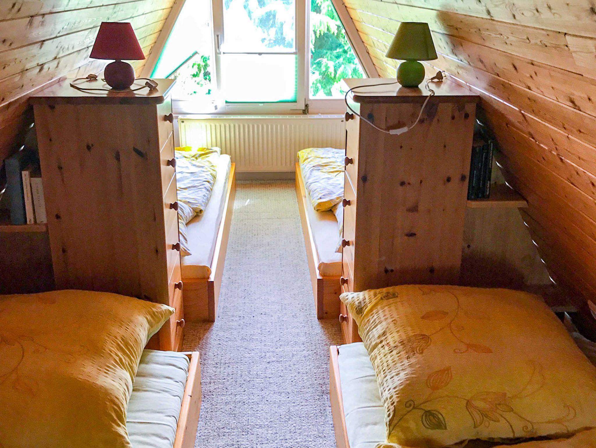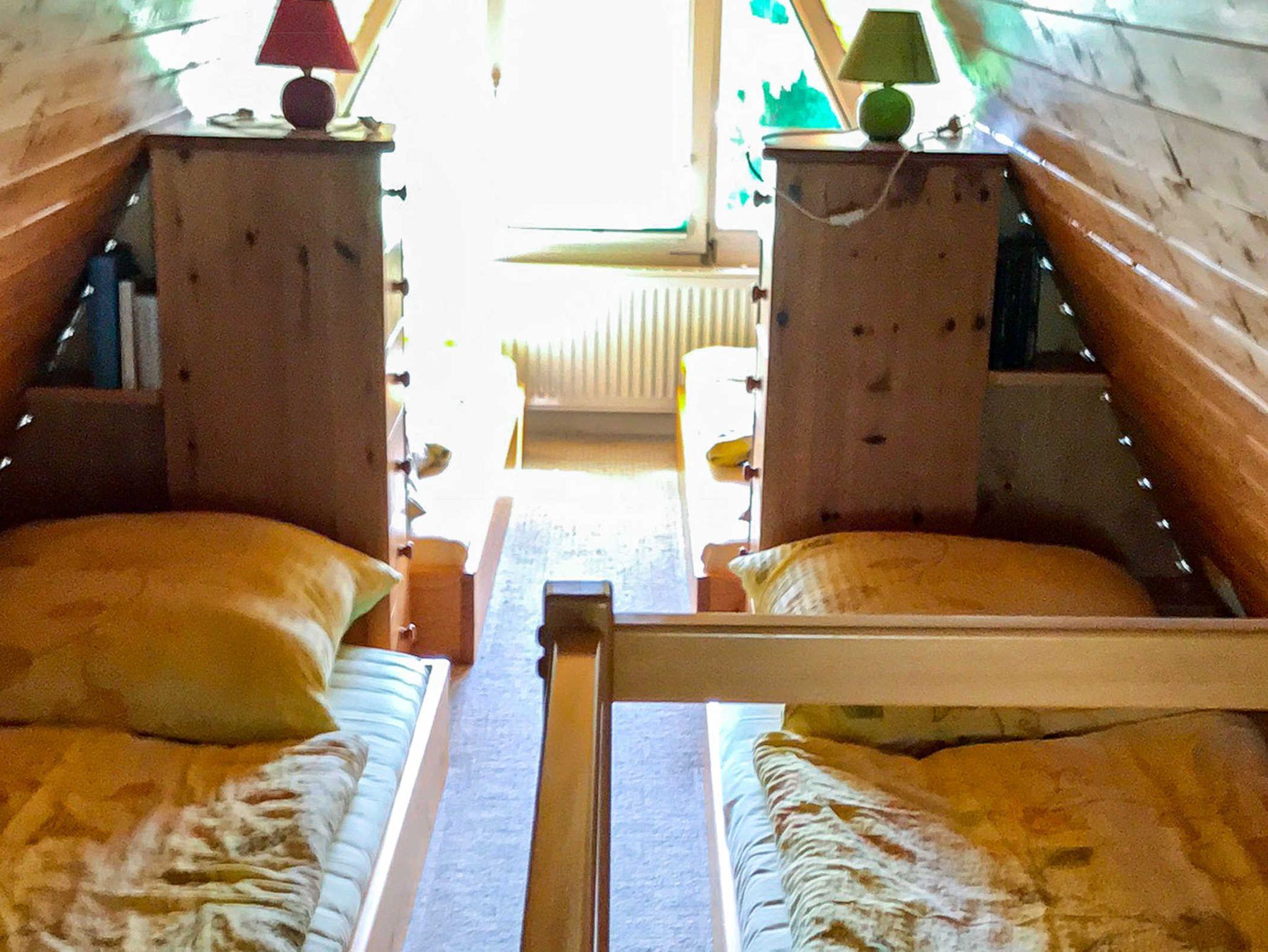 Im oberen Bereich, erreichbar über eine schmale Holztreppe befindet sich ein offener Schlafboden mit 4 Einzelbetten (90x210), welche sich gegenüber stehen. Bei Bedarf können zwei Betten zusammengeschoben werden.