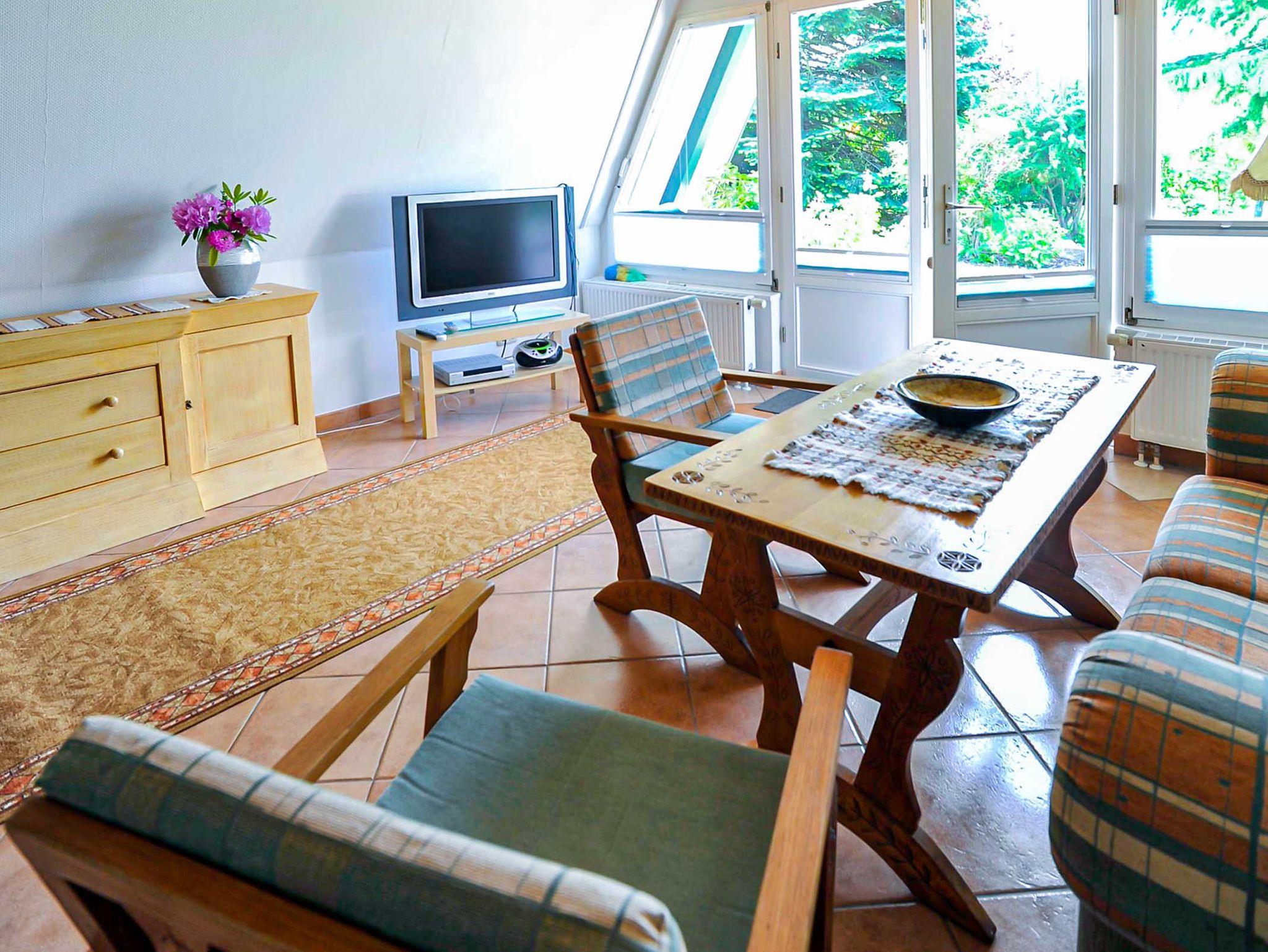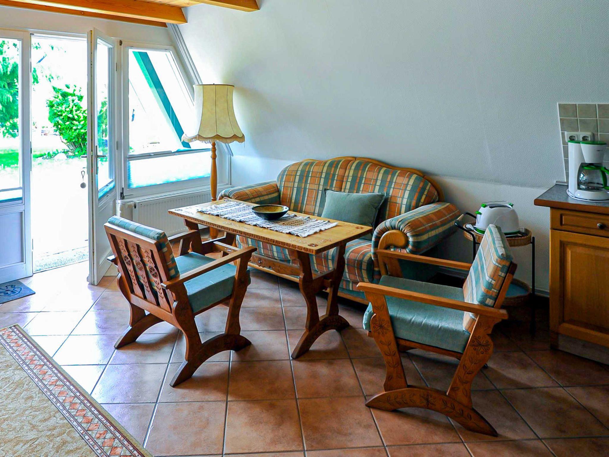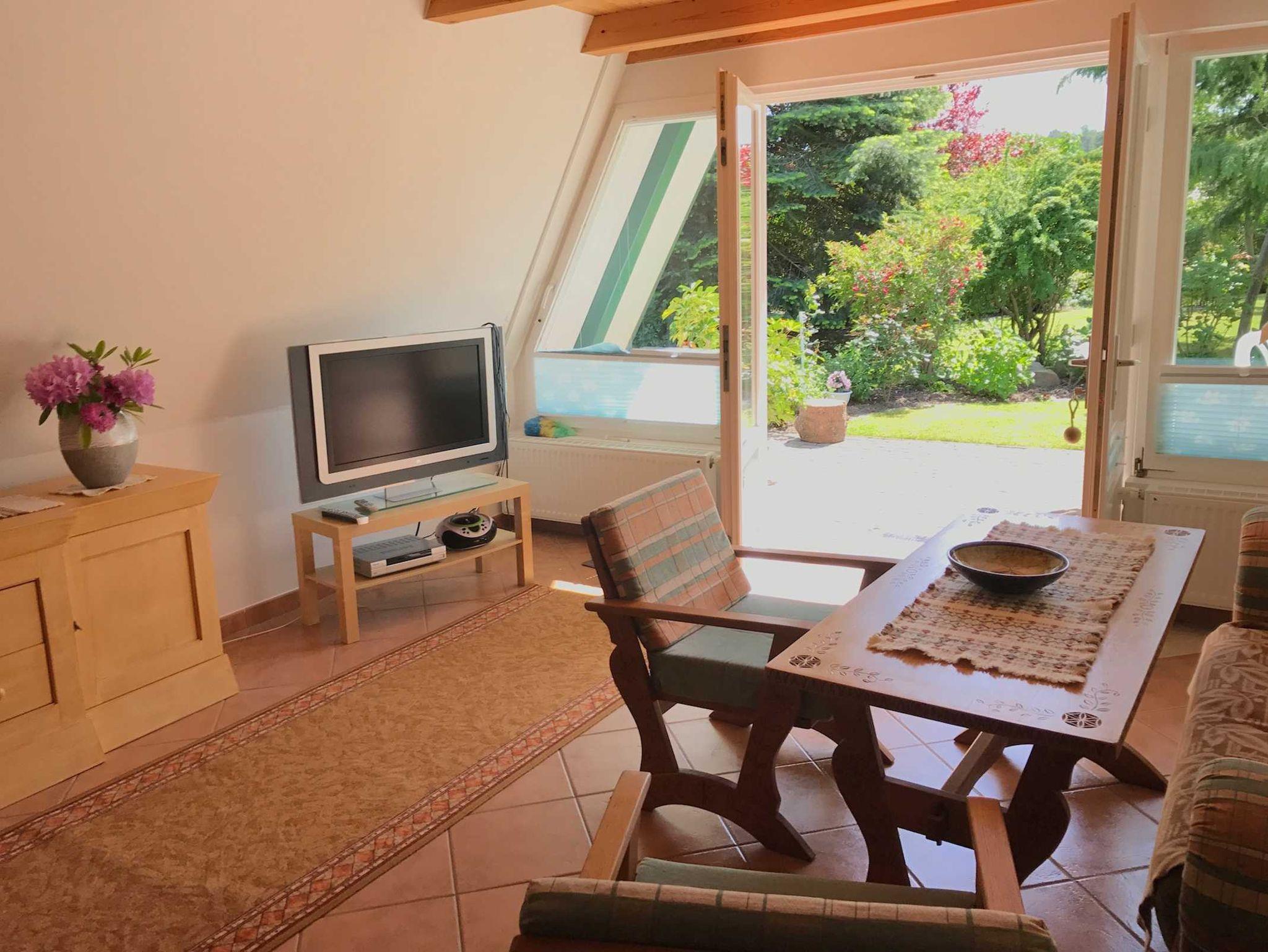 Die Finnhütte ist ein Nichtraucherhaus mit Liegewiese und befindet sich auf dem 1600 m² großen Gartengrundstück des Vermieters im kleinen Fischerdorf Freest. Das Wohn-Esszimmer ist mit Satelliten-TV, Radio, CD-Player und gemütlichen Kaminecke ausgestattet. Die Pantry-Küche verfügt über einen Elektroherd mit Backofen und Ceranfeld, Kühlschrank, Kaffeemaschine und Toaster.