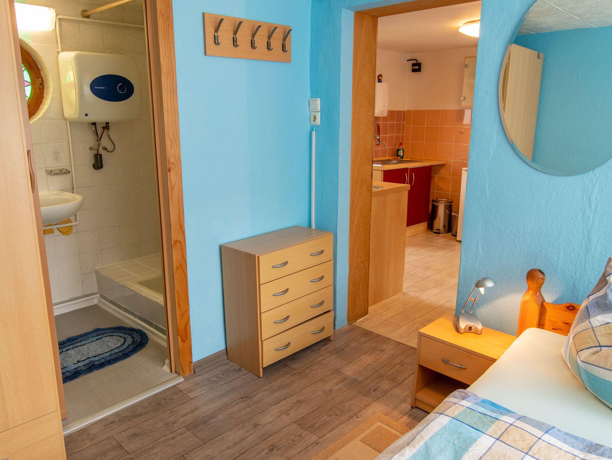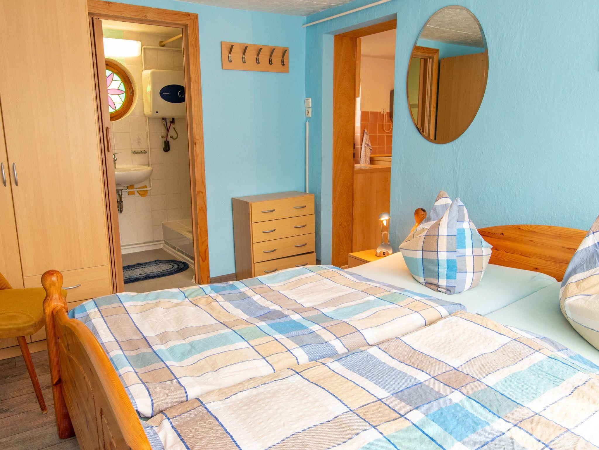 Das Schlafzimmer dient als Durchgangszimmer zum Bad.