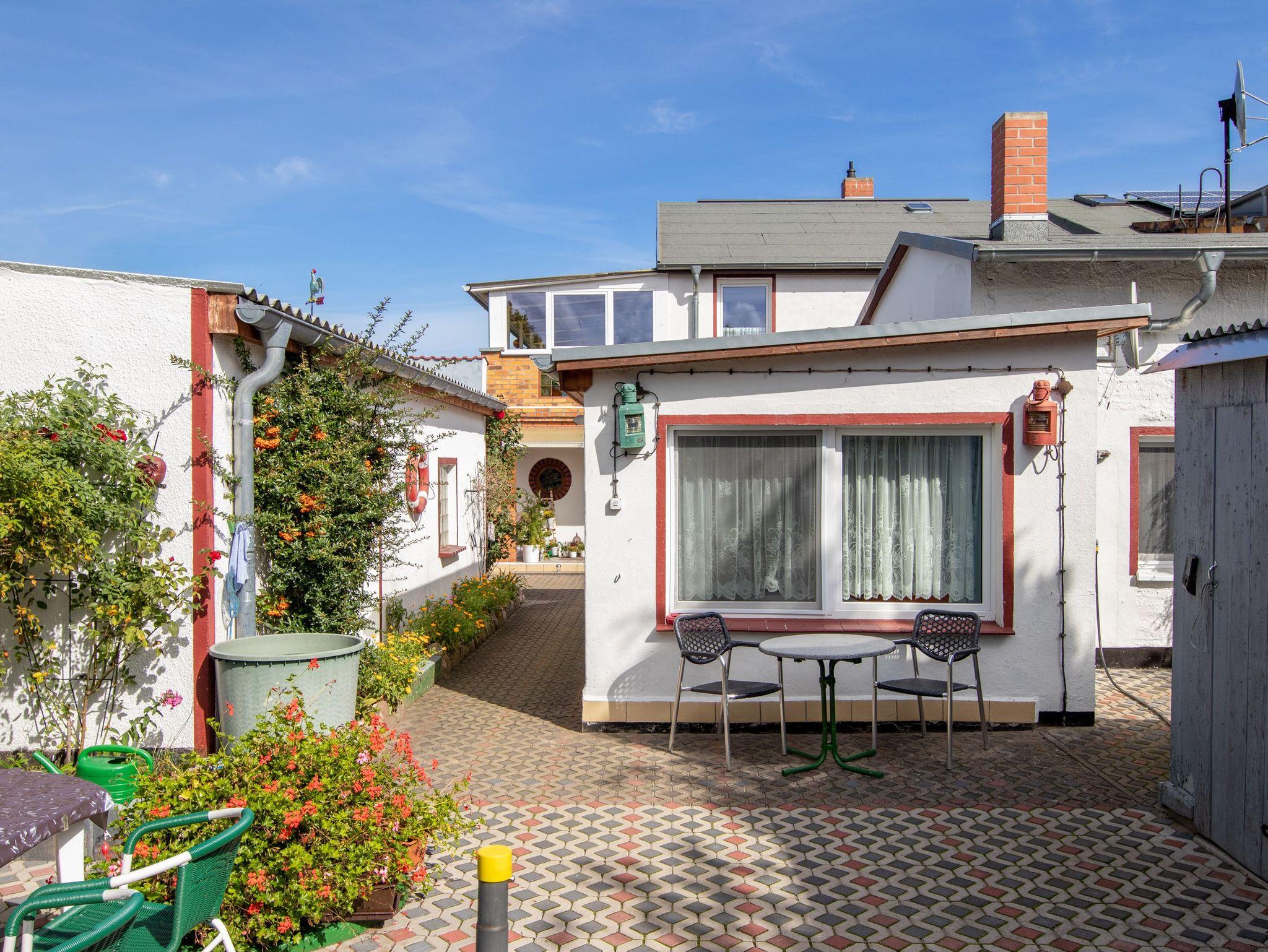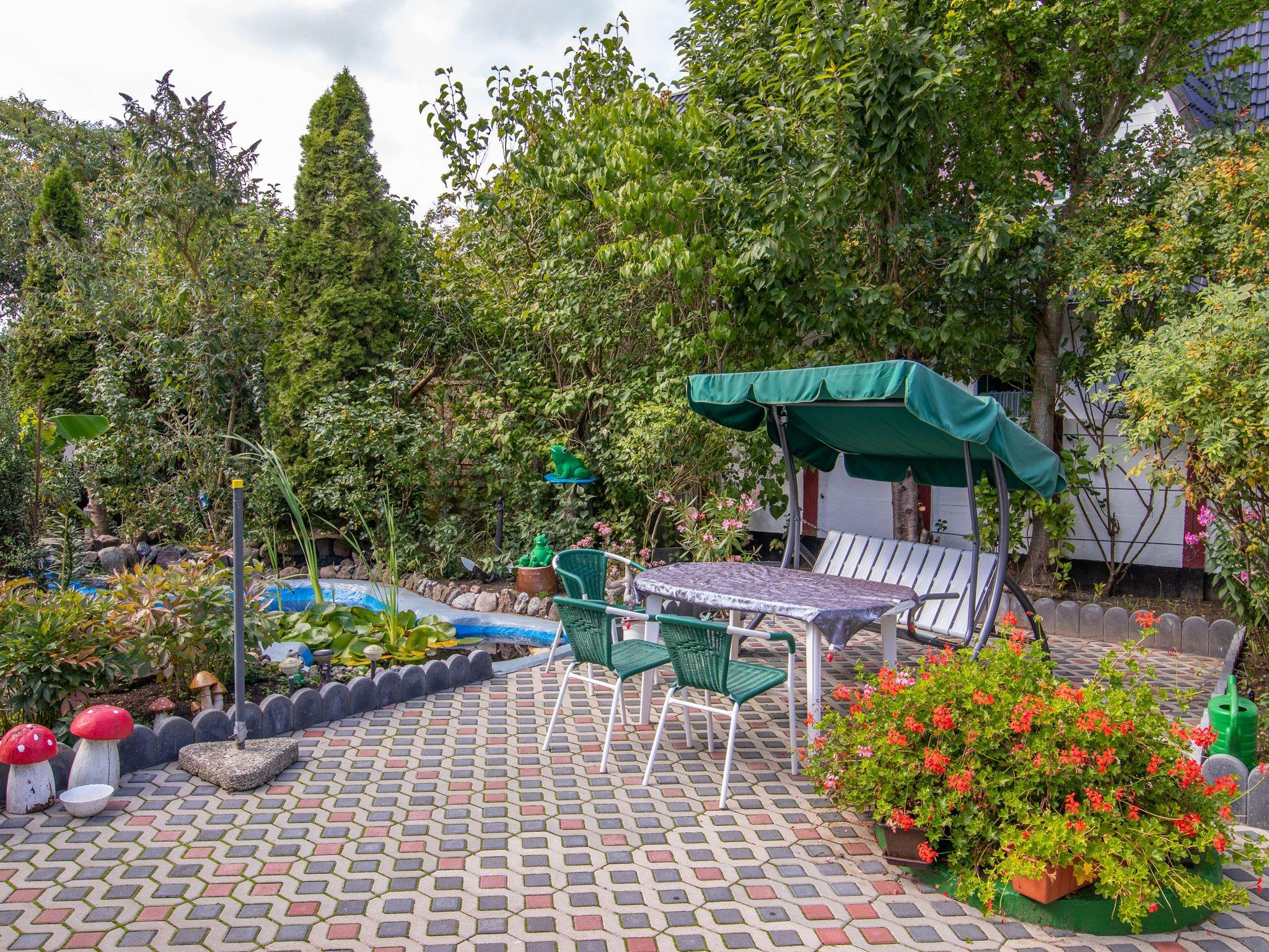 Hinter dem Haus steht den Gästen eine ruhige Terrasse mit Gartenmöbeln zur Verfügung.