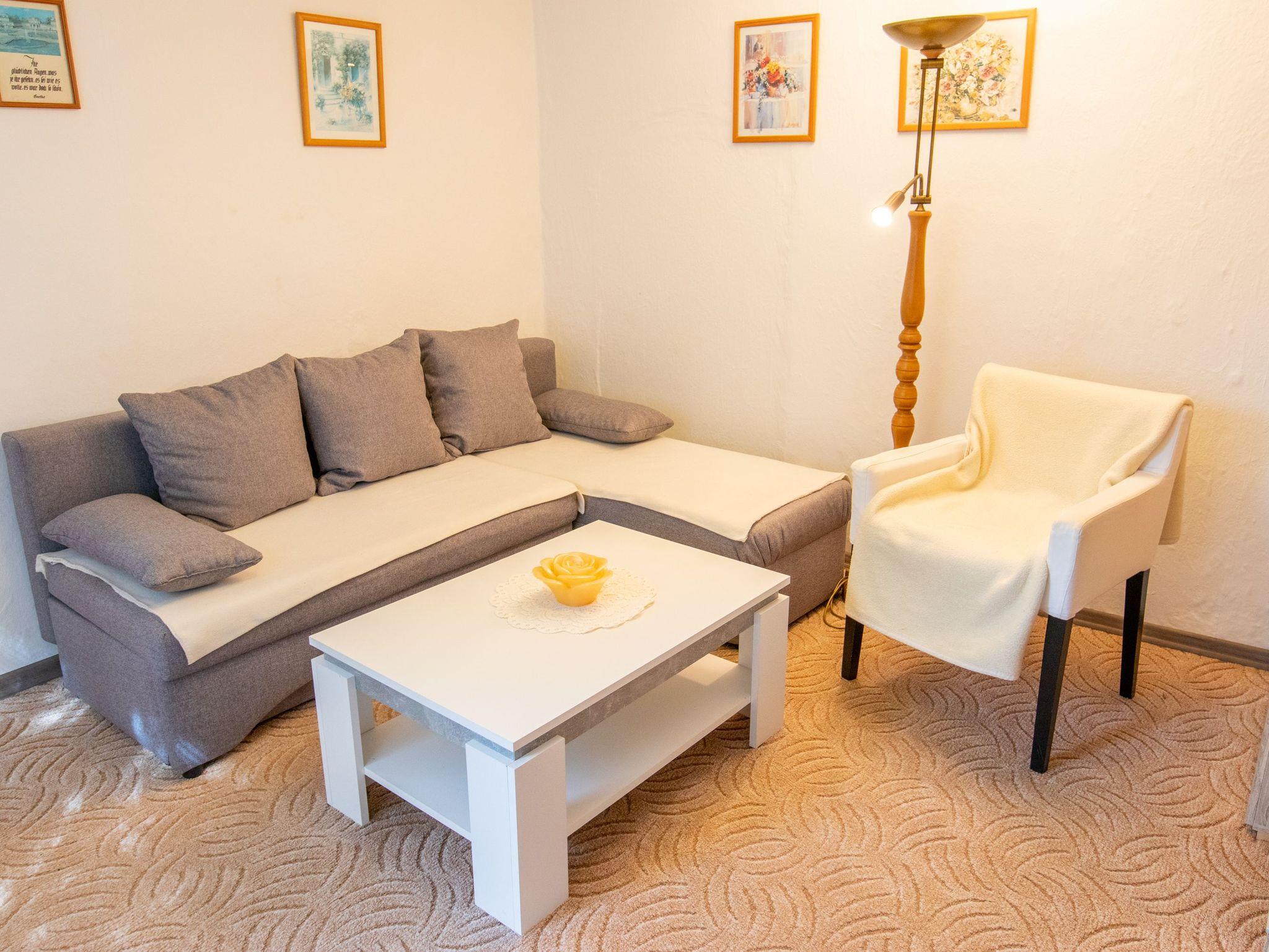 Die 40 m² große, einfach eingerichtete Ferienwohnung verfügt über ein Wohnzimmer mit Schlafcouch, Sessel und TV, ein Schlafzimmer mit Doppelbett, eine voll ausgestattete Küche, und ein kleines Bad mit Dusche und WC.