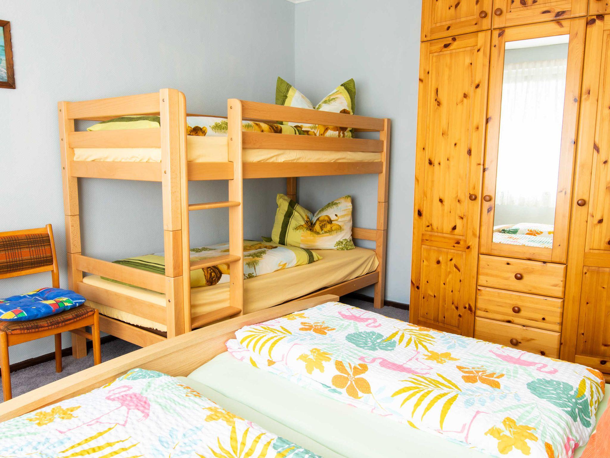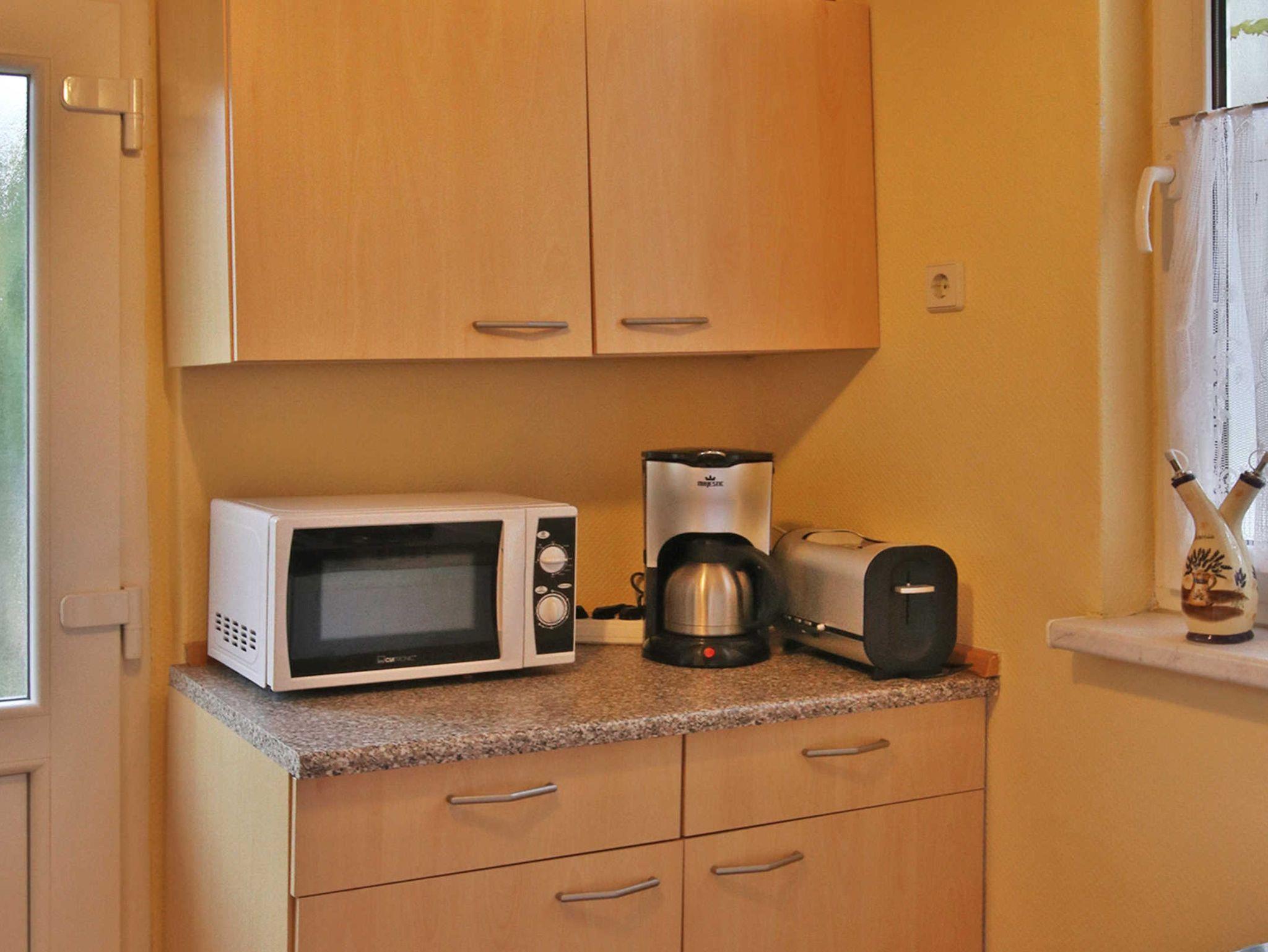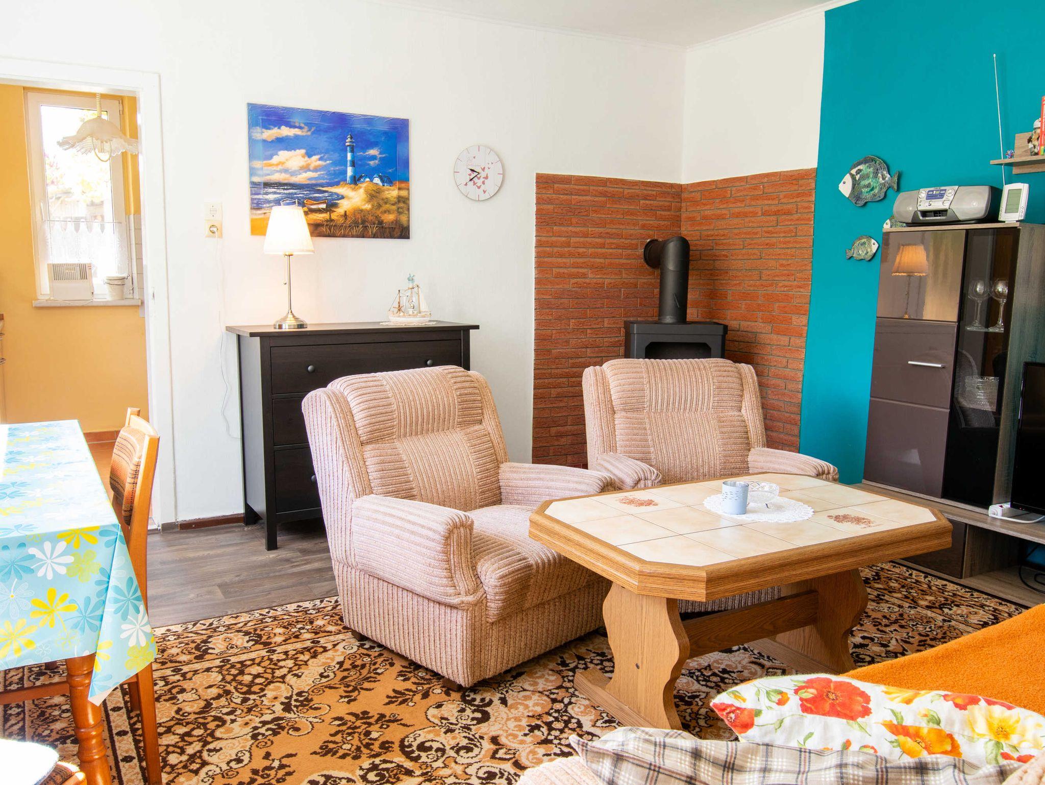 Im Bungalow befinden sich ein Wohnzimmer mit Couch, Kamin, Esstisch und TV, ein Schlafzimmer mit einem Doppelbett (180x200, getrennte Matratzen), einem Etagenbett (100x200) und einem großen Kleiderschrank, eine kleine separate Pantry-Küche mit zwei Herdplatten, Kühlschrank, Mikrowelle, Kaffeemaschine und Toaster sowie ein Tageslichtbad mit Dusche und WC. Vor dem Bungalow stehen Gartenmöbel und ein Grill zur freien Verfügung.
