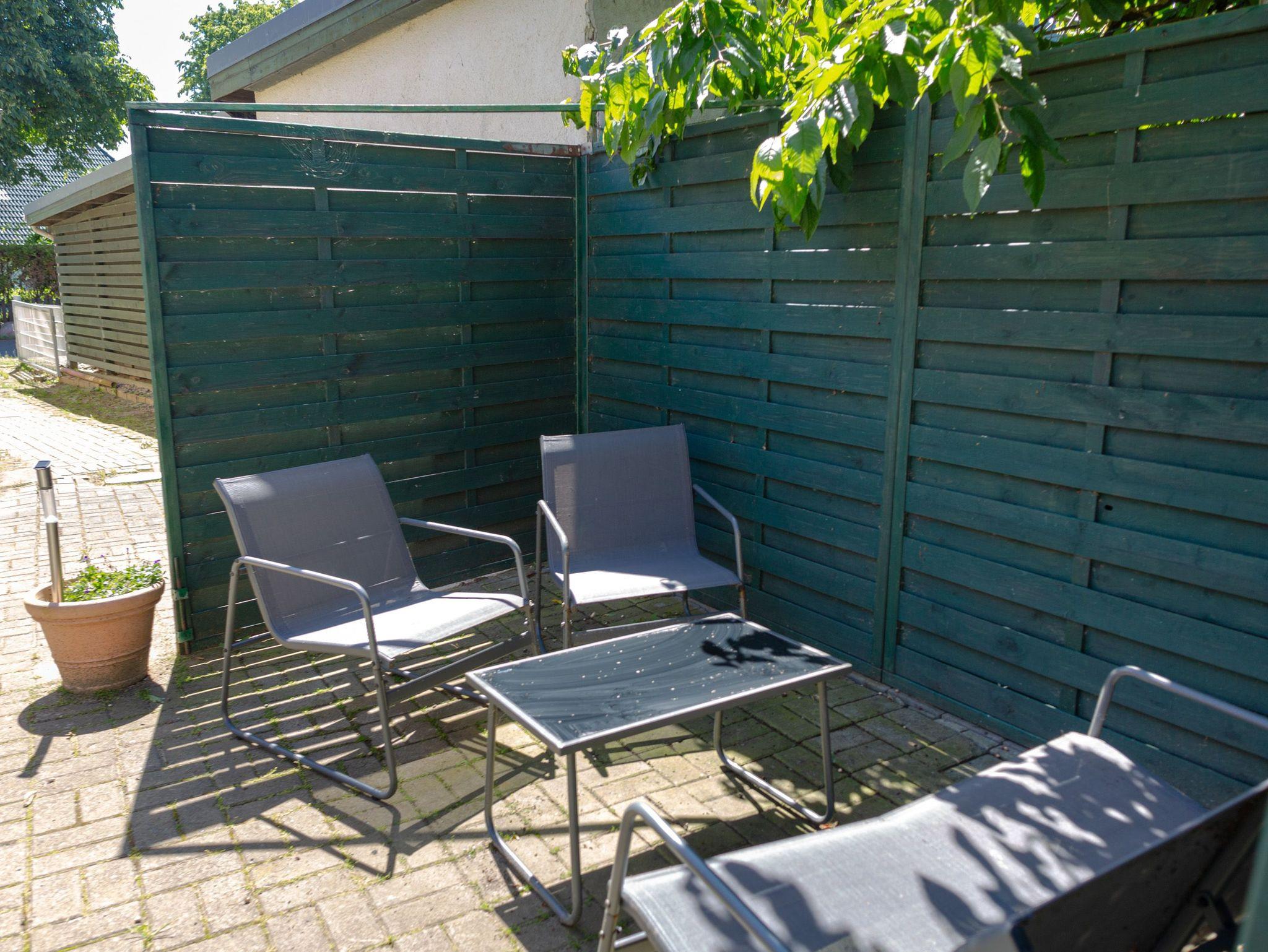 Die Ferienwohnung im Obergeschoss an der Marina in Kröslin bietet dir auf 60 m² ausreichend Platz für 3 Personen und ein Kleinkind bis 2 Jahre. In der gemütlichen Dachgeschosswohnung findest du eine geräumige Küche, ein Wohnzimmer, ein Schlafzimmer und ein Bad mit Dusche und WC. Die gut ausgestattete Küche mit Essecke ist ideal zum gemeinsamen Kochen. Hier steht dir ein Backofen mit Herd, ein Kühlschrank (ohne Gefrierfach), eine Mikrowelle sowie praktische Küchenhelfer wie Wasserkocher, Kaffeemaschine und Toaster zur Verfügung. Das Wohnzimmer grenzt direkt an die Küche und das Bad. Hier kannst du es dir auf dem Sofa gemütlich machen und entspannte Abende vor dem Kamin oder beim TV schauen genießen. Ein Kleiderschrank befindet sich ebenfalls im Wohnzimmer. Vom Wohnzimmer aus gelangst du ins Schlafzimmer, das mit einem Doppelbett (180x200) und einem Einzelbett (100x200) ausgestattet ist. Die gemütliche Sitzecke im Innenhof lädt zum Verweilen ein und bietet dir auch die Möglichkeit, einen Grill aufzustellen und den Tag bei einem leckeren Grillabend ausklingen zu lassen.