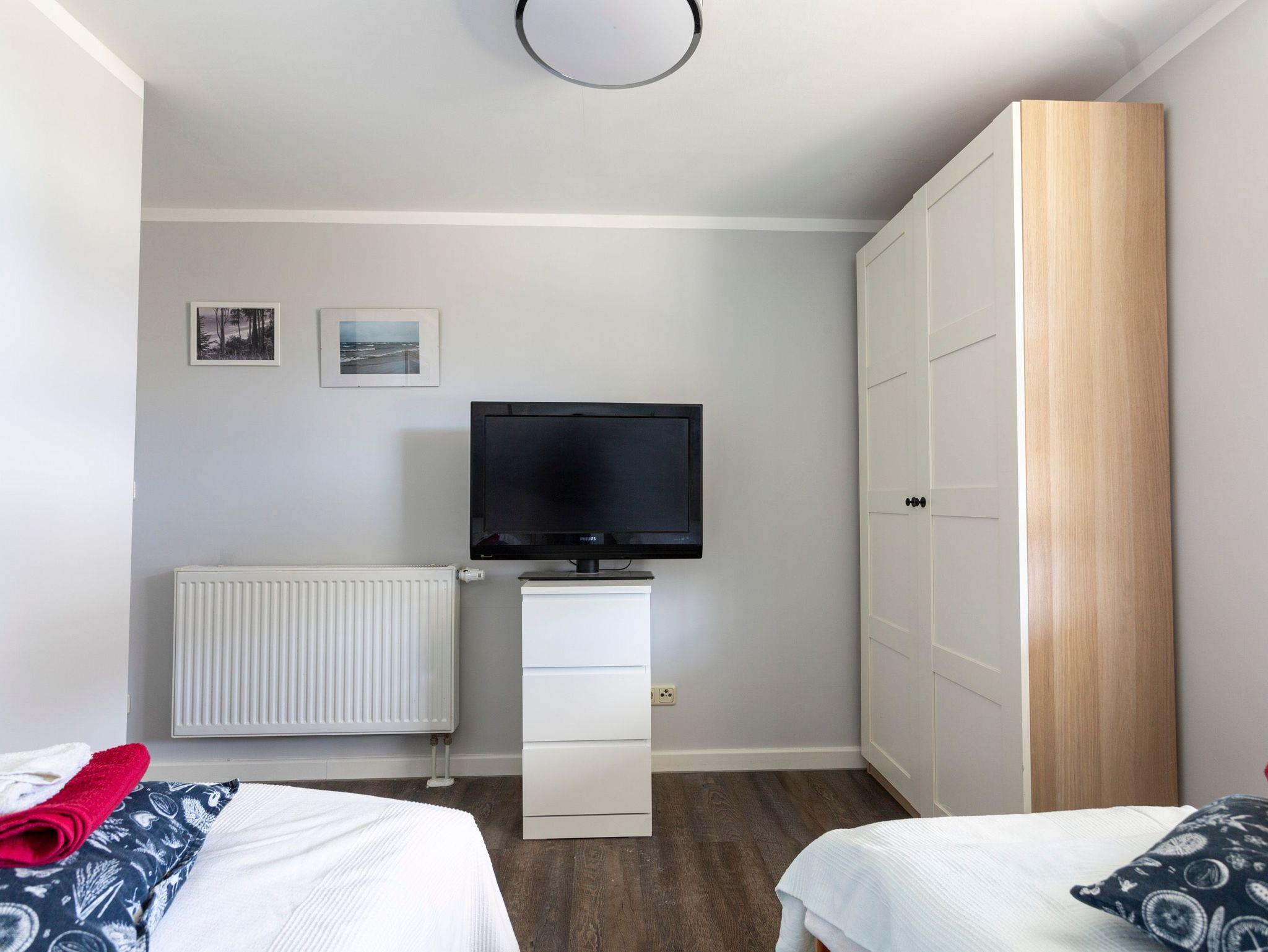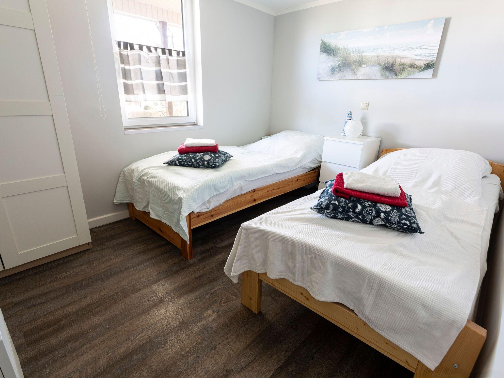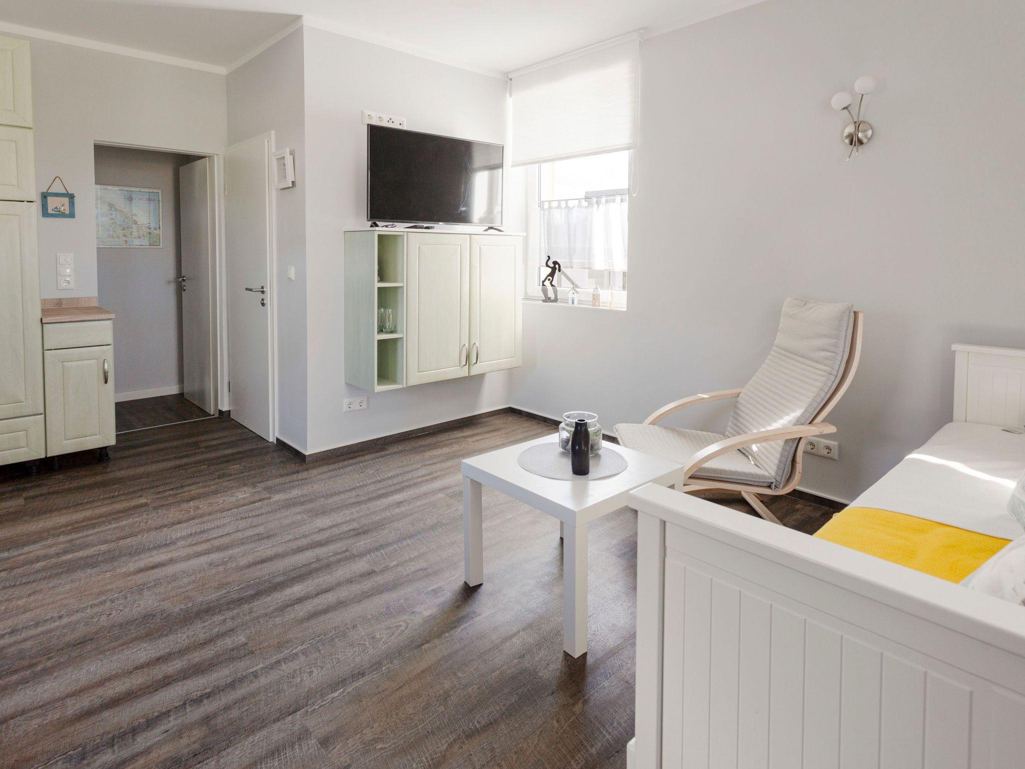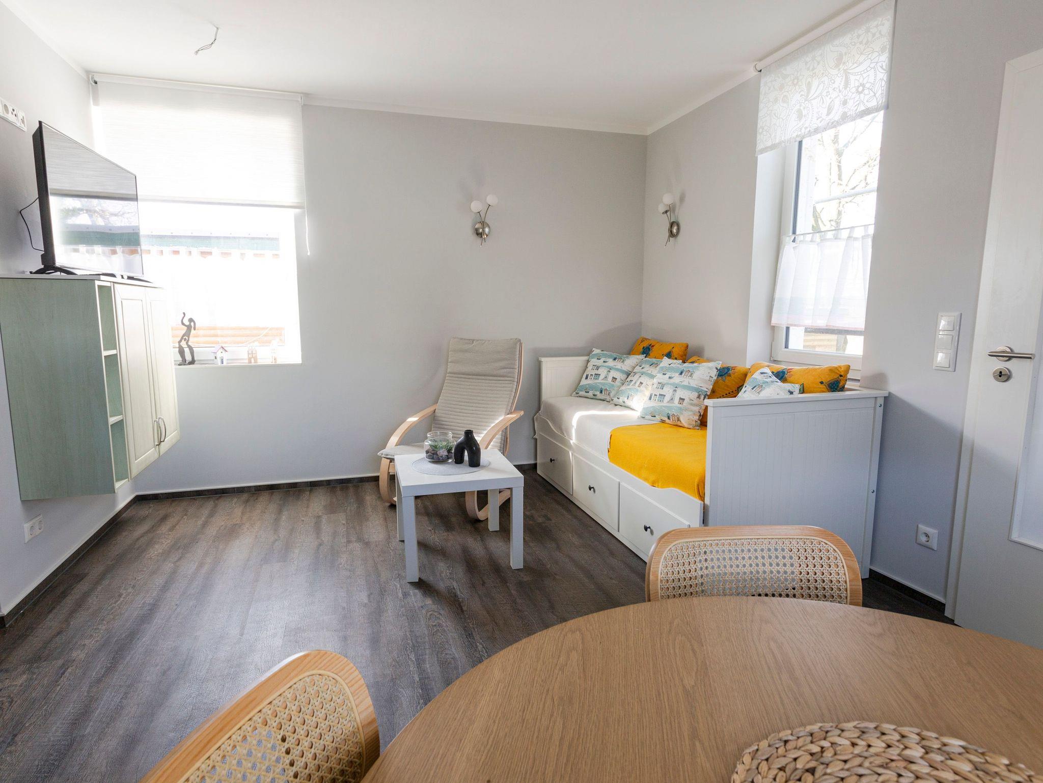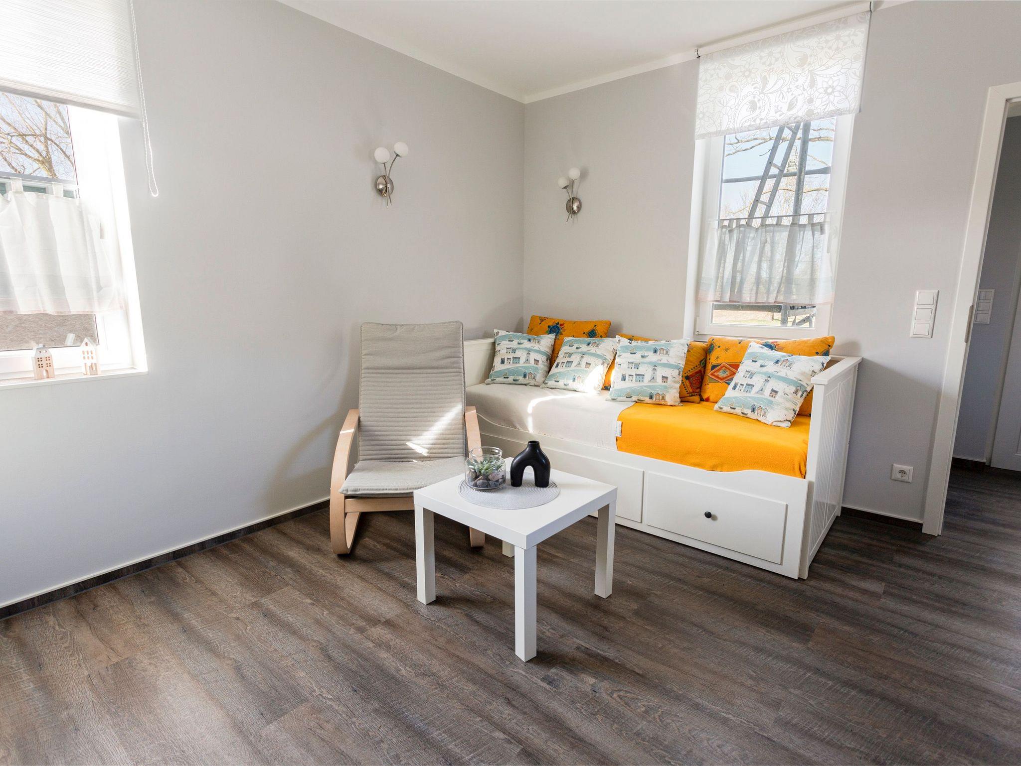 Die Ferienwohnung Alter Bahnhof in Kröslin befindet sich im Haupthaus mit separatem Eingang. Auf 36 m² Wohnfläche gibt es ausreichend Platz für 2-3 Personen. Das Wohnzimmer verfügt über ein Schlafsofa (80x200), einen TV und eine offene Küche. Die Küche ist mit allem ausgestattet, was du für eine kleine Auszeit benötigst. Hier stehen dir neben einem Kühlschrank, Backofen, Herd, Mikrowelle und Kaffeemaschine auch die täglichen Kochutensilien zur Verfügung. Im separaten Schlafzimmer erwarten dich zwei Einzelbetten (90x200), ein TV und ein Kleiderschrank. Das Bad verfügt über eine ebenerdige Dusche, Waschbecken und WC.