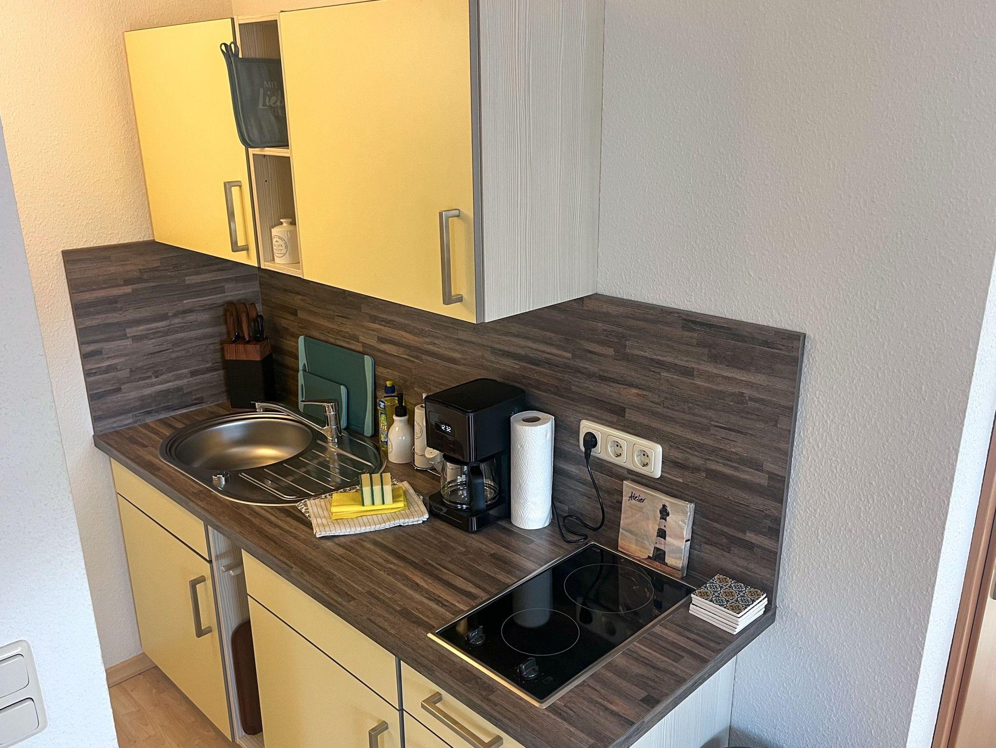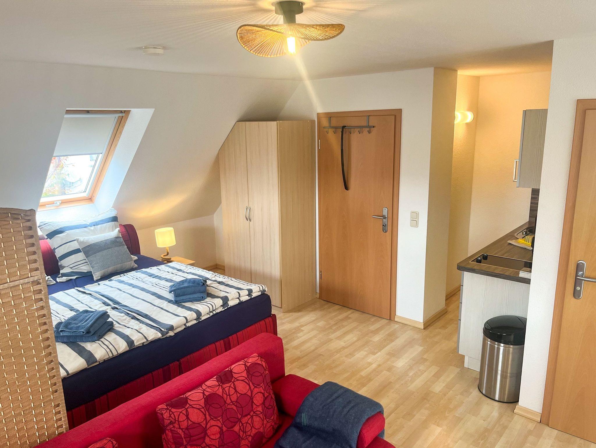 Die beiden Kröslin Apartments liegen ruhig im Obergeschoss eines gepflegten Hauses, nur rund 400 Meter von der Marina Kröslin entfernt. Jedes der 35 m² großen Apartments bietet Platz für bis zu 3 Personen und kombiniert Wohn-, Schlaf- und Kochbereich zu einem gemütlichen Rückzugsort für Paare, kleine Familien oder Alleinreisende. Im offenen Studio sorgen ein bequemes Doppelbett und eine Schlafcouch für erholsame Nächte. Eine Sitzecke mit TV lädt zu entspannten Abenden ein. Die kleine Küchenzeile ist ausgestattet mit 2-Platten-Kochfeld, Kühlschrank, Wasserkocher und Kaffeemaschine. Das Badezimmer verfügt über Dusche und WC.