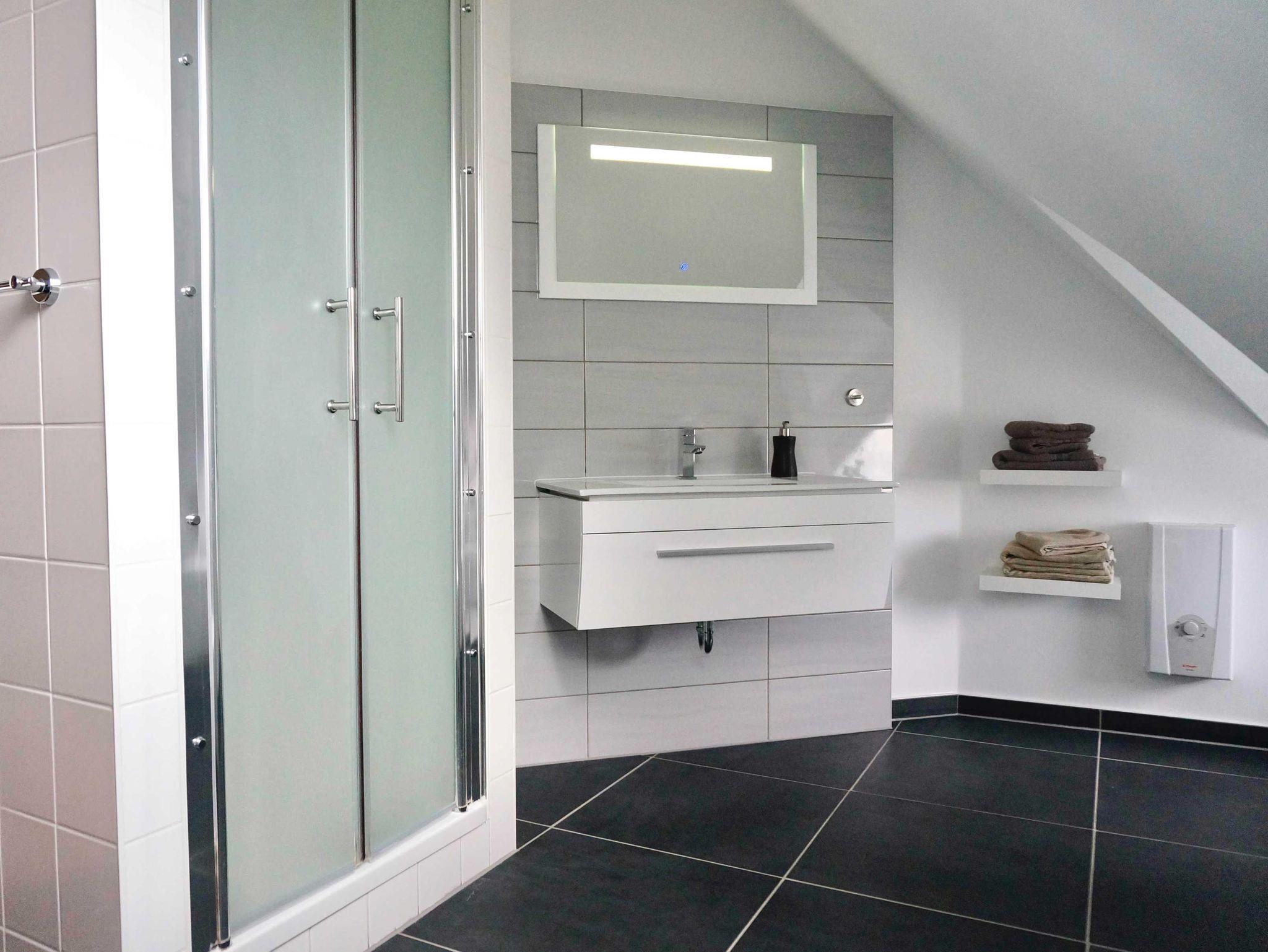 Die modern eingerichtete Ferienwohnung verfügt über ein geräumiges Wohnzimmer mit Schlafcouch (90x200), Flachbild-TV und einen gemütlichen Fernsehsessel, sowie über eine große Essecke für 4 Personen. Im offenen Schlafzimmer befindet sich ein Doppelbett (160x200) sowie ein Rollbett (90x200). Die offene Küche ist mit einem 2-flammigen Ceran-Kochfeld, Kühlschrank mit kleinem Gefrierfach, Mikrowelle, Wasserkocher, Toaster, Kaffeemaschine und Spüle ausgestattet. Das Bad verfügt über Dusche und WC.