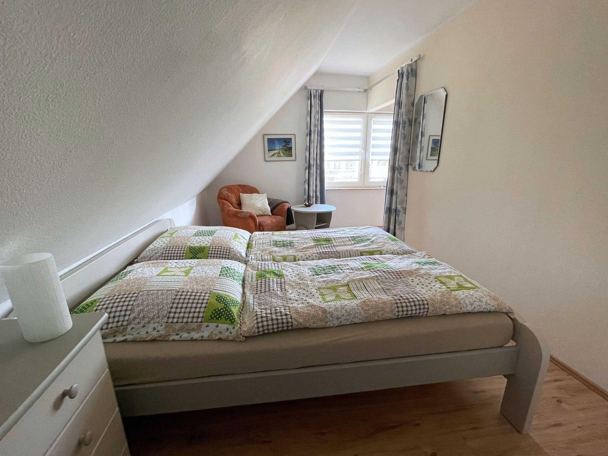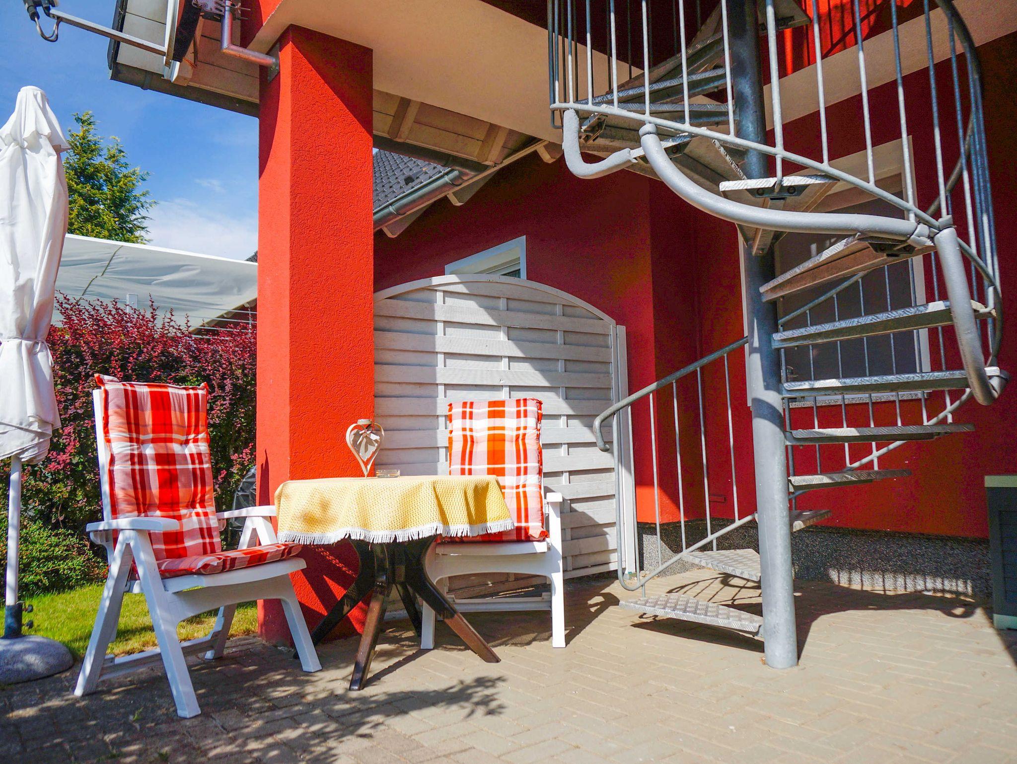 Die ganzjährig mietbare 45qm große Ferienwohnung befindet sich im Obergeschoss eines Einfamilienhauses in Kröslin. Der Zugang erfolgt von außen über eine Wendeltreppe.