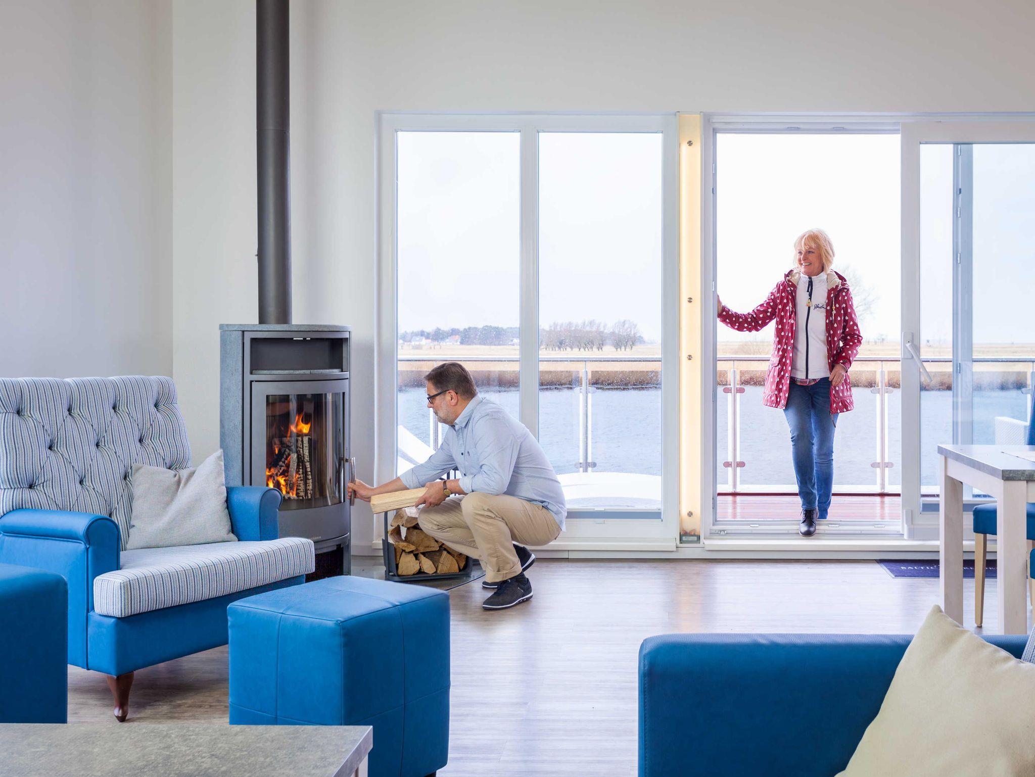 Erleben Sie Luxus und Natur in diesem modernen Floating-House mit Kamin und Sauna in der Marina Kröslin.