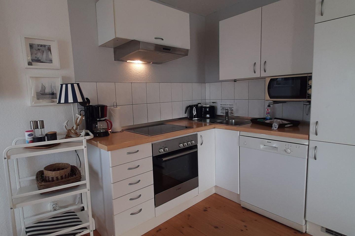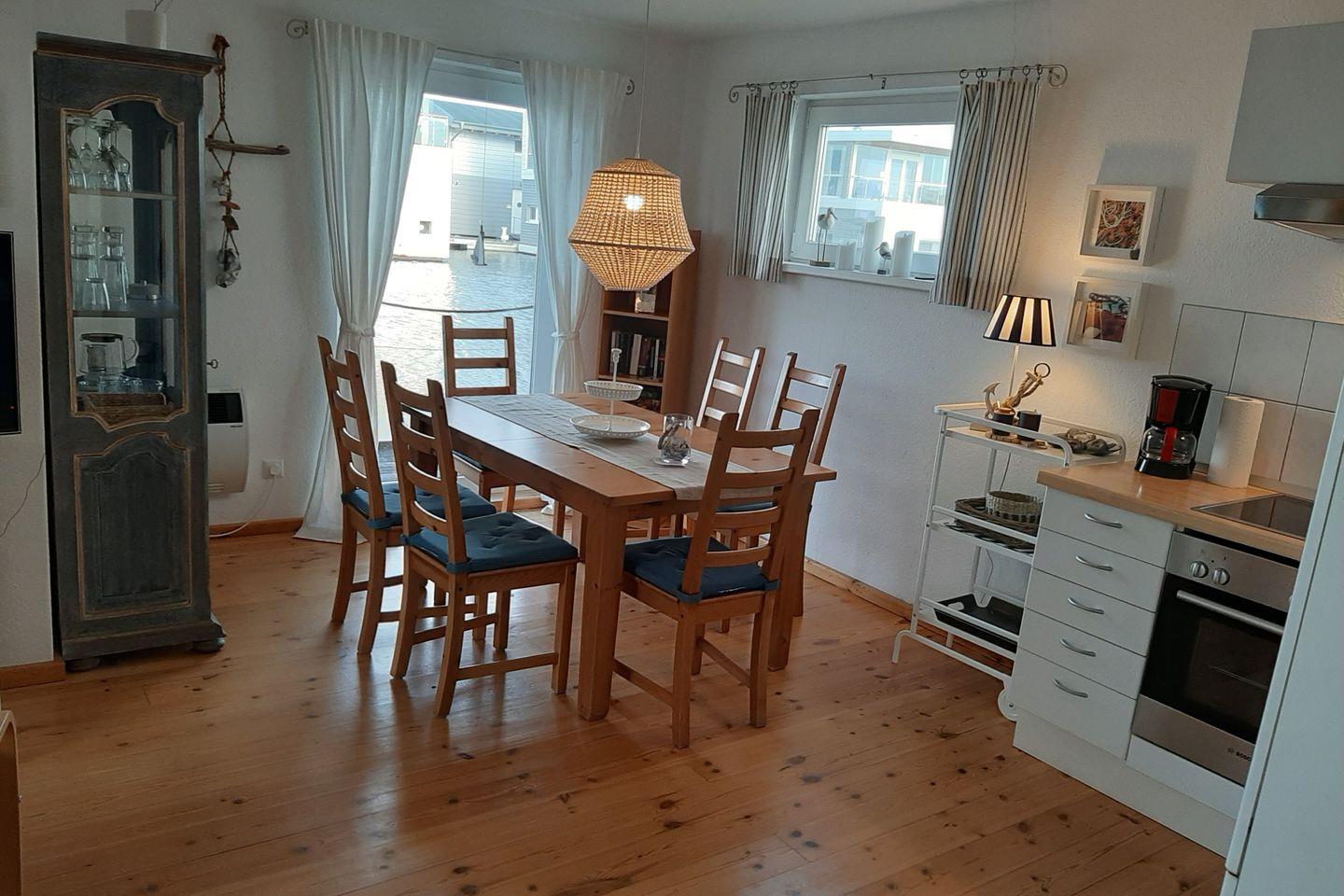 Im 1. Deck befindet sich das geräumige Wohnzimmer mit Essecke und Küchenzeile. Das Wohnzimmer ist modern-maritim eingerichtet mit einem Sofa und Schwing-Sessel mit Hocker-Kombination. Der Esstisch bietet Sitzgelegenheiten für bis zu 6 Personen, ein Kinderhochstuhl steht Ihnen kostenlos zur Verfügung.An das Wohnzimmer schließt sich eine Terrasse an, hier stehen 4 Gartenstühle und ein Tisch für Sie bereit.