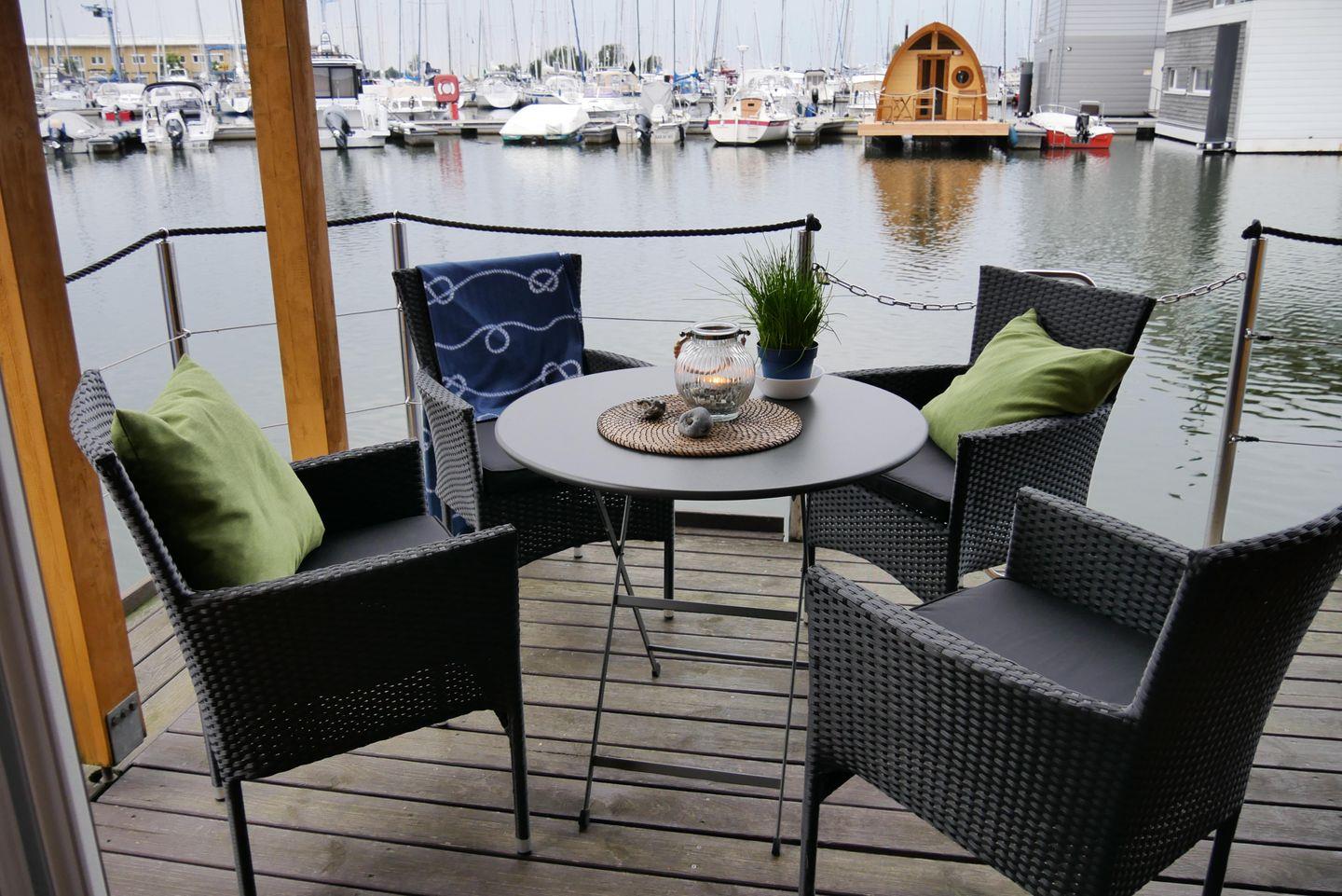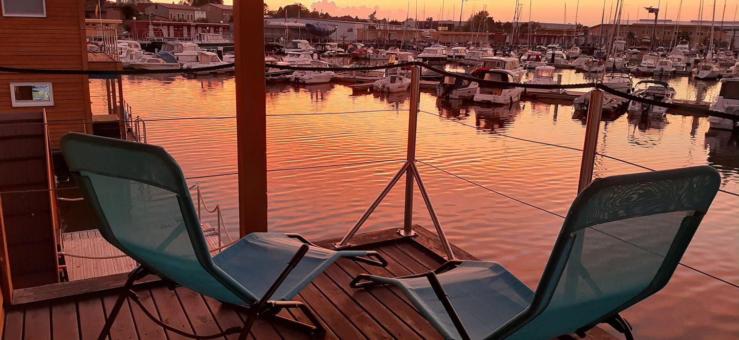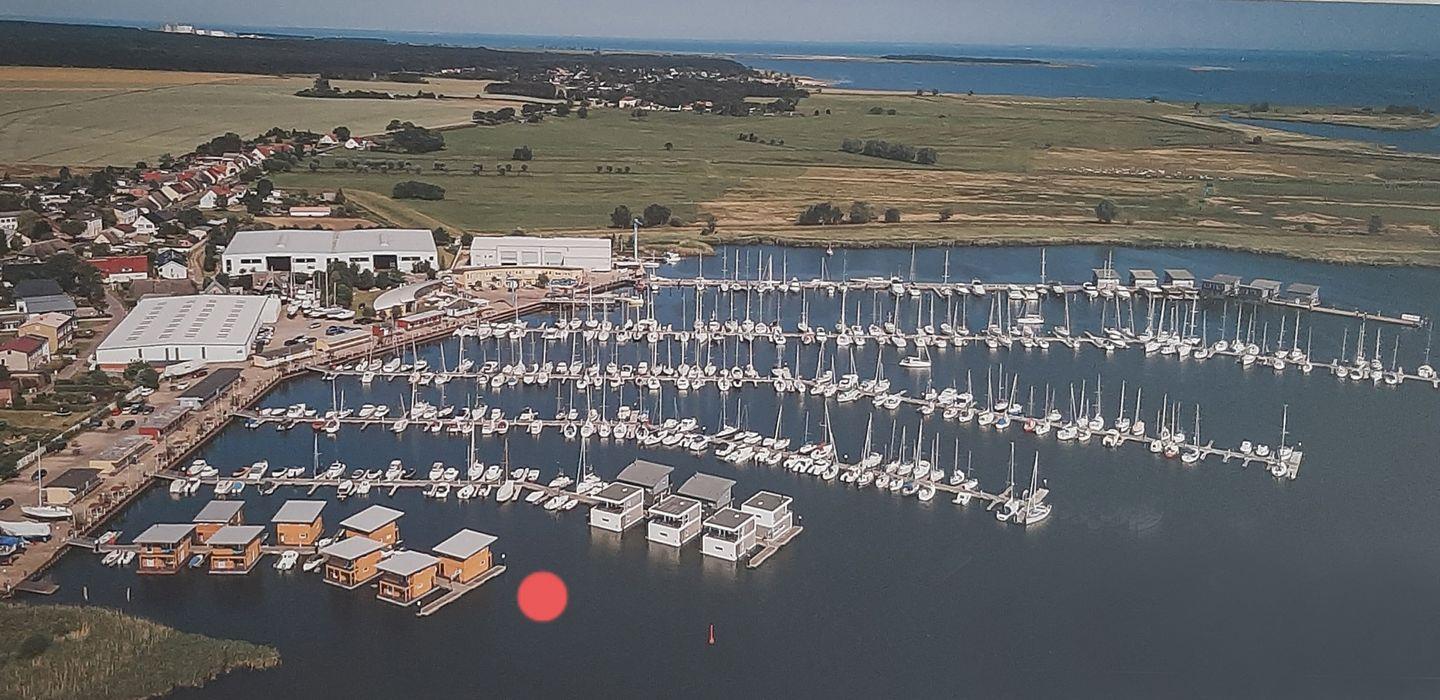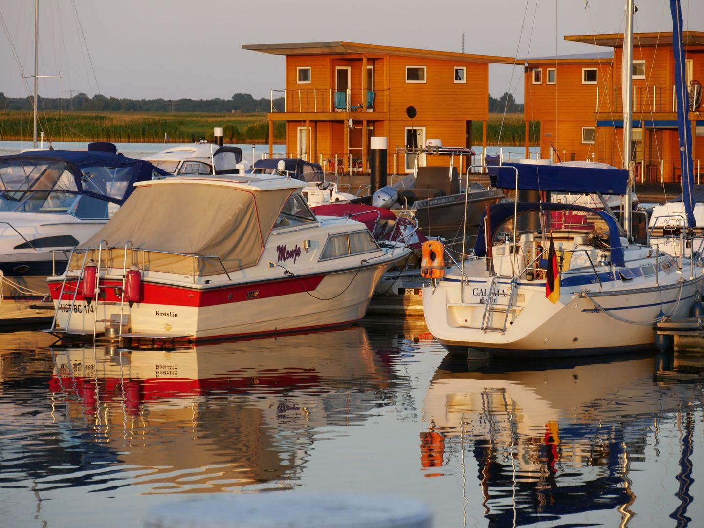 Komfortable Floating Houses im Krösliner Yachthafen mit Blick auf Bodden und Ostsee, ideal für Wassersport und Entspannung.