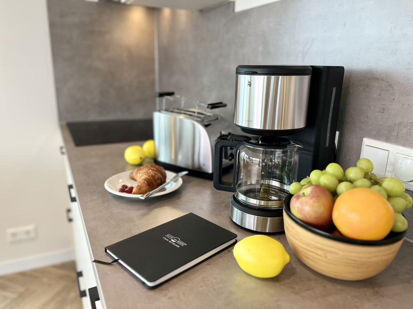 Die offene Küche ist zum Wohnzimmer hin gestaltet und umfassend ausgestattet: Ceran-Herd, Kühlschrank mit Gefrierfach, Spülmaschine, Kaffeemaschine, Wasserkocher und Toaster stehen bereit, ebenso Küchenutensilien, Geschirr und Besteck sowie Geschirrhandtücher. Für entspannte Mahlzeiten im Freien nutzen Sie die überdachte Terrasse mit Gartenmöbeln und Sonnenschutz; Sonnenliegen laden zum Verweilen ein. Ein Elektrogrill ergänzt die Möglichkeiten für unkomplizierte Abende.