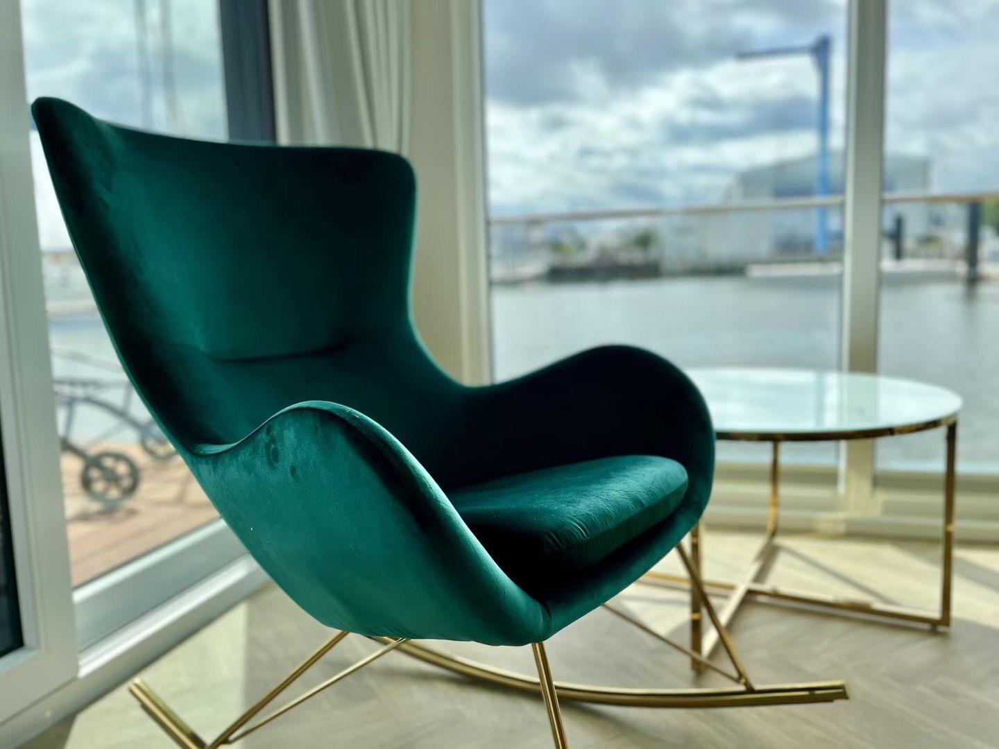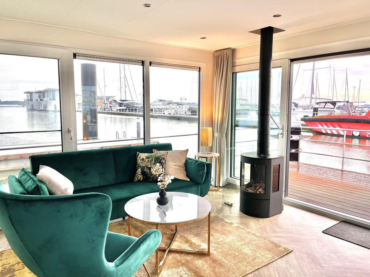 Floatinghouse Design I in Kröslin: freistehendes Hausboot mit 44 m², 3 Zimmern, 2 Schlafzimmern und Platz für 4 Personen. Offene Küche zum Wohnzimmer mit Ceranherd, Spülmaschine und Kaffeemaschine, dazu WLAN, TV, Radio sowie Klima und Heizung. Überdachte Terrasse mit Gartenmöbeln und Sonnenliegen, direkt auf dem See mit See- und Landschaftsblick. Nicht-Raucher, kinderfreundlich, mit Kamin/Ofen.