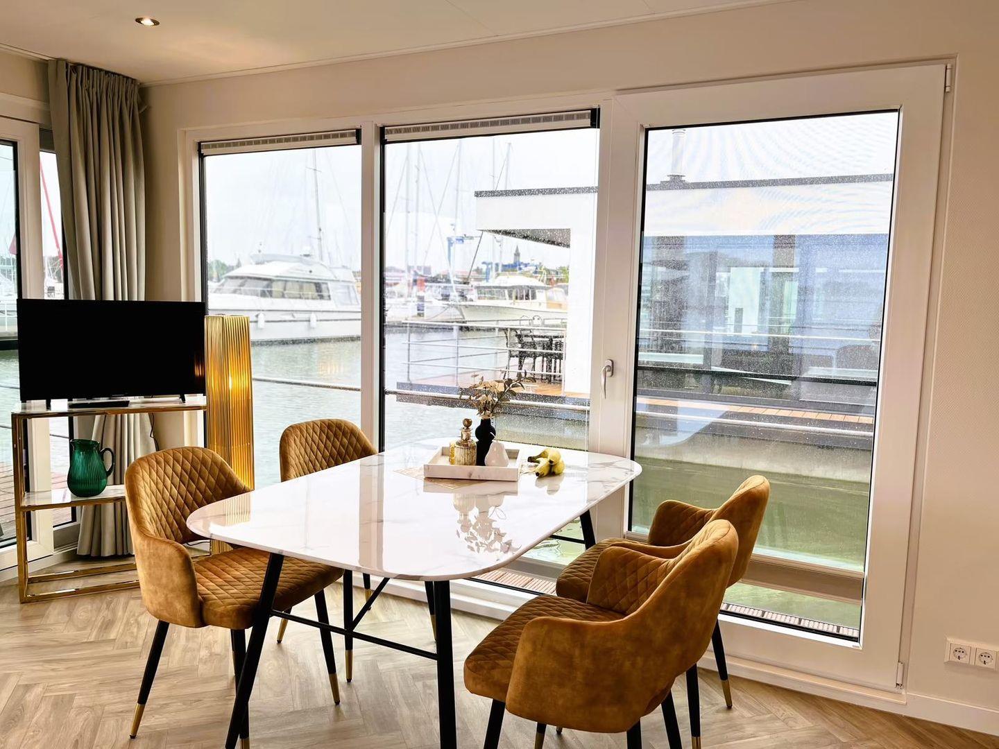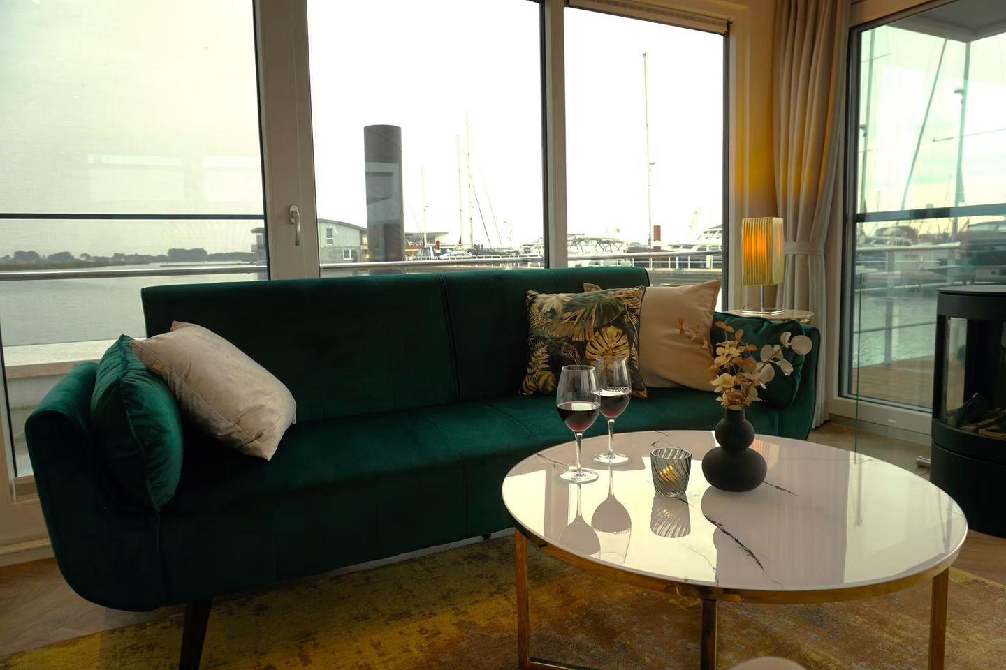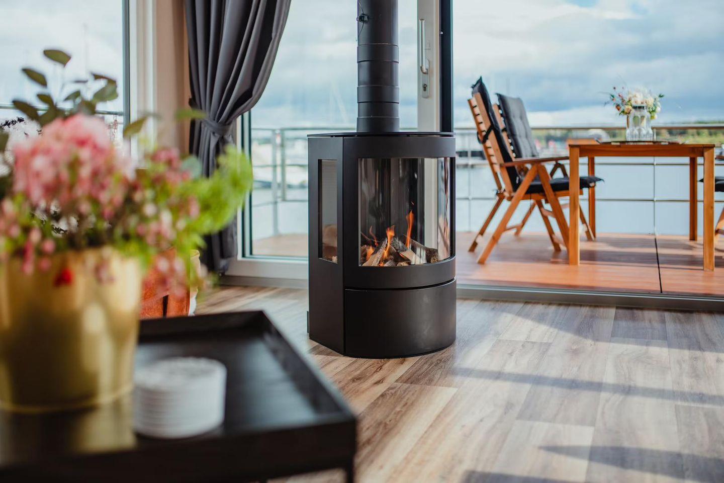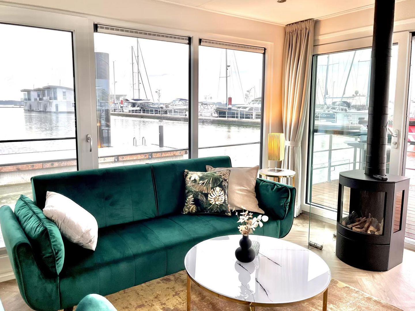 Floatinghouse Design II: Stilvolles Hausboot am See mit Seeblick & Kamin