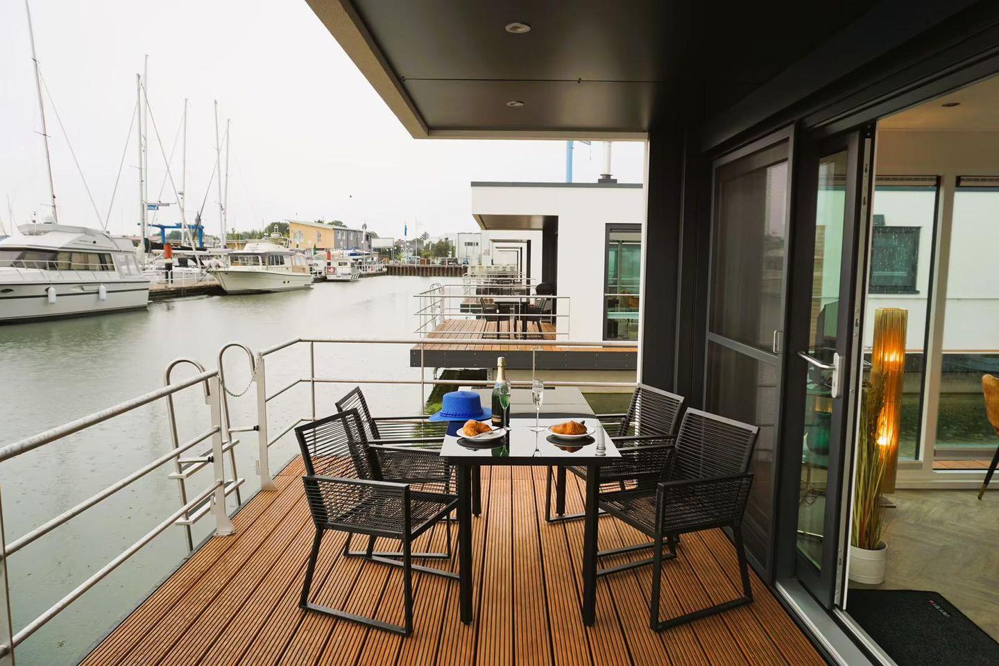 Floatinghouse Design IV in Kröslin: freistehendes, klimatisiertes Nichtraucher-Ferienhaus auf dem Wasser (44 m²) mit 3 Zimmern, 2 Schlafzimmern und 1 Bad für bis zu 4 Personen. Offene Küche zum Wohnzimmer mit Ceranherd, Spülmaschine und kompletter Ausstattung. Überdachte Terrasse mit Gartenmöbeln, Sonnenliegen und Elektrogrill, Steg direkt auf dem See mit See- und Landschaftsblick. WLAN, TV/Radio, Kamin/Ofen, Fliegengitter und Sichtschutz vorhanden. Kinder willkommen.