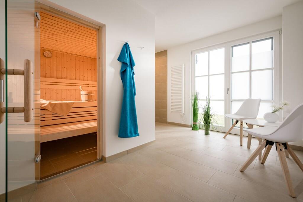 Parterre: (Wohn-/Schlafzimmer(Schlafcouch 1 Pers., TV, Esstisch, Blu-ray-Player, Radio, Kochplatte, Wasserkocher, Toaster, Kaffeemaschine, Backofen, Grill, Mikrowelle, Spülmaschine, Kühlschrank, Tiefkühlschrank, Heizung, Sonnenschirm, Gesellschaftsspiele), Toilette(Waschbecken, Toilette, ), Sauna(Dusche, Sauna), Abstellraum(Trockner, Babybett, Waschmaschine, Hochstuhl, Bügelbrett, Bügeleisen, Trockenschrank)) In der 1. Etage: (Schlafzimmer(Doppelbett, TV, Heizung), Schlafzimmer(Doppelbett, TV, Heizung), Schlafzimmer(Doppelbett, TV, Heizung), Schlafzimmer(Doppelbett, TV, Heizung), Badezimmer(Badewanne, Dusche, Waschbecken, Toilette, Heizung)) Terrasse, Terrasse, Garten, Gartenmöbel, Gartenmöbel, Gartenmöbel, Sonnenschirm, Sonnenschirm