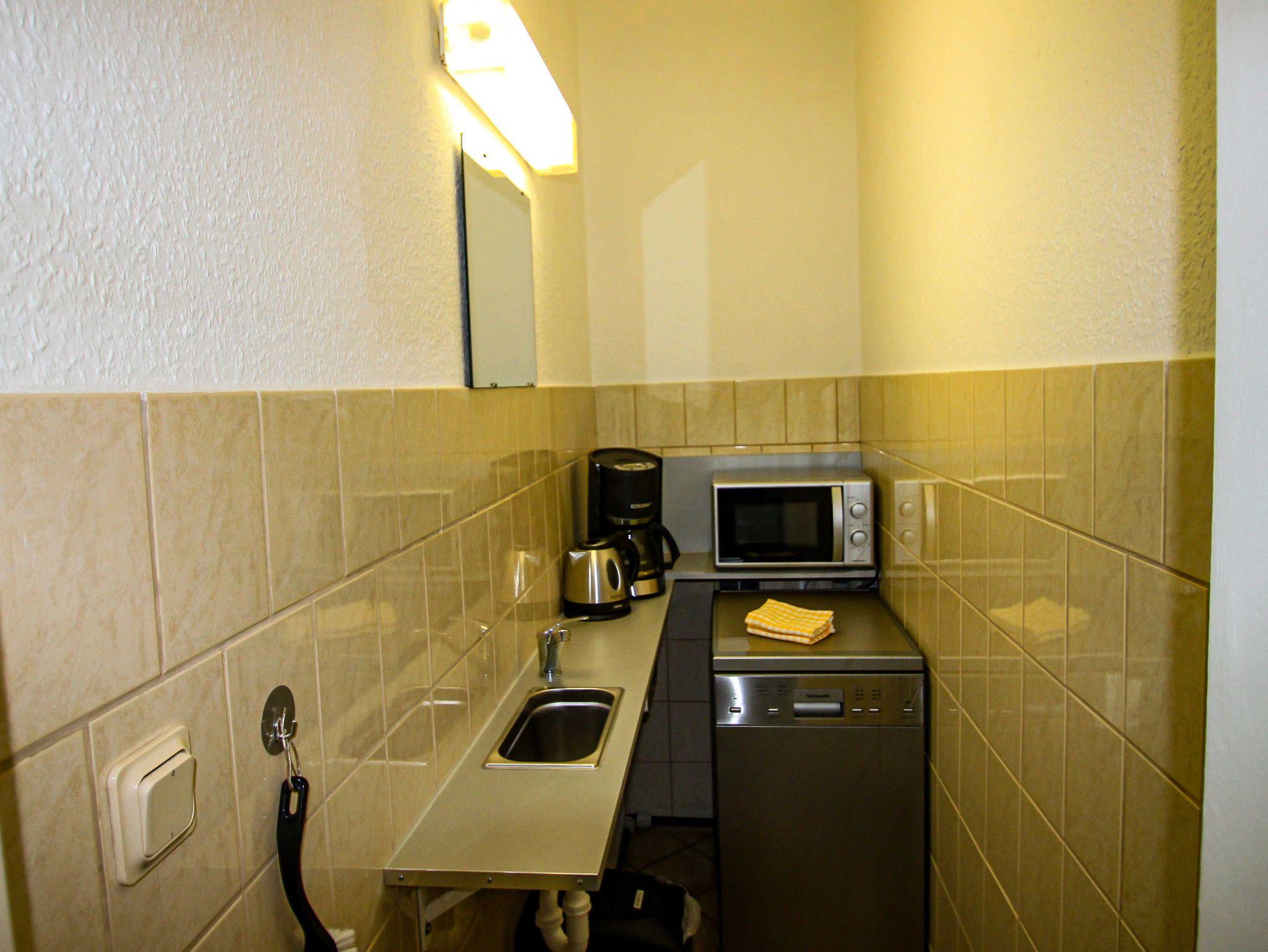 Im Erdgeschoss befindet sich die ca. 41 m² große Ferienwohnung Spatzennest mit Fußbodenheizung. Das offen gestaltete Studio bietet Platz für bis zu zwei Personen und verbindet Wohn-, Schlaf- und Essbereich in einer angenehmen, klaren Atmosphäre. Der kombinierte Wohn- und Schlafbereich ist mit zwei Einzelbetten (90 × 200 cm, zusammenstellbar), einem Schlafsofa (120 × 190 cm), TV, Essecke sowie einem Schreibtisch ausgestattet. Die offene Küche verfügt über ein Duokochfeld, Kühlschrank, Toaster, Eierkocher und ausreichend Geschirr. Ergänzend steht eine kleine, separate Teeküche mit Geschirrspüler, Mikrowelle, Kaffeemaschine und Wasserkocher zur Verfügung. Ein Bad mit Dusche und WC rundet die Wohnung ab.