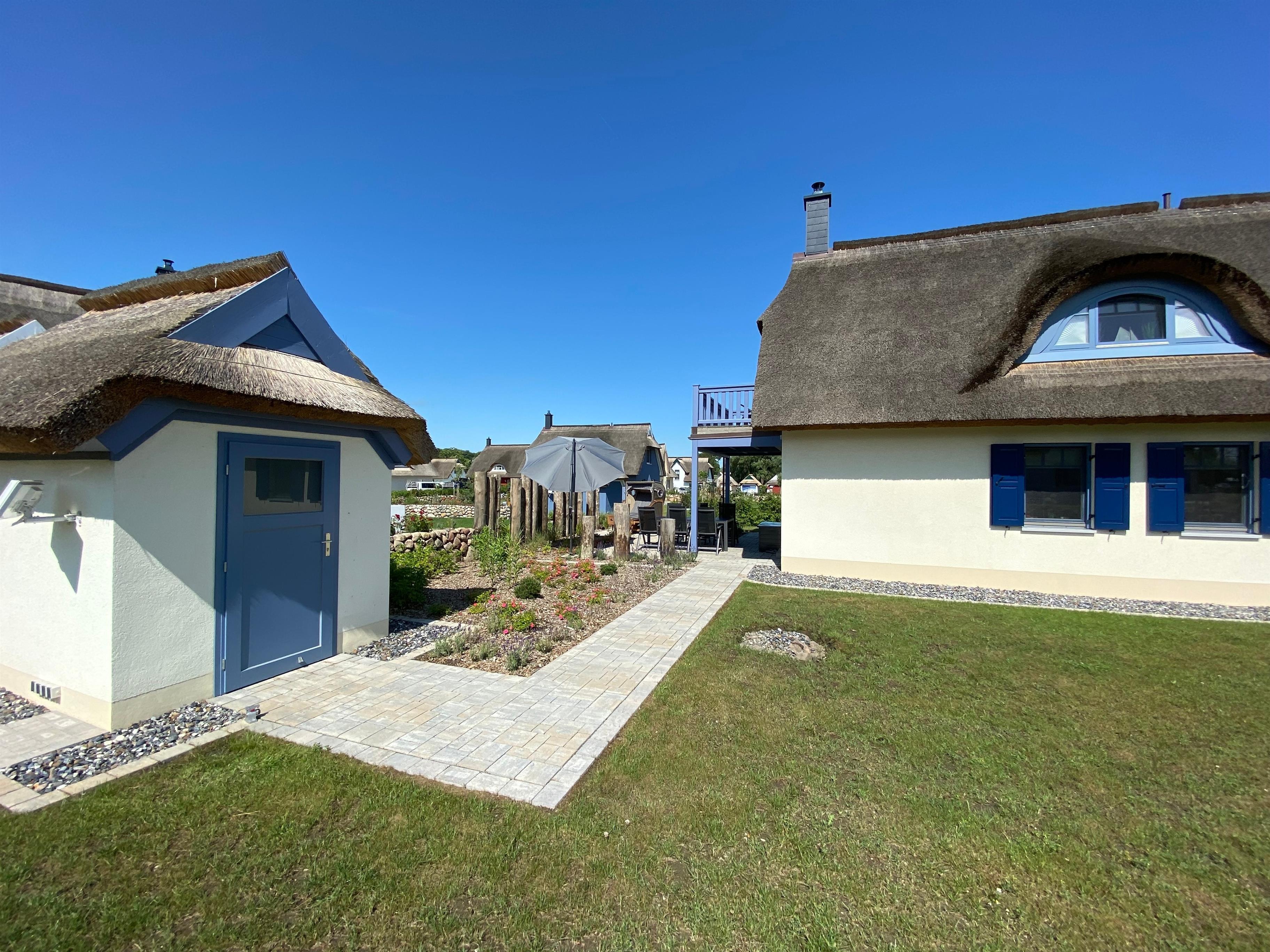 Wunderschönes Reetdach-Ferienhaus “Zeit zum Ankern“ für 1 – 4 (6) Personen + 1 Babybett + optional Schlafcouch (Aufbettung für 2 Personen) mit Sauna, Kamin, Grill, eigener Garten, Terrasse mit Sitzmöbeln und Strandkorb,