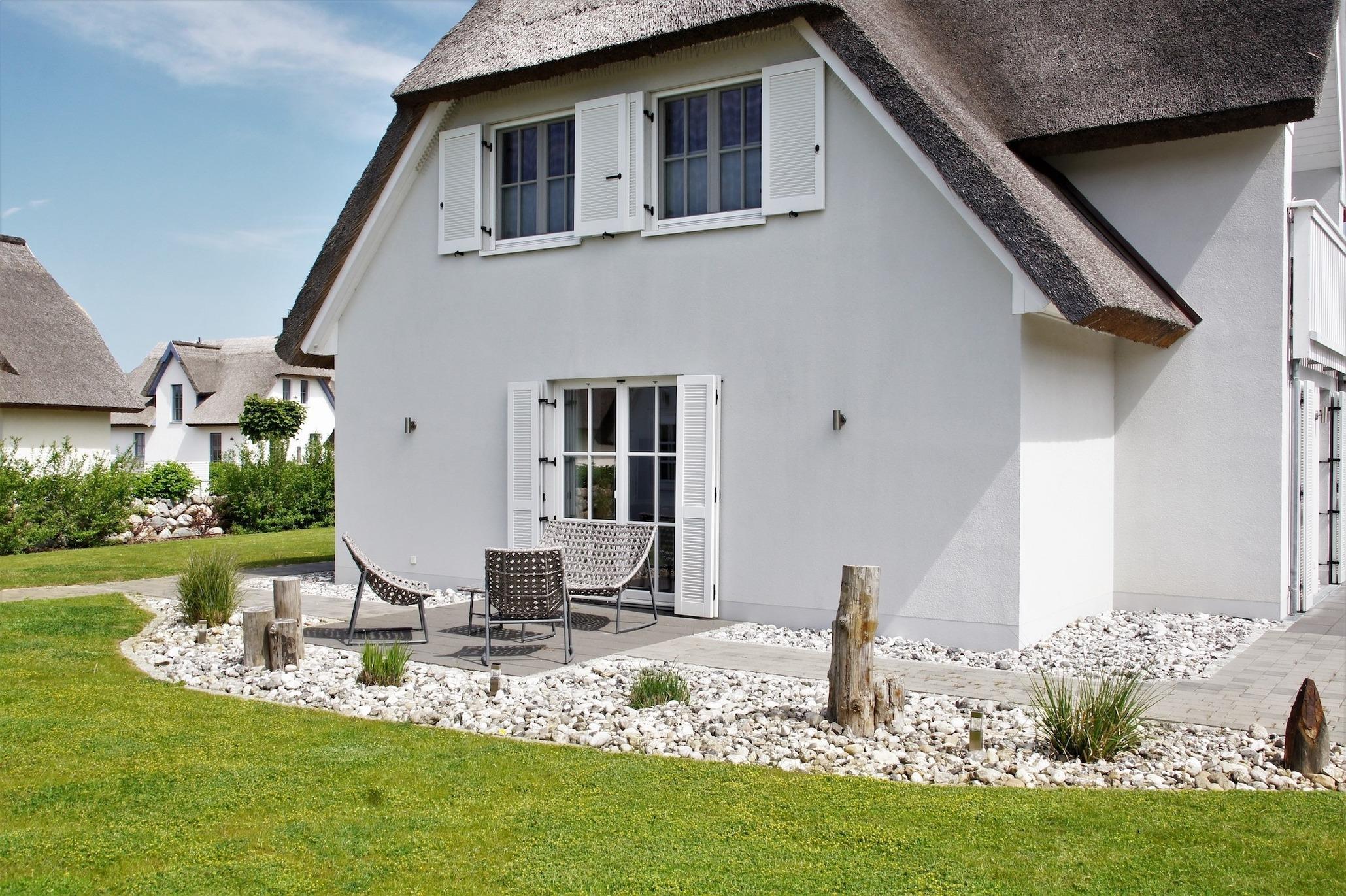 Wunderschönes Reetdach-Ferienhaus in einer liebevoll gestalteten Ferienhaussiedlung mit Sauna, Kaminofen, Balkon mit kleinem Wasserblick aus der zweiten Häuserreihe, Holzkohlegrill, schöner Garten mit 2 Terrassen,Strandkorb und Gartenmöbeln, 3 Schlafzimmer, max. 6 Personen, großer Wohn- Essbereich, 2 Bäder, Fußbodenheizung, gehobene Ausstattung mit moderner, geschmackvoller Einrichtung, HiFi-System, W-Lan, Waschmaschine, Trockner, PKW-Stellplätze am Haus