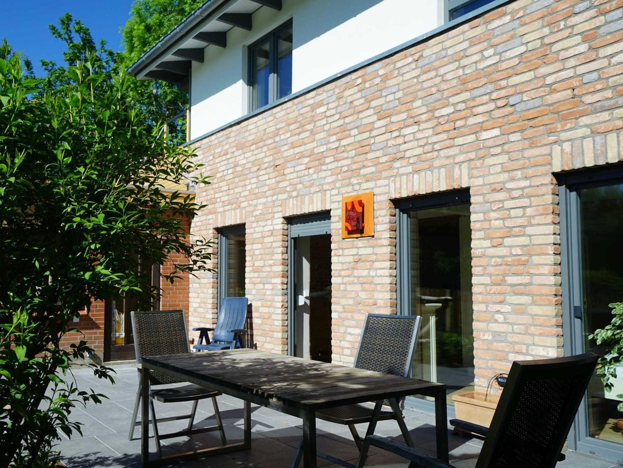 • Terrasse in Südost Ausrichtung mit Sitzmöbeln, Sonnenschirm, 2 Sonnenliegen und Grill
