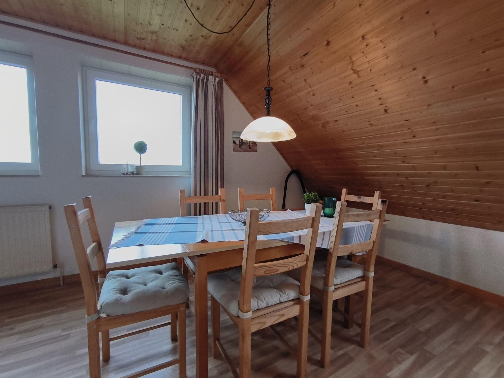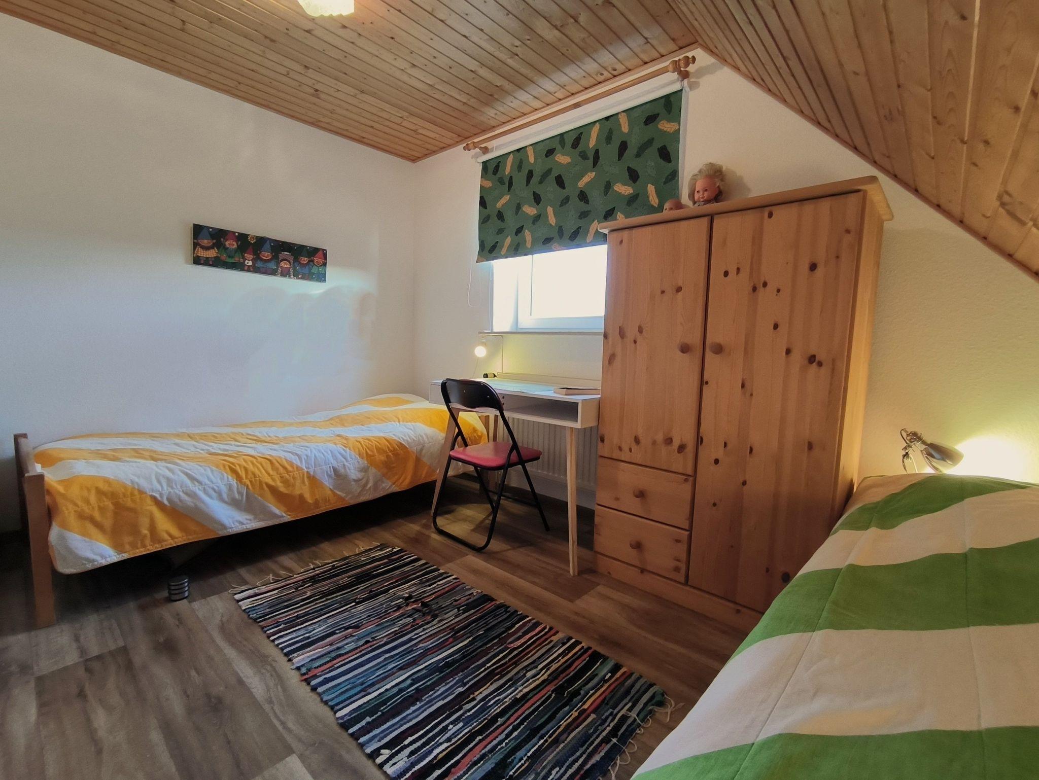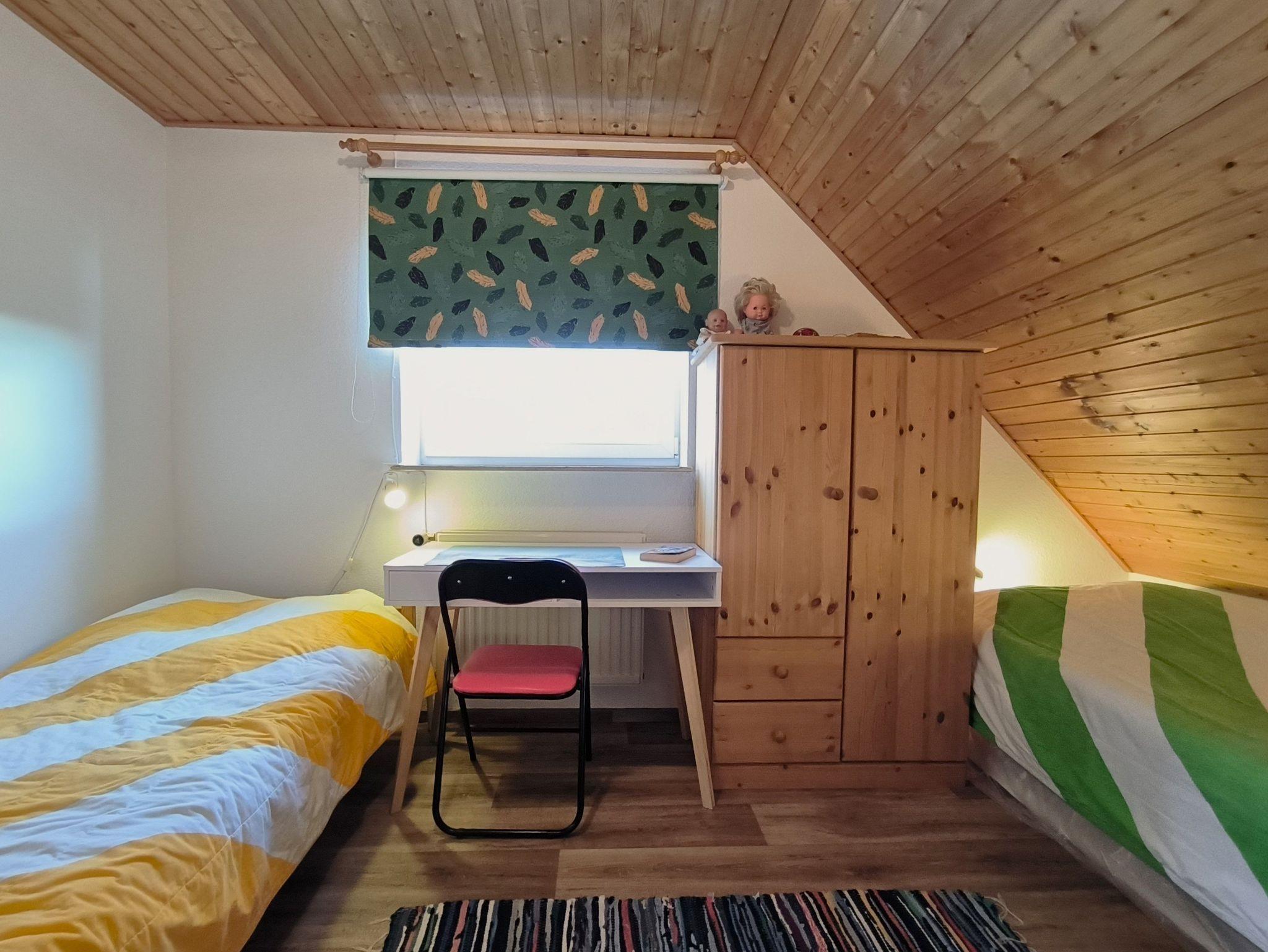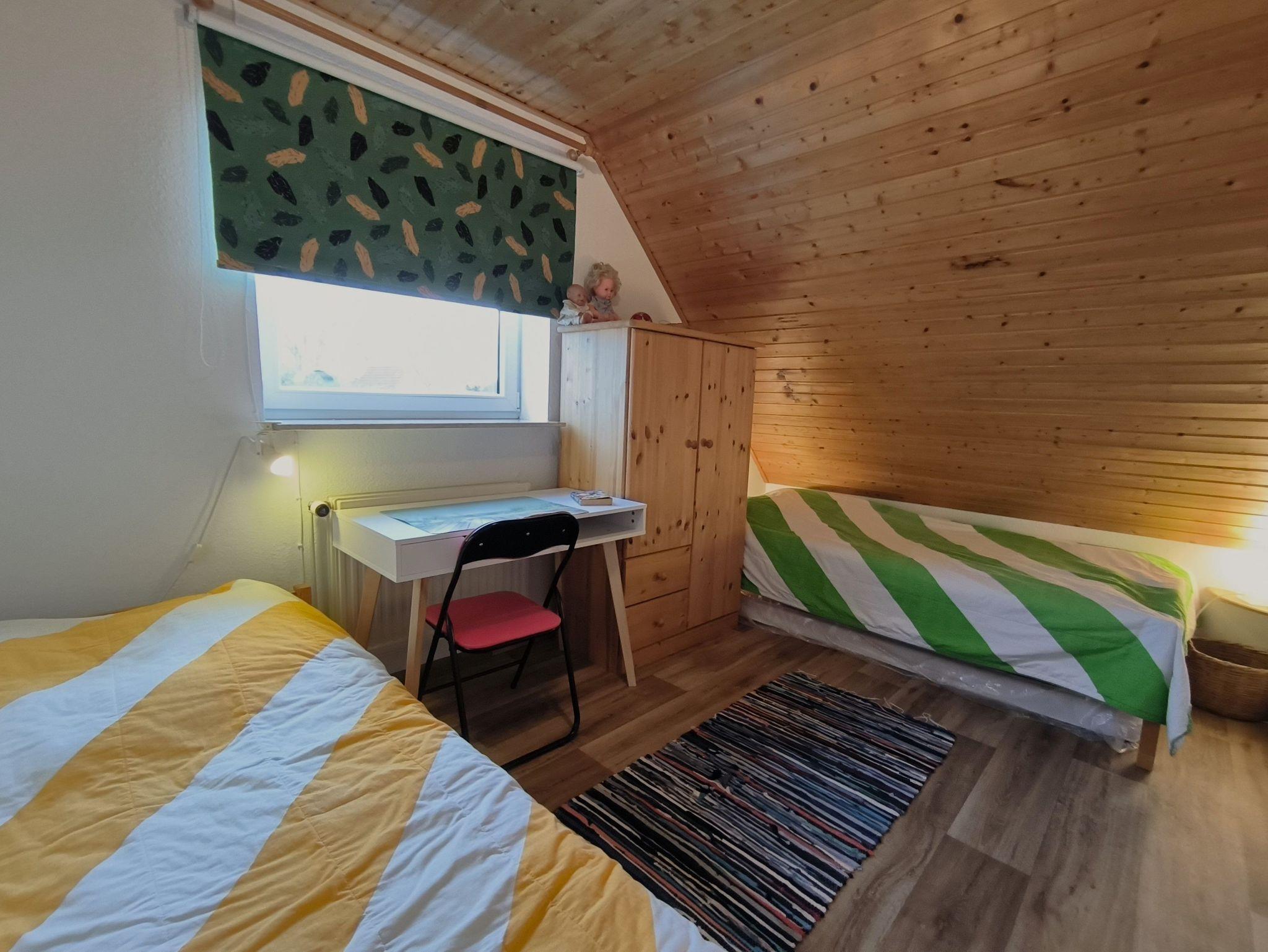 Die Ferienwohnung im Obergeschoss besteht aus einem gemütlichen Wohnzimmer mit offener Küche, zwei Schlafzimmern, einem Duschbad und dem Flur. Das große Schlafzimmer verfügt über ein Doppelbett, einen Kleiderschrank und ein Kinderbett (bis ca. 3 Jahre), in dem kleineren Schlafzimmer stehen zwei Einzelbetten, ein Kleiderschrank und ein Schreibtisch. Beide Schlafzimmer sind verdunkelbar und liegen sehr ruhig. Im Wohnzimmer gibt es eine Sitzecke mit TV, einen großen Esstisch und eine Küchenzeile mit Kühlschrank, Herd, Backofen, Spüle und ausreichend Küchenutensilien zum Zubereiten von leckeren Urlaubsmahlzeiten. Eine Spülmaschine ist nicht vorhanden. Das Bad mit Fenster hat eine Dusche, eine Toilette und einen Waschtisch - ein Föhn ist auch vorhanden. Eine Waschmaschine im Erdgeschoss kann von allen Gästen gegen eine kleine Gebühr genutzt werden, auch Fahrräder zum Leihen und der Grill und die Sitzecken im Garten stehen allen Feriengästen zur Verfügung. Die Betten sind bei Ankunft bereits bezogen und Handtücher sind ebenso vorhanden.