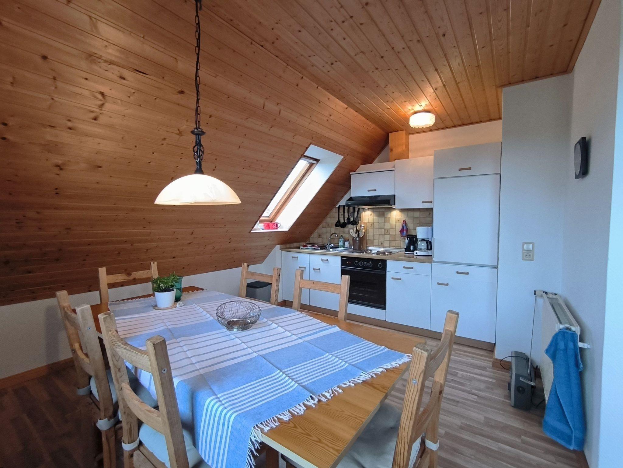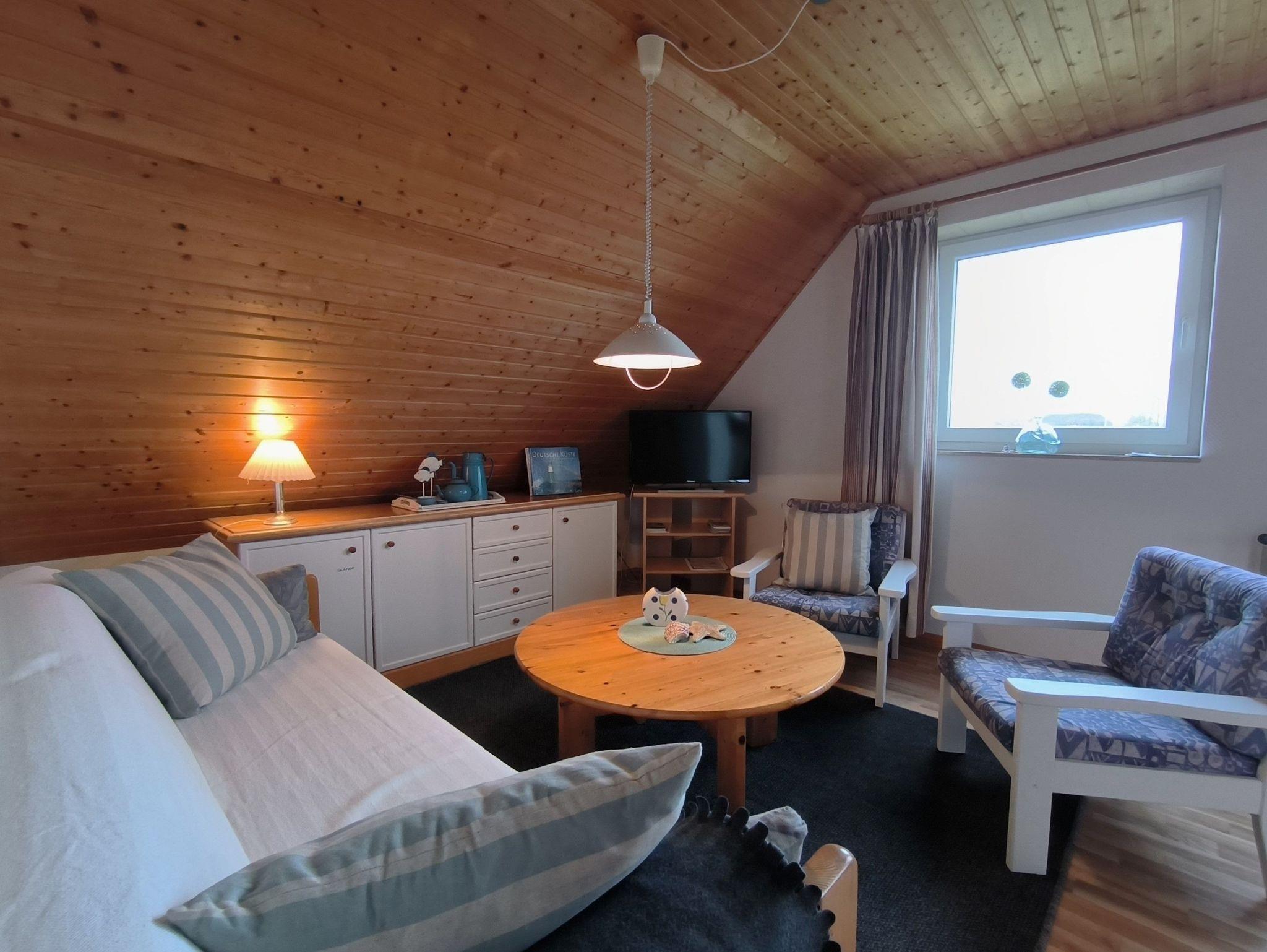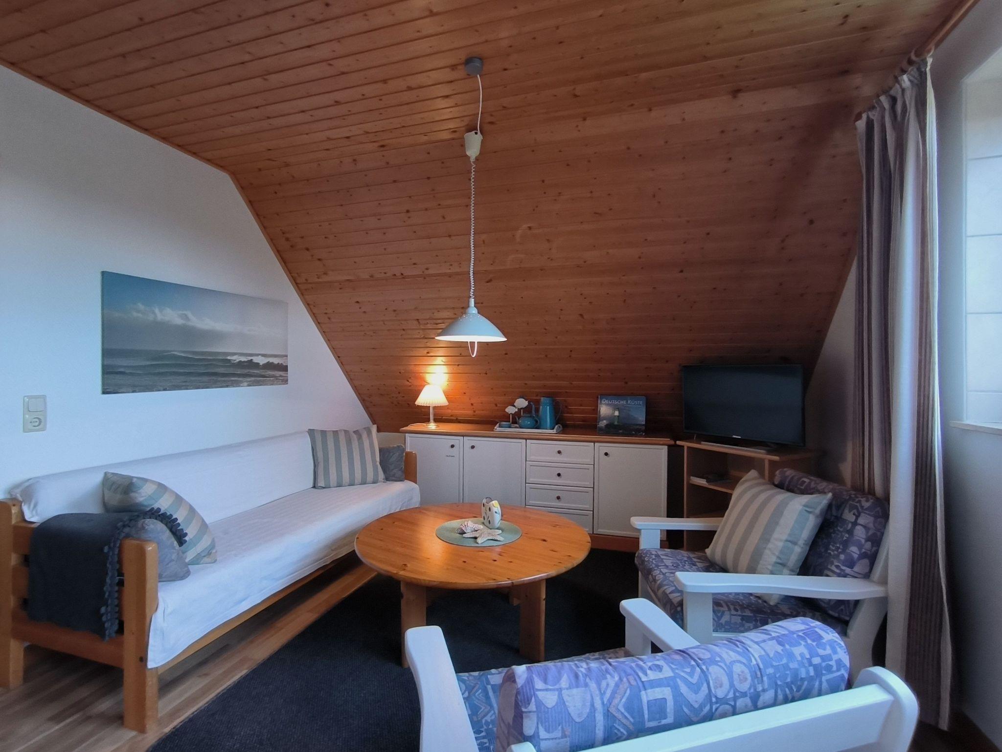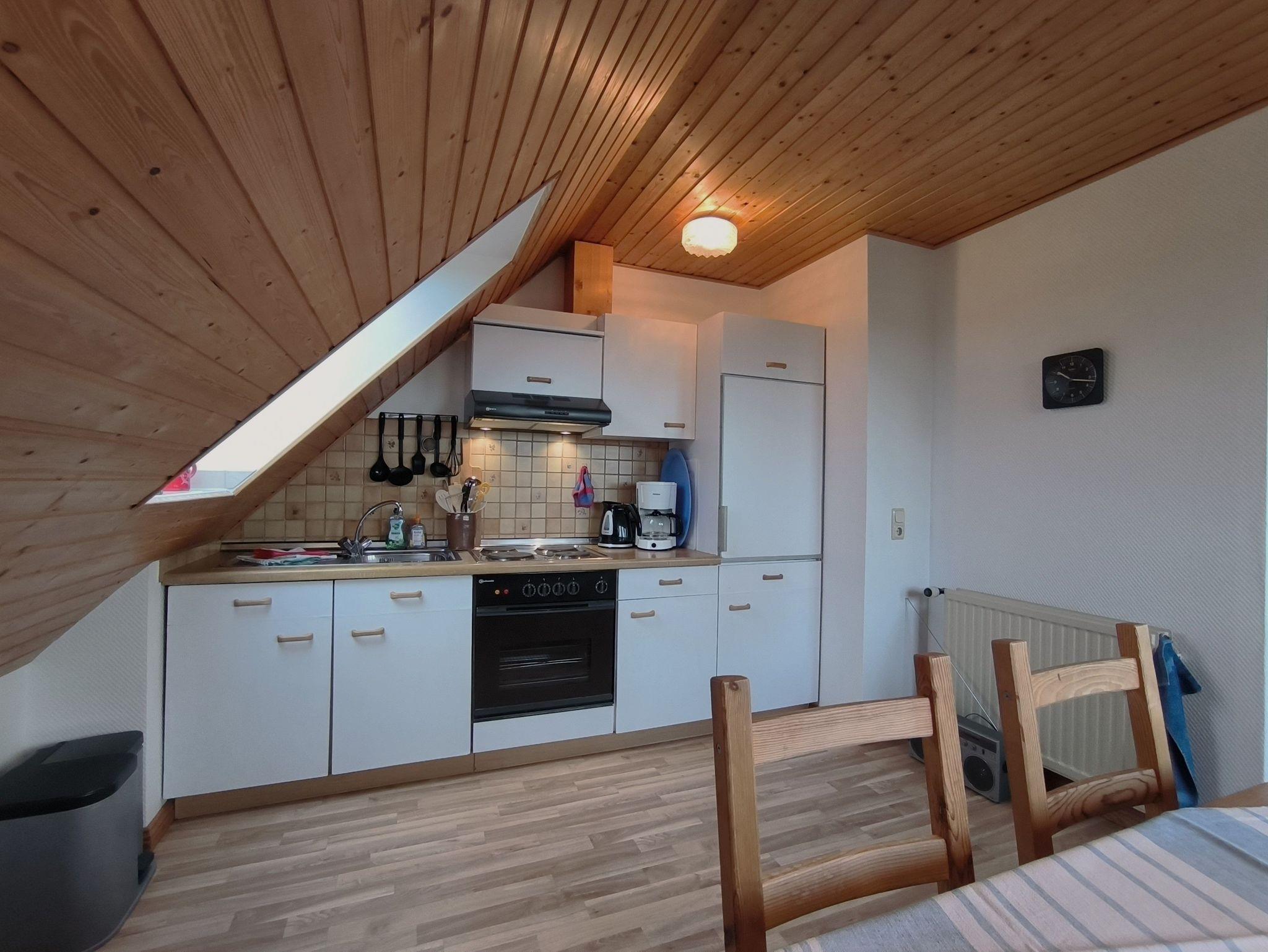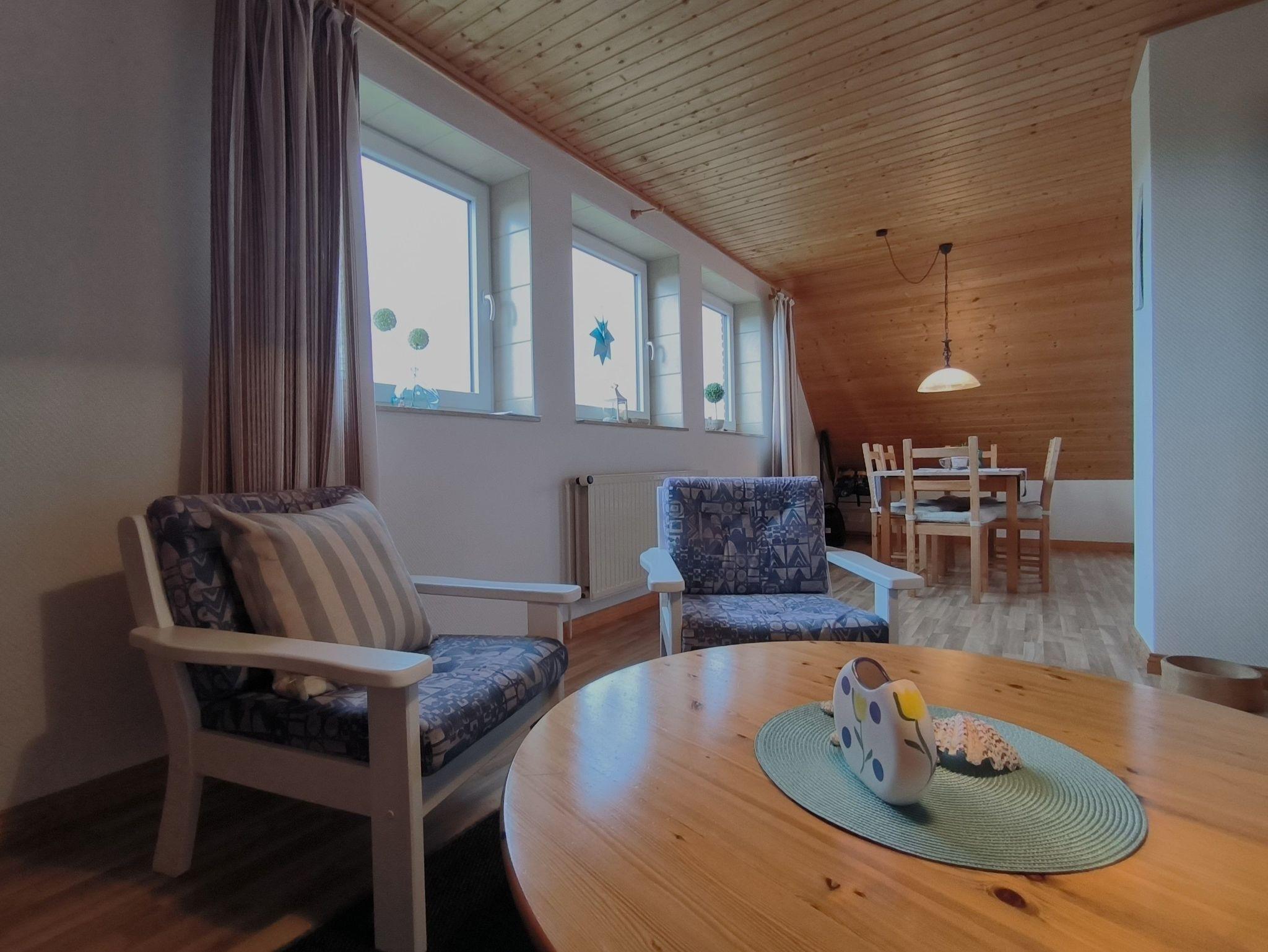 Die Ferienwohnung im Obergeschoss besteht aus einem gemütlichen Wohnzimmer mit offener Küche, zwei Schlafzimmern, einem Duschbad und dem Flur. Das große Schlafzimmer verfügt über ein Doppelbett, einen Kleiderschrank und ein Kinderbett (bis ca. 3 Jahre), in dem kleineren Schlafzimmer stehen zwei Einzelbetten, ein Kleiderschrank und ein Schreibtisch. Beide Schlafzimmer sind verdunkelbar und liegen sehr ruhig. Im Wohnzimmer gibt es eine Sitzecke mit TV, einen großen Esstisch und eine Küchenzeile mit Kühlschrank, Herd, Backofen, Spüle und ausreichend Küchenutensilien zum Zubereiten von leckeren Urlaubsmahlzeiten. Eine Spülmaschine ist nicht vorhanden. Das Bad mit Fenster hat eine Dusche, eine Toilette und einen Waschtisch - ein Föhn ist auch vorhanden. Eine Waschmaschine im Erdgeschoss kann von allen Gästen gegen eine kleine Gebühr genutzt werden, auch Fahrräder zum Leihen und der Grill und die Sitzecken im Garten stehen allen Feriengästen zur Verfügung. Die Betten sind bei Ankunft bereits bezogen und Handtücher sind ebenso vorhanden.