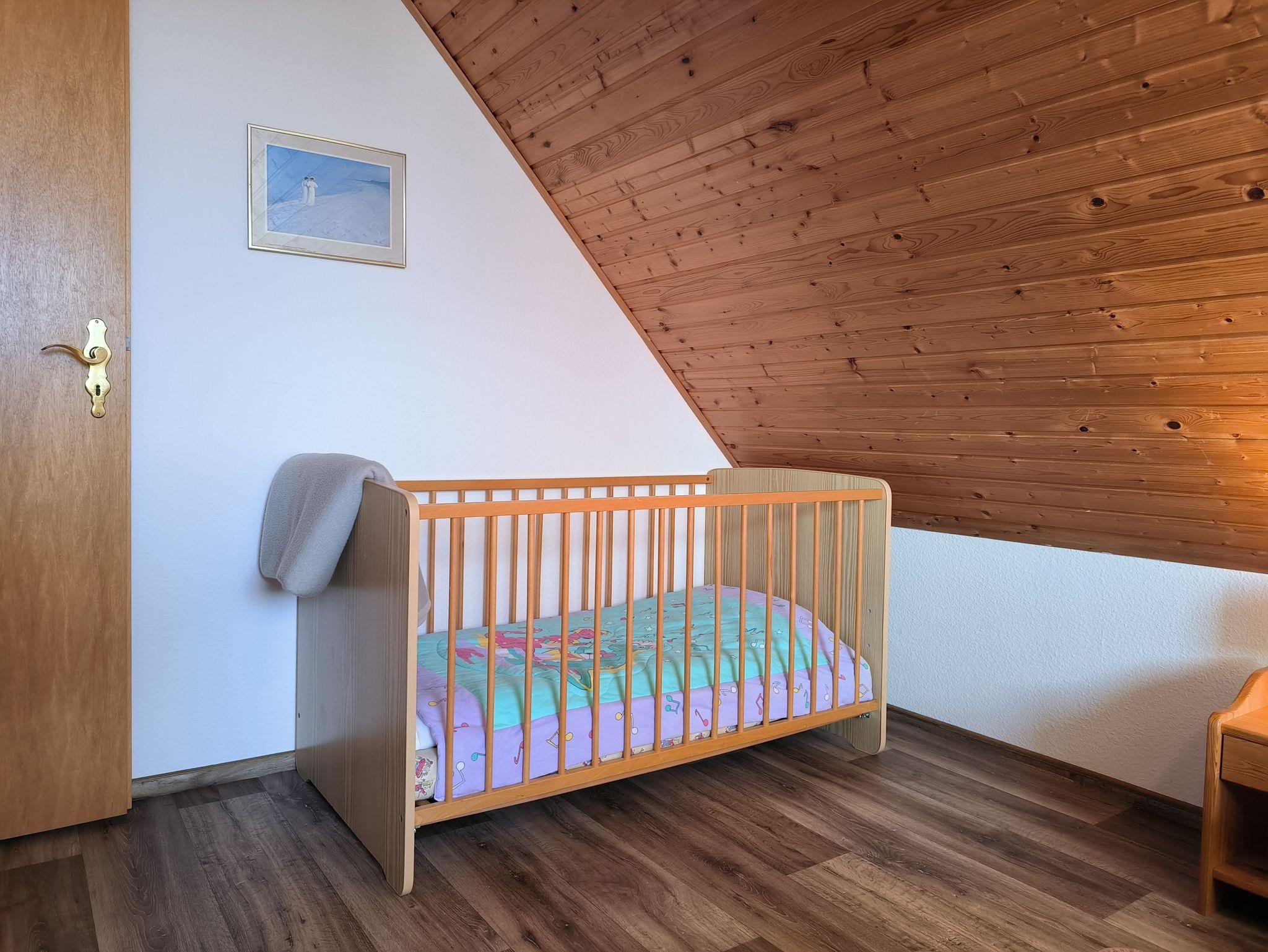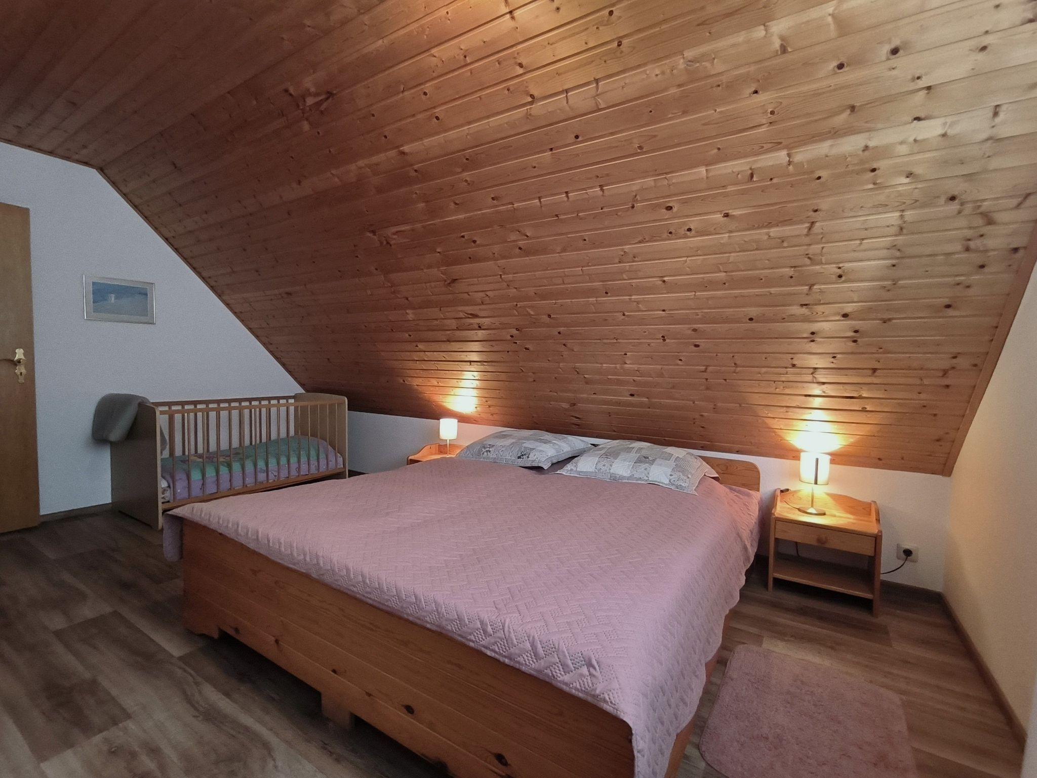 Die Ferienwohnung im Obergeschoss ist mit 80 qm sehr geräumig und verfügt über vier vollwertige Schlafplätze in zwei Schlafzimmern. Ebeneso ist ein Kinderbett im großen Schlafzimmer mit Doppelbett vorhanden, auf Anfrage kann eine weitere Person (Kind) untergebracht werden. Es gibt einen großen Wohn- und Essbereich mit Küchenzeile sowie ein Duschbad in der Ferienwohnung, die Gäste dürfen den teilwiese eingezäunten und rundherum blickdicht bewachsenen Garten mit verschiedenen Sitzgelegenheiten und einem Grill nutzen.