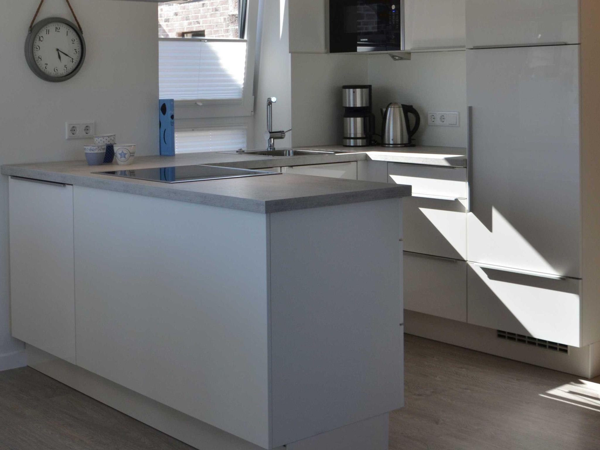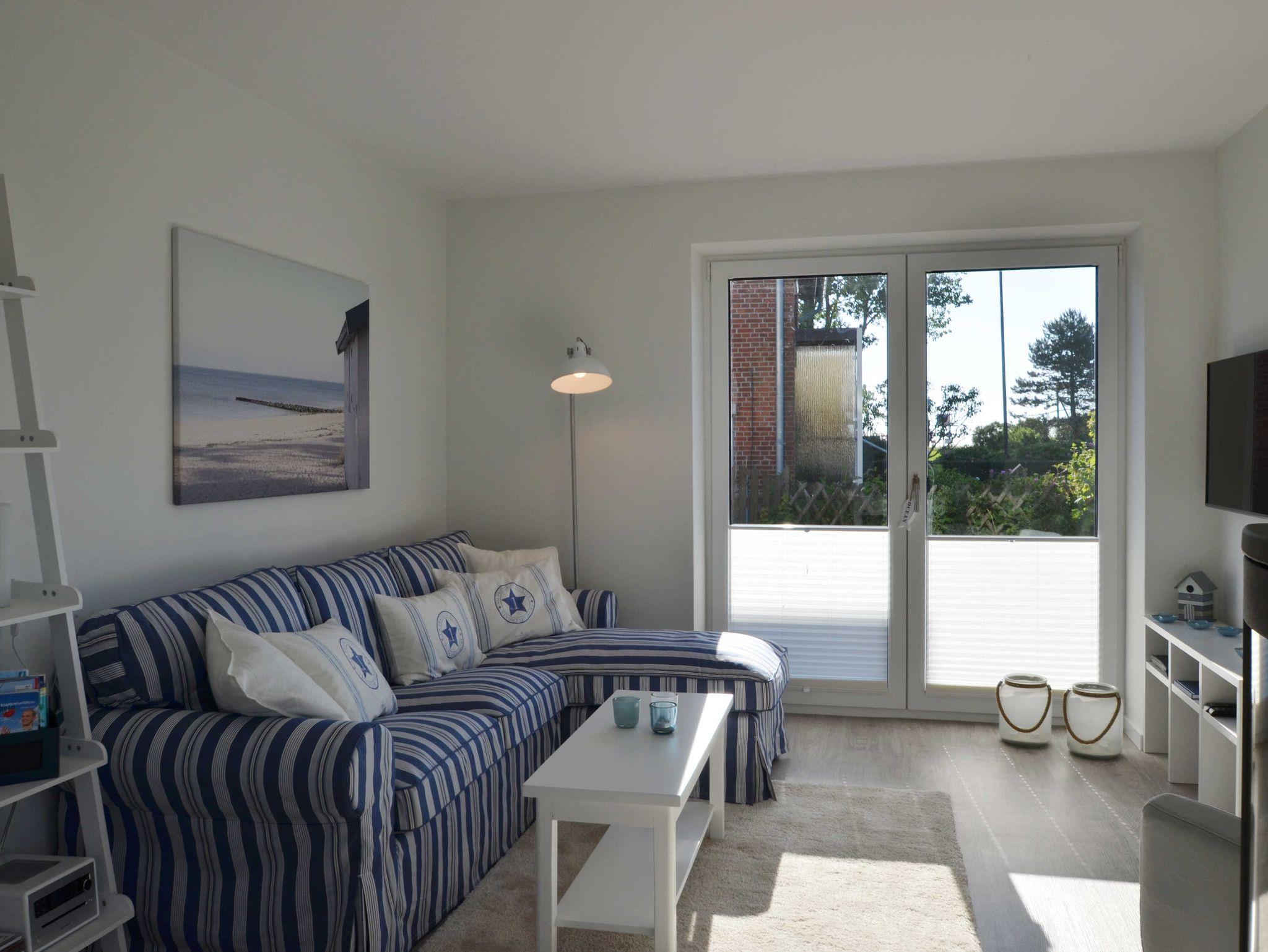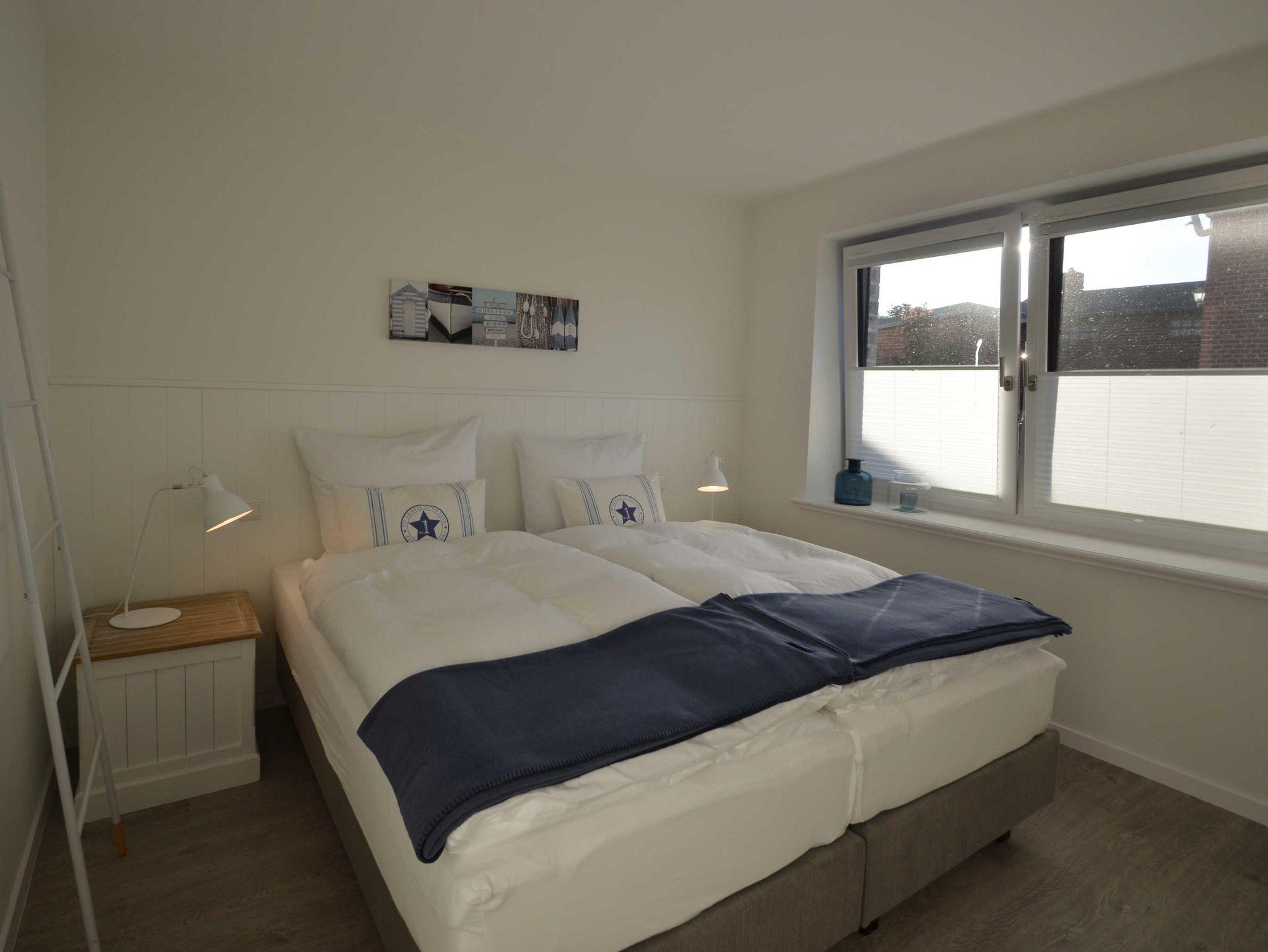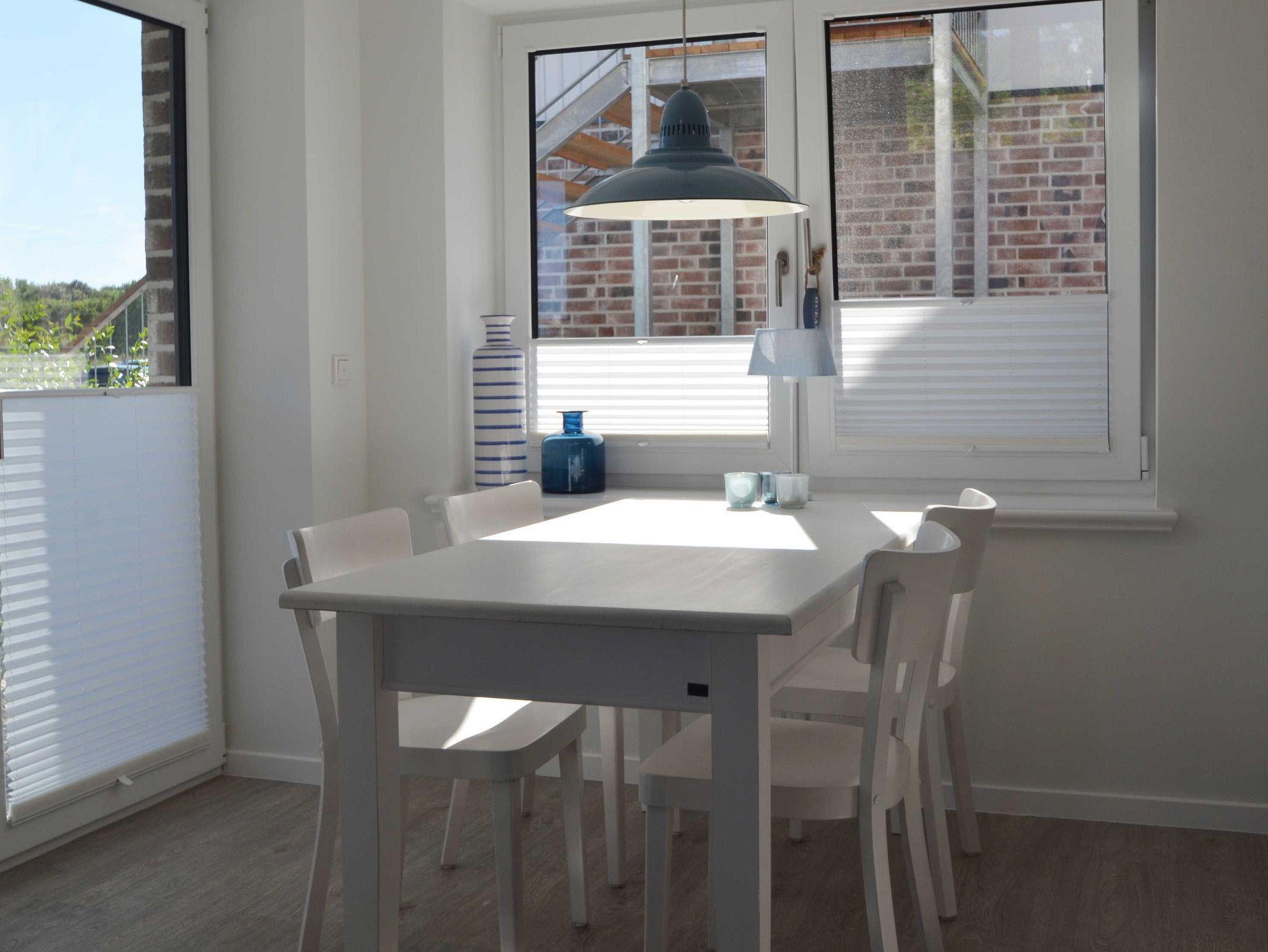 Der Bezug zur See ist in der Ferienwohnung Skagen im Erdgeschoss deutlich zu erkennen. Die Einrichtung ist im maritimen Stil in den Farben Weiß und Blau gehalten und wird durch ausgewählte Accessoires von GreenGate ergänzt.