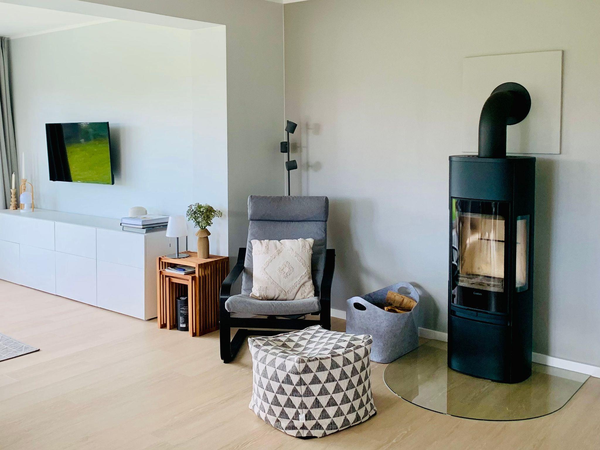 - gemütlicher Wohn- u. Essbereich mit bodentiefen Fenstern und Kaminofen