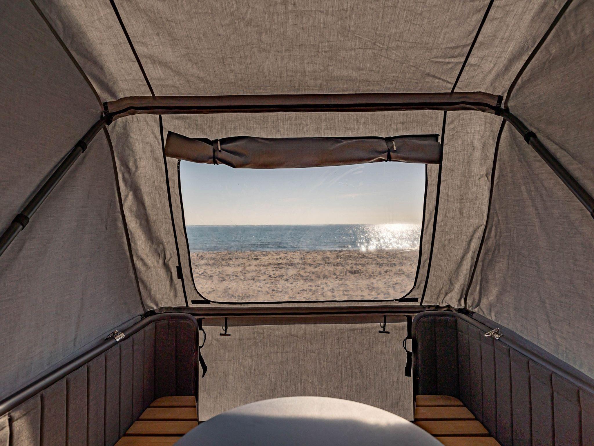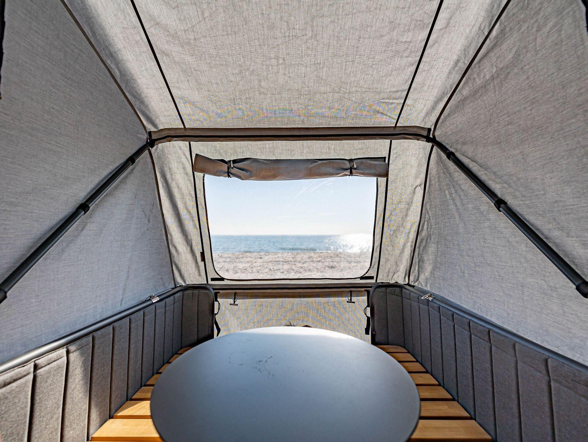 Die beiden Bullaugen rechts und links und das Sichtfenster vorne im Verdeck für Sternengucker gestatten einen weiten Ausblick auf Strand und Meer und können blickdicht verdunkelt werden.