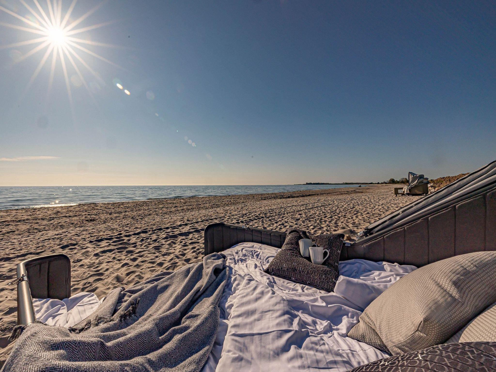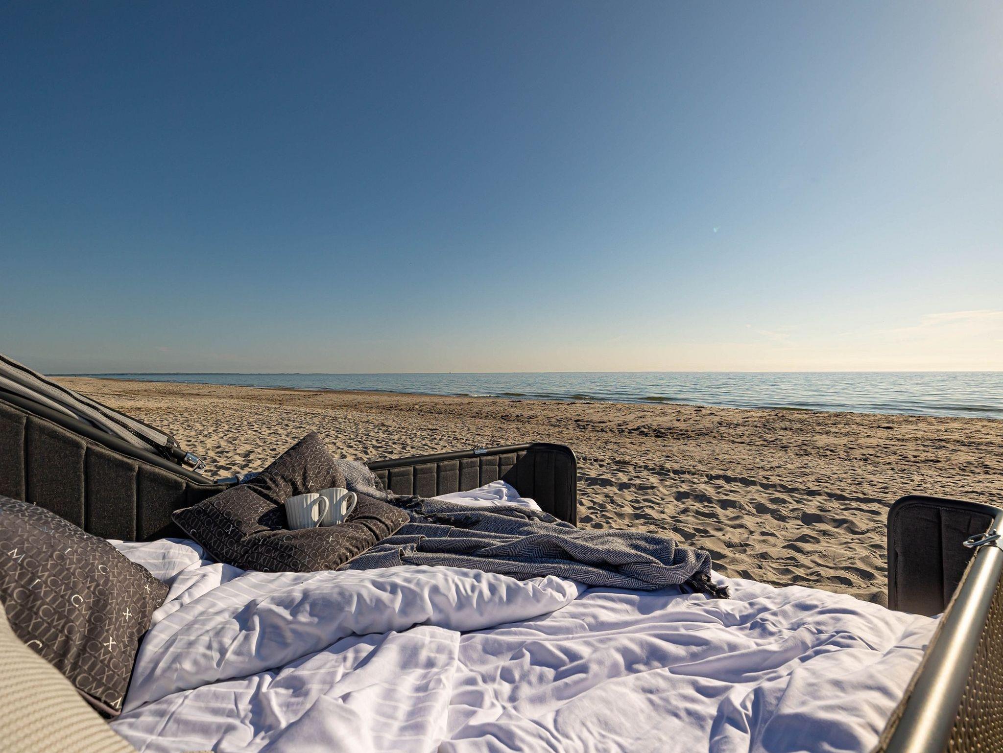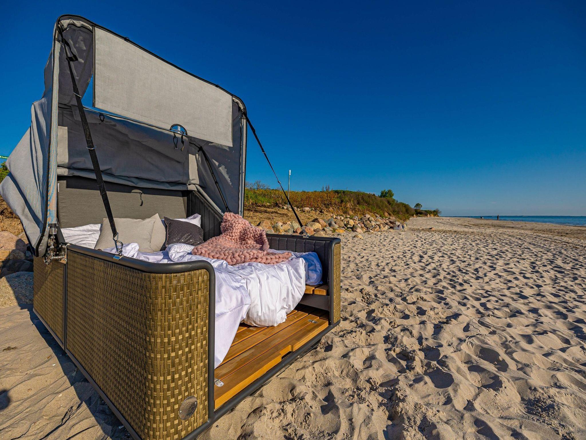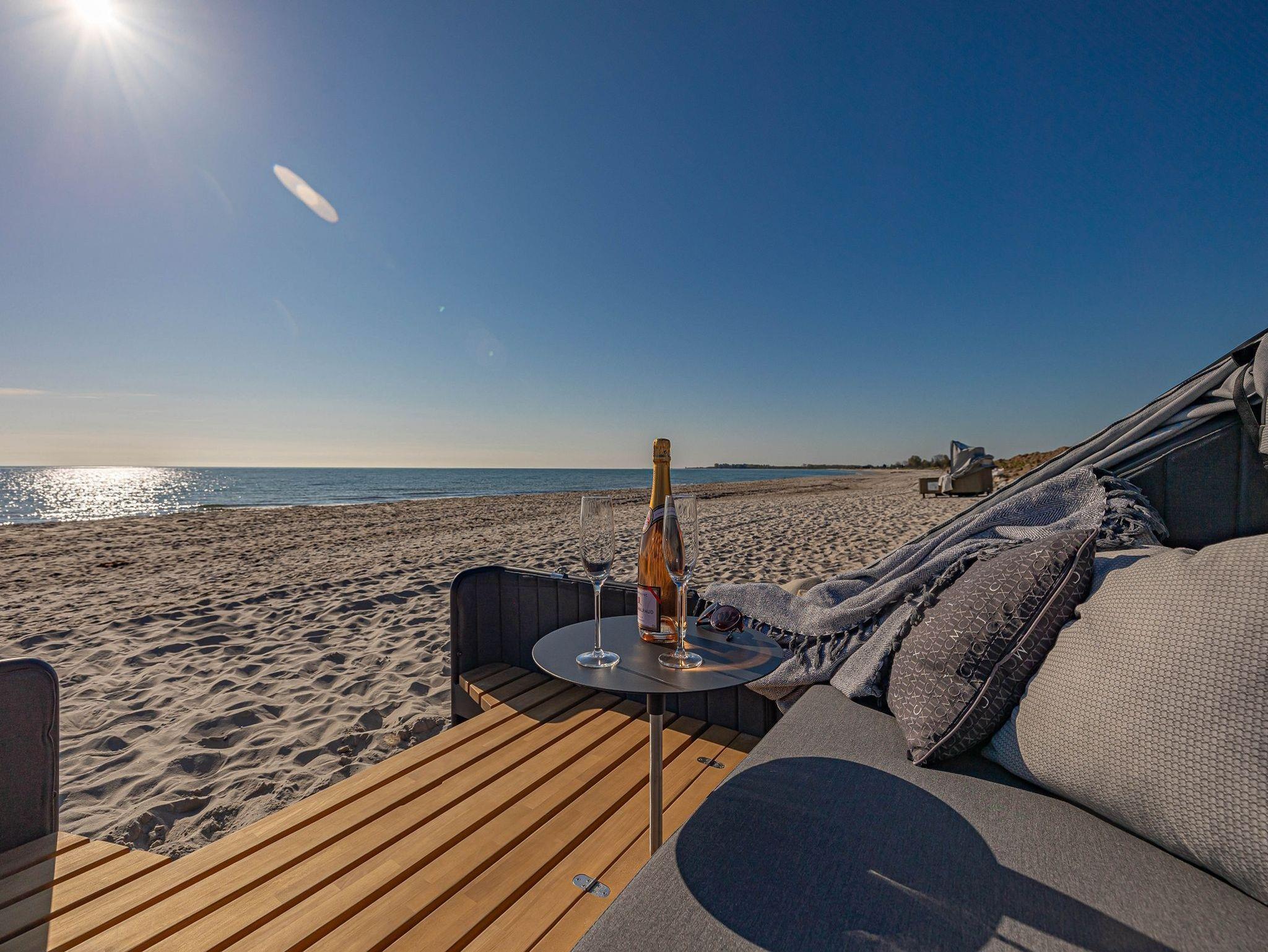 Komfort Strand Lounge zum Übernachten mit Meerblick am weiten Ostseestrand bei Wellenrauschen unter dem Sternenhimmel.