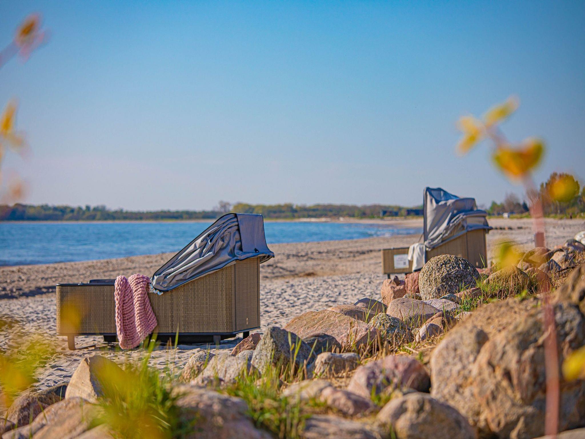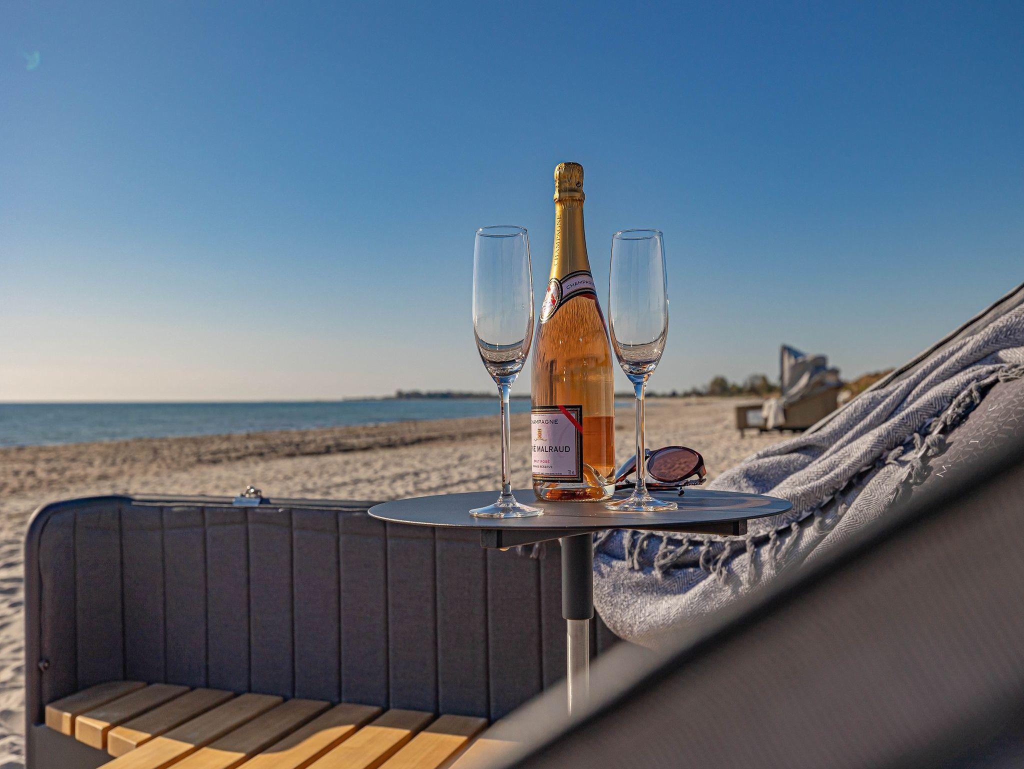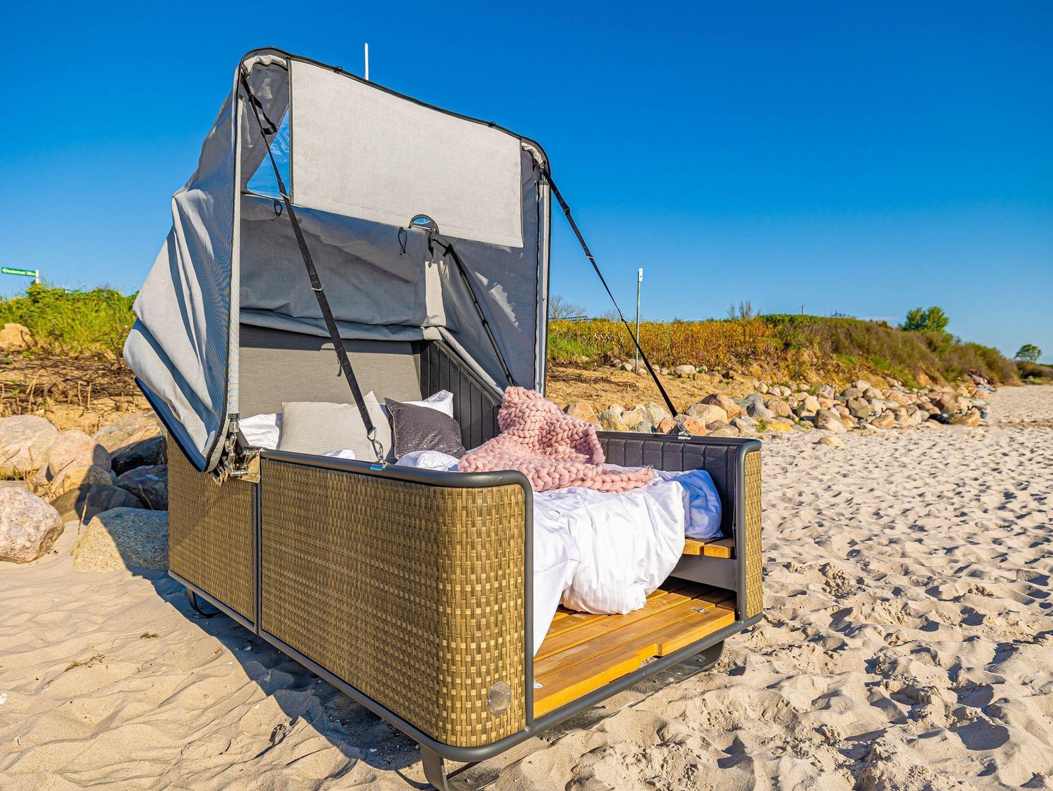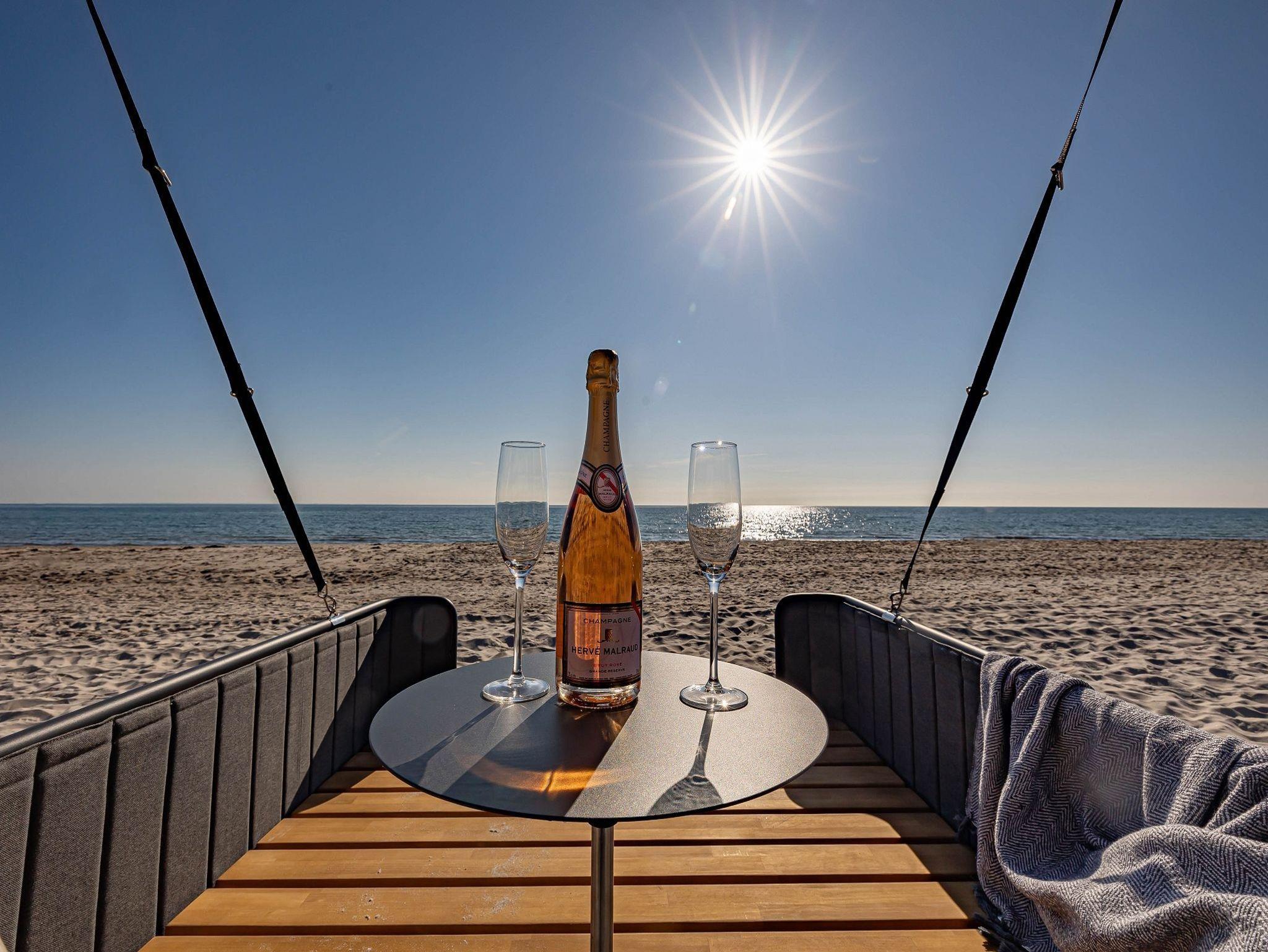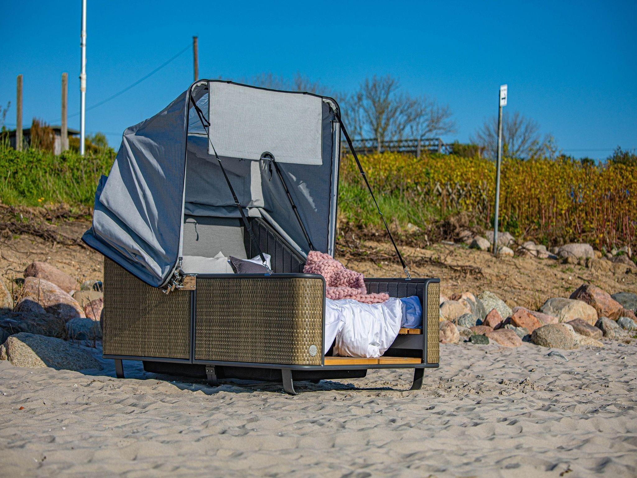 Komfort Strand Lounge zum Übernachten mit Meerblick am weiten Ostseestrand bei Wellenrauschen unter dem Sternenhimmel.