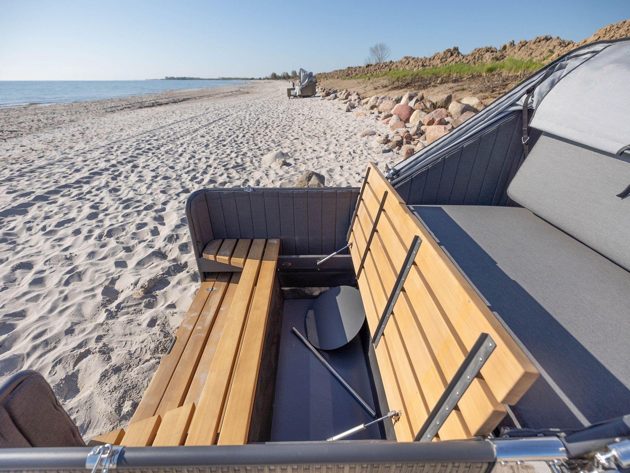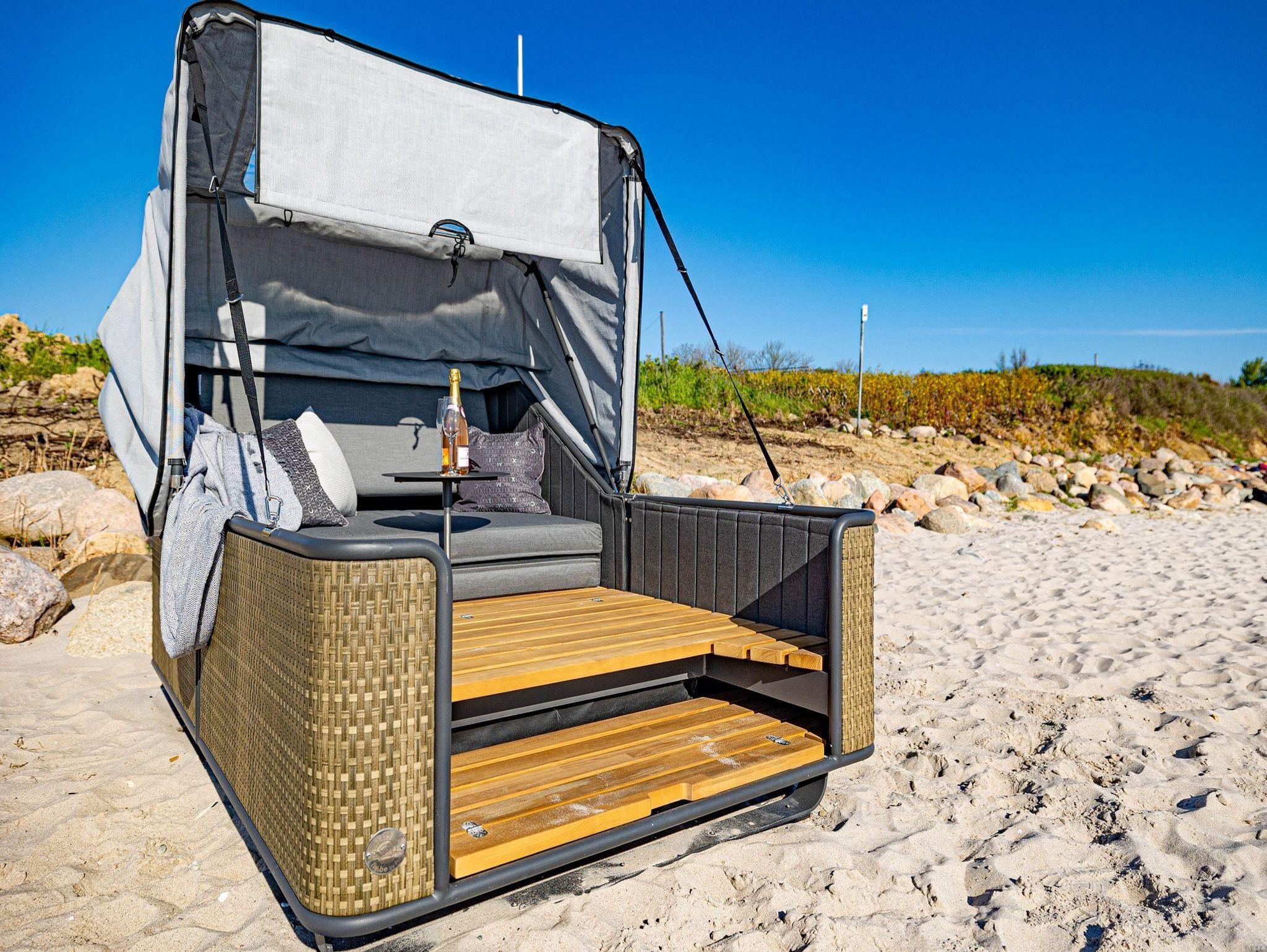 Als echtes Urlaubshighlight bietet die ca. 1,55 Meter breite und ca. 2,50 Meter lange Strand Lounge eine kleine Komfort Terrasse mit Tisch sowie kuscheligen Schlafkomfort für 1 - 2 Personen und kann je nach Sonnen-, Wind- und Blickrichtung verschoben werden.