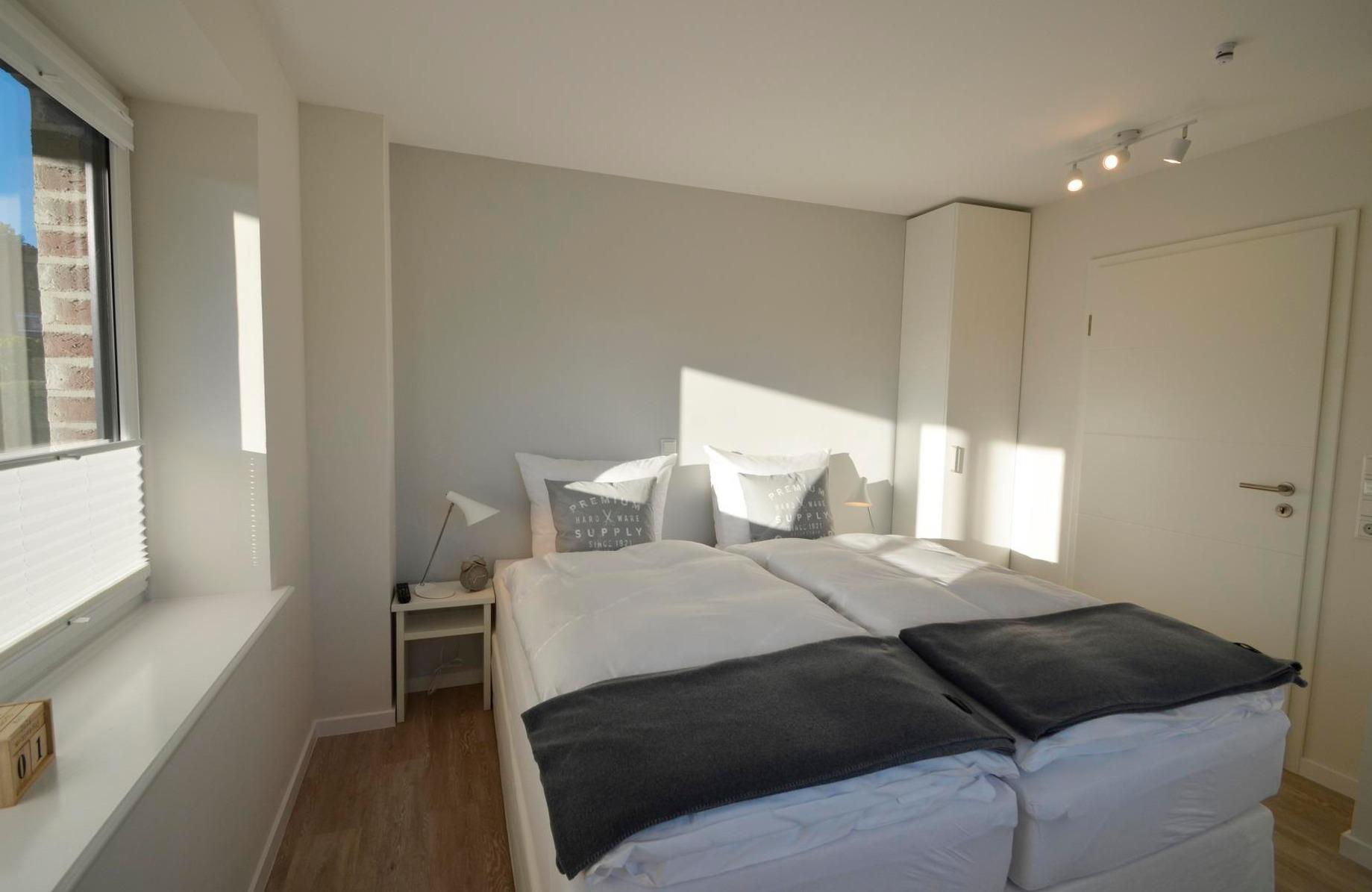 Das Schlafzimmer im Erdgeschoss ist ebenfalls in weiß/grau Tönen gehalten. Das komfortable BOXSPRINGBETT (180x200cm) und DAUNENDECKEN in ÜBERGRÖSSE (155x220cm) garantieren einen erholsamen Schlaf und VERDUNKLUNGSPLISSEES lassen auf Wunsch die Sonne draußen.