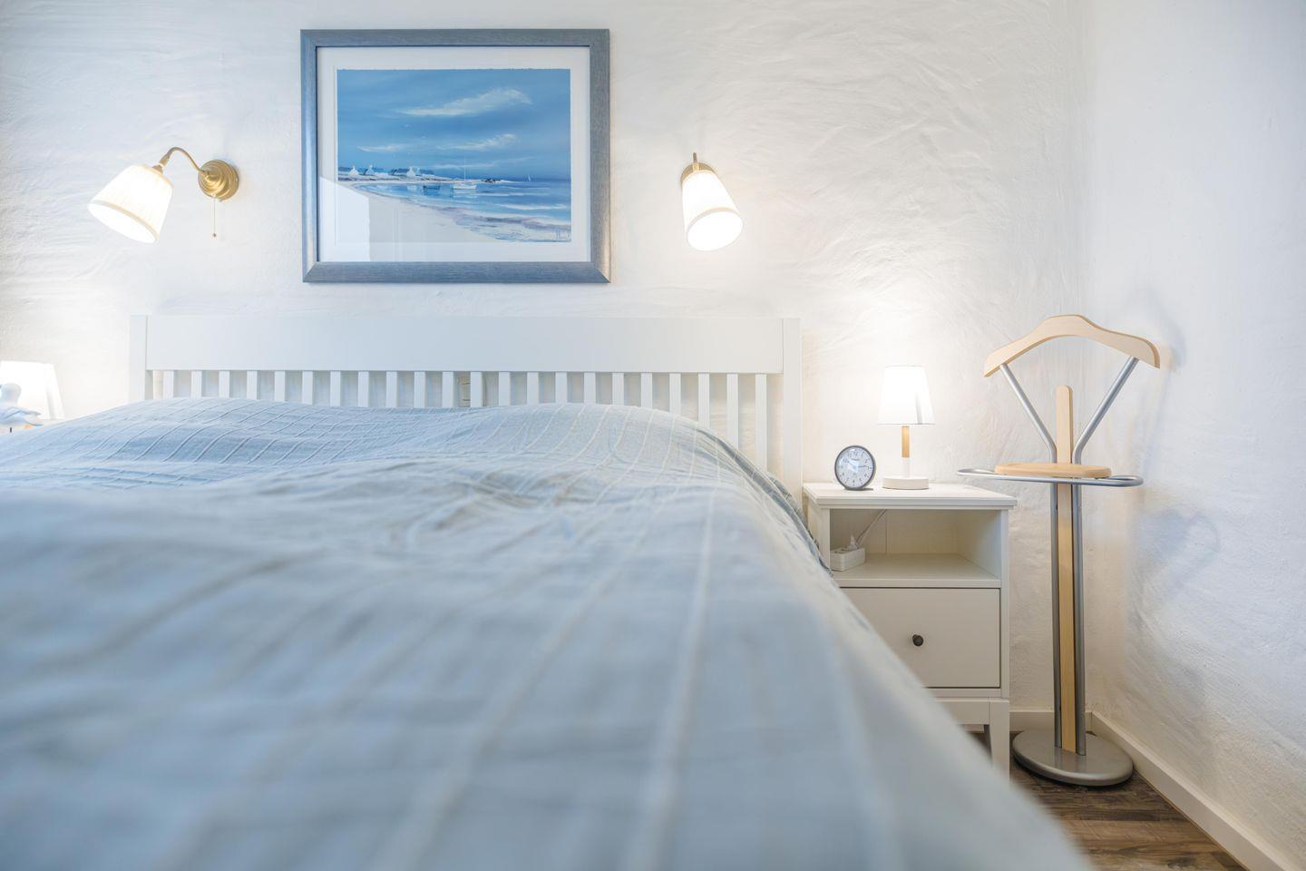 Das Schlafzimmer besteht aus einem Doppelbett (2 x 90 x 200 cm), 2 Nachttischen, einer offenen Kleider-, Regal- und Schubladenkombination mit ausreichend Platz für Ihre Urlaubsgarderobe, einer Ambienteleuchte, 2 Wand- und 2 Leselampen, Verdunkelungs-Plissées und Vorhängen sowie einem eingebauten Fliegengitter.
