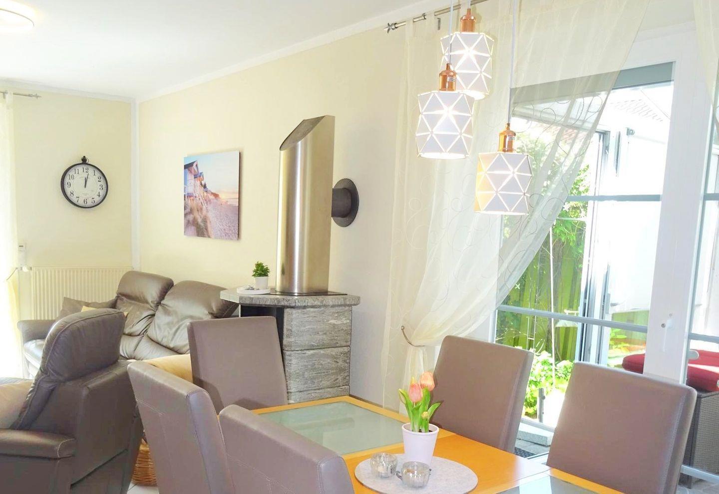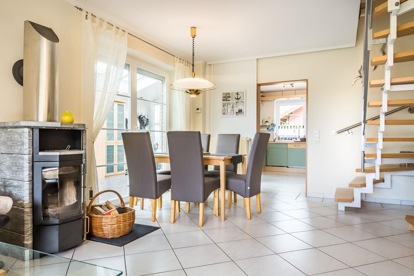 Das Ferienhaus ist für 4 Personen eingerichtet. Die Ausstattung umfasst im EG einen Wintergarten als Eingangsbereich, einen Wohn-/ Essraum mit Kaminofen und Terrassenzugang. Darüber hinaus befindet sich im EG ein Gäste-WC und eine offene Küche mit Geschirrspüler, Ceranfeld/Backofen, Mikrowelle und Kühlschrank.