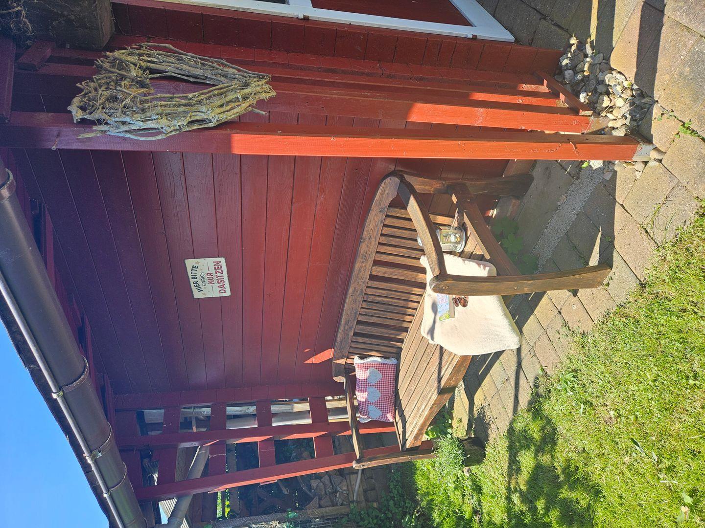 Eine sonnige Terrasse mit Gartenmöbeln, Strandkorb, Markise, Grill und Sonnenliegen garantieren Ihnen schöne Urlaubsstunden.