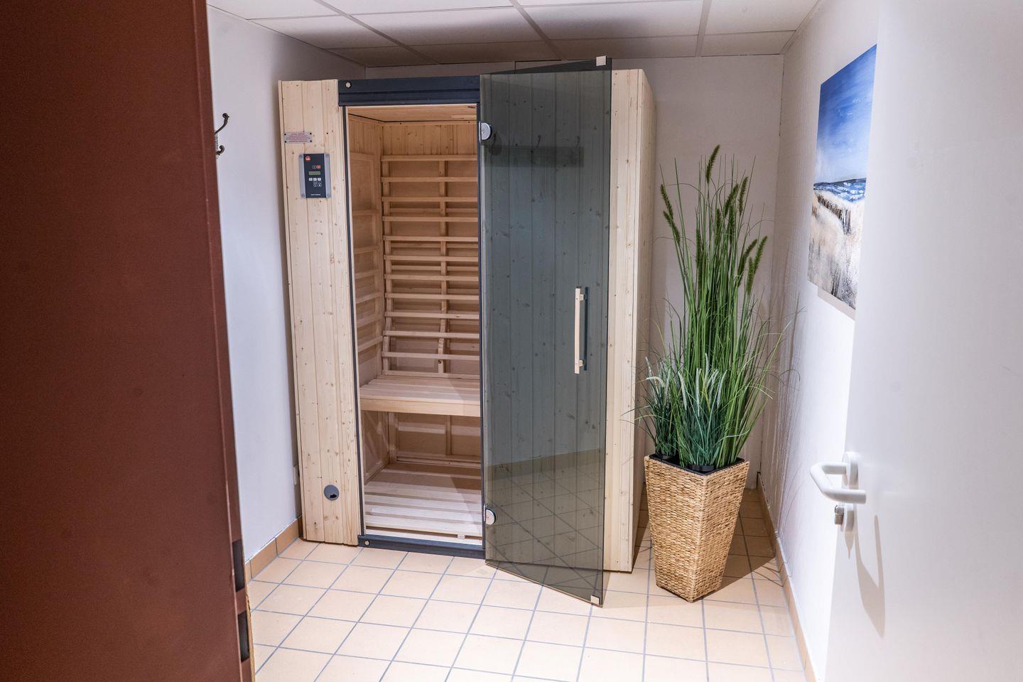Diese charmante Ferienwohnung bietet Dir einen offen gestalteten Wohnbereich mit angrenzender Küche sowie einen Balkon mit einzigartigem Meerblick. In den beiden Schlafzimmern findest Du ein Doppelbett sowie zwei Einzelbetten vor. Das helle Badezimmer verfügt über eine ebenerdige Dusche. Das Highlight ist der gemeinschaftlich genutzte Bereich mit einem innenliegenden Gemeinschaftspool, einer Gemeinschaftssauna und einem Garten mit Spielplatz.