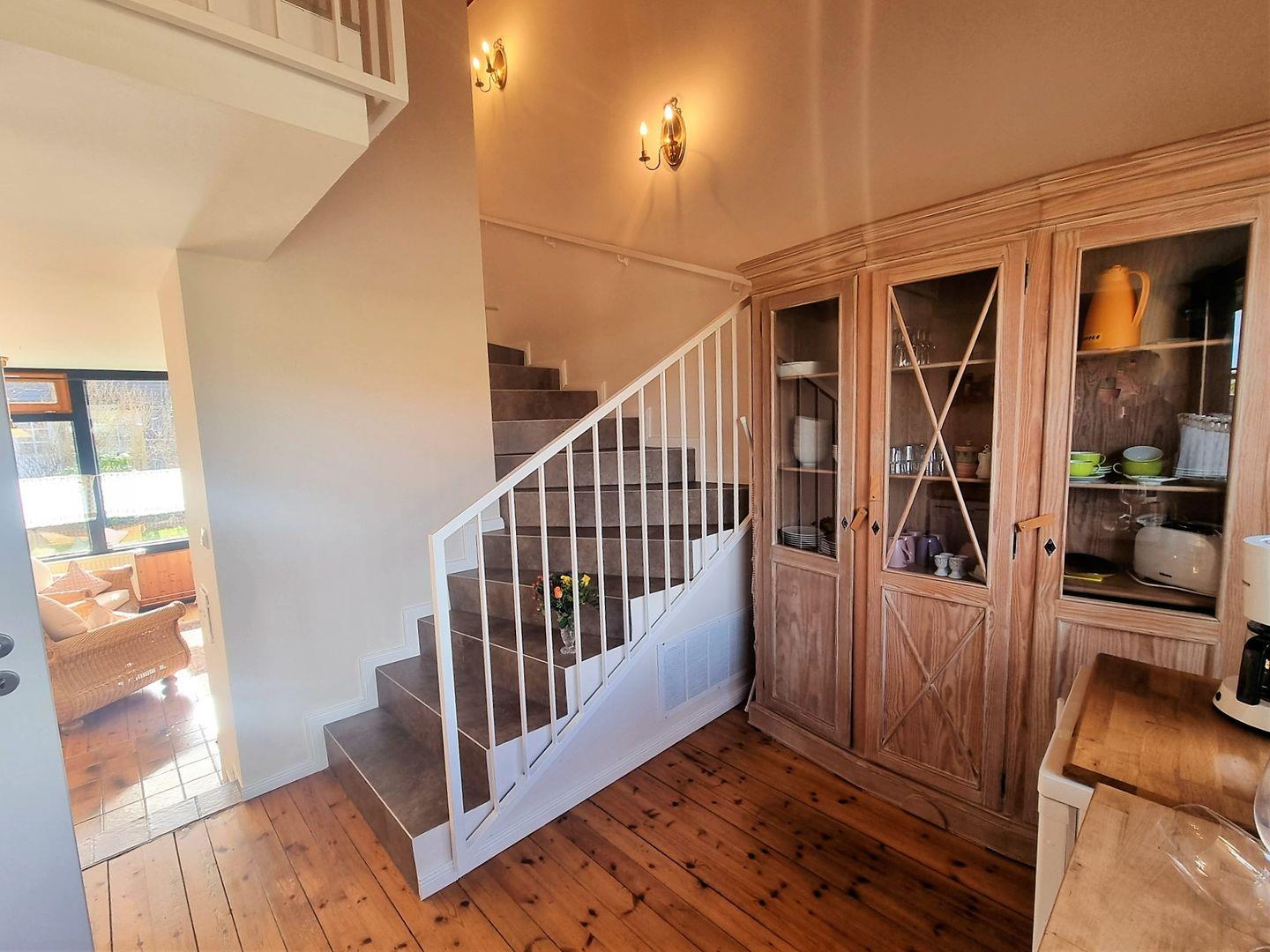 Von dort aus führt eine Treppe ins Obergeschoss, wo sich eine kleine Galerie und die beiden Schlafräume befinden.